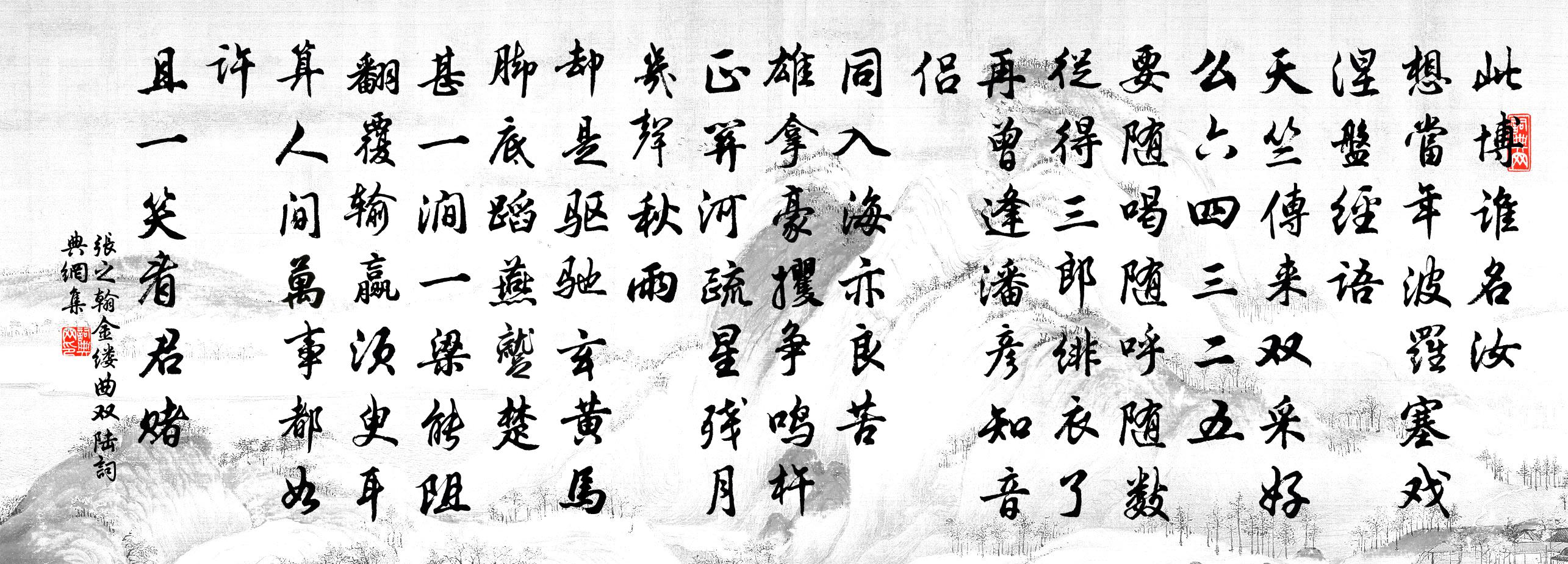 詩詞名句歷史字典書法欣賞書法字典國語詞典說文解字康熙字典古漢語字典標 題 作 者 詩 句 金縷曲 雙陸作者:張之翰 朝代:元代金縷曲 雙陸原文此博誰名汝。想當年、波羅塞戲,涅盤經語。天竺傳來雙採好,么六1|1四三二五。要隨喝、隨呼隨數。從得三郎緋衣了,再曾逢、潘彥知音侶。同入海,亦良苦。雄拿豪攫爭鳴杵。正關河、疏星殘月,幾聲秋雨。卻是驅馳玄黃馬,腳底蹈燕蹴楚。甚一澗一梁能阻。翻覆輸贏須臾耳,算人間萬事都如許。且一笑,看君賭。詩詞問答問:金縷曲 雙陸的作者是誰?答:張之翰問:金縷曲 雙陸寫於哪個朝代?答:元代問:金縷曲 雙陸是什麼體裁?答:詞張之翰金縷曲 雙陸書法欣賞金縷曲 雙陸書法作品詩詞推薦游齊山趙蕃〔宋代〕借馬訪齊山,奔行不待銜。舊來聞若渴,今日嗜如饞。故喜地殊勝,卻嫌僧近凡。誰能一除洗,更出萬嵌岩。梅開絕晚有感陸游〔宋代〕尋梅不負雪中期,醉倒猶須插一枝。莫諱衰遲殺風景,卷中今歲欠梅詩。為長溪令夢中作楊備〔宋代〕月俸蚨錢數甚微,不知從宦幾時歸。東吳一片輕波在,欲問何人買釣磯。次劉曉窗九日韻十首楊公遠〔宋代〕籬下寒花色自妍,折來泛酒更新鮮。化工底事寧多巧,鑄出黃金滿地錢。和仲實秋興牟巘五〔宋代〕金飆吹暑頓然清,聞早空庭一葉驚。拄頰偏宜對朝爽,揮毫正好賦秋聲。鏡中髯短休煩鑷,壁上弦閒不受檠。志士歐公詩有雲俸優食飽力不用官間日永睡莫興因虞儔〔宋代〕日長官事少,食飽俸錢優。宴坐香凝篆,欲眠書枕頭。莫知斯我貴,此外更何求。畢竟歸田是,他鄉莫久留。山居釋梵琮〔宋代〕老來歸隱故山深,獨抱無弦絕賞音。靜對涼風彈一曲,亂蟬聲合奏青林。長安贈王注司空圖〔唐代〕正下搜賢詔,多君獨避名。客來當意愜,花發遇歌成。樂地留高趣,權門讓後生。東方御閒駟,園外好同行。提胡慮邵定〔宋代〕擔胡慮,既不掛於寂靜之邱墟,又不浮之汗漫之江湖,又不持之騎龍雨八區,胡為喚人挈之登酒壚。桀紂以煙莽其高郵送弟遇北游劉商〔唐代〕門臨楚國舟船路,易見行人易別離。今日送君心最恨,孤帆水下又風吹。康定軍使高秘丞自襄陽農寺勾業寺丞自光化相曾鞏〔宋代〕千里分符漢上城,為僚方喜得時英。已無楚澤行吟意,便有南陽坐嘯名。驥力用來精爽緊,鵷行歸去羽翰輕。須知飲馬和城窟趙汝鐩〔宋代〕烏騅馬,紫游韁,戍夫一鞭天一方。揆程想過長城下,思古築役摧人腸。白骨如雪浸水窟,骨上猶帶秦時血。雨打蕈子楊萬里〔宋代〕空山一雨山溜急,漂流桂子松花汁。土膏松暖都滲入,蒸出蕈花團戢戢。戴穿落葉忽起立,撥開落葉百數十。蠟面荔枝香近/荔枝香陳允平〔宋代〕臉霞香銷粉薄,淚偷泫。靉靉金獸,瀋水微薰,人簾綠樹春陰,糝徑紅英風卷。芳草怨碧,王孫漸遠。錦屏夢回,詠南嶽徑松狄煥〔唐代〕一陣雨聲歸岳嶠,兩條寒色下瀟湘。客吟晚景停孤棹,僧踏清陰徹上方。題李將軍山亭郭良〔唐代〕鳳轄將軍位,龍門司隸家。衣冠為隱逸,山水作繁華。徑出重林草,池搖兩岸花。誰知貴公第,亭院有煙霞。風入松王吉昌〔元代〕乾坤爻變括天心。樞簡易浮沉。斡旋升降成甘露,種黃芽、陸地根深。瀲灩滋榮金蕊,丹霞照,萬神欽。雲收天靜江上值春雨齊己〔唐代〕江皋正月雨,平陸亦波瀾。半是峨嵋雪,重為澤國寒。農田淹浸盡,客棹往來難。愁殺騷人路,滄浪正渺漫。阮郎歸(壬辰邵武試燈夕)洪瑹〔宋代〕東風吹破藻池冰。晴光開五雲。綠情紅意兩逢迎。扶春來遠林。花艷艷,玉英英。羅衣金縷明。鬧蛾兒簇小蜻蜓。寄恪姜特立〔宋代〕忽得平安信,新知進學功。慮深心更苦,趣靜句仍工。所貴身無玷,何憂祿未豐。望雲休作念,正要爾移忠。名句推薦野曠天清無戰聲,四萬義軍同日死。杜甫《悲陳陶》 一夜東風,枕邊吹散愁多少。曾允元《點絳唇·一夜東風》 只有精忠能報國,更無樂土可為家。 * 《元旦口占用柳亞子懷人韻》 璇室群酣夜,璜溪獨釣時。劉基《題太公釣渭圖》 夢繞神州路。張元乾《賀新郎·送胡邦衡待制赴新州》 我見君來,頓覺吾廬,溪山美哉。辛棄疾《沁園春·和吳尉子似》 善惡同,則功臣倦。黃石公《三略·上略》 不忍覆余觴,臨風淚數行納蘭性德《菩薩蠻·催花未歇花奴鼓》 動莫若敬,居莫若儉,德莫若讓,事莫若咨。左丘明《國語·周語·晉羊舌肸聘周論單靖公敬儉讓咨》 初聞征雁已無蟬,百尺樓高水接天。李商隱《霜月》