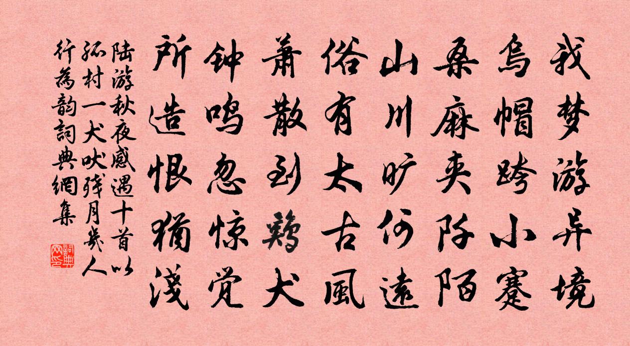 詩詞名句歷史字典書法欣賞書法字典國語詞典說文解字康熙字典古漢語字典標 題 作 者 詩 句 秋夜感遇十首以孤村一犬吠殘月幾人行為韻作者:陸游 朝代:宋代原文我夢遊異境,烏帽跨小蹇,桑麻夾阡陌,山川曠何遠!俗有太古風,蕭散到雞犬。鐘鳴忽驚覺,所造恨猶淺。詩詞問答問:《秋夜感遇十首以孤村一犬吠殘月幾人行為韻》的作者是誰?答:陸游問:該詩寫於哪個朝代?答:宋代問:陸游的名句有哪些?答:陸游名句大全書法欣賞秋夜感遇十首以孤村一犬吠殘月幾人行為韻書法作品詩詞推薦元夕邵伯溫〔宋代〕從昔遨遊盛兩川,充城人物自駢闐。萬家燈火春風陌,十里綺羅明月天。送張無夢歸天台曹谷〔宋代〕幾載仙山下,無機世莫分。因為天市客,方識帝鄉雲。鍊氣壺中見,還元海內聞。名高赤城洞,歌賜紫皇君。步逐偈頌七十六首釋子益〔宋代〕名不得,狀不得。脫胎換骨方,起死回生訣。信得及底,不消一服,諸病頓除,脫體安樂。何必善財重採藥。生查子·獨游西岩辛棄疾〔宋代〕青山招不來,偃蹇誰憐汝?歲晚太寒生,喚我溪邊住。山頭明月來,本在天高處。夜夜入青溪,聽讀《離騷》去。瓮圃新霽方回〔宋代〕小園秋霽勝春暉,雨過林端葉未稀。紅錦芙蓉應萬萼,雪衣蝴蝶忽雙飛。刀耕舊業聊從俗,瓮汲餘生永息機。天與水輪詠梅堯臣〔宋代〕孤輪運寒水,無乃農者營。隨流轉自速,居高還復傾。利才畎澮間,功欲霖雨並。不學假混沌,亡機抱瓮罌。游道場山次沈國錄韻張栻〔宋代〕玻瓈盆外起千鬟,路入空濛紫翠間。心遠最便天宇迥,眼明偏見野雲閒。寒泉宰木留千載,清磬疎鍾度兩山。我亦頌古五十七首釋道昌〔宋代〕巨岳塵飛,蟭螟生兒。兒落塵里,如錐錐泥。澆火救火,閉門開門。拋柴家醜外頭見,萬象森羅一口吞。即席次必強六絕句李新〔宋代〕夾道紅英碎纈鞍,文園春滿帶圍寬。雙輪不解生方角,只作繁城數日歡。季春八日喜雨答李都官宋祁〔宋代〕夜魄花離星舍,花春膏浹大花田。乍迷榆塞樹,徐暗柳營天。沼滴銀波盪,階嗚玉綆聯。餘萌催沃土,殘魃趣沈淵春秋戰國門鬻拳周曇〔唐代〕鬻拳強諫懼威刑,退省懷慚不顧生。雙刖忍行留痛恨,惟君適足見忠誠。盧灘雜興五首錢時〔宋代〕蛙聲兩岸夾溪流,漫漫澄潭夜進舟。火照寒沙翻作白,直疑浮雪滿汀洲。四怨三愁五情詩十二首。四情曹鄴〔唐代〕檳榔自無柯,椰葉自無陰。常羨庭邊竹,生筍高於林。送楊皋擢第歸江東(一作送表丈楊皞)李端〔唐代〕隋堤望楚國,江上一歸人。綠氣千檣暮,青風萬里春。試才初得桂,泊渚肯傷蘋。拜手終悽愴,恭承中外親。買烏薪戲題姜特立〔宋代〕雨雪冬春無了時,烏薪斷續惱衰羸。偶然買得婆歡喜,且免山翁曉皺眉。郊廟朝會歌辭建隆乾德朝會樂章二十八首佚名〔宋代〕蠢茲淮海師,保據毒黎苗。不悟龍興漢,獨同犬吠堯。六師方雨施,孤壘自冰消。千載逢嘉運,華夷奉聖朝。次韻程弟方岳〔宋代〕此腹寧須文字香,漫淹虀瓮半青黃。午窗一枕齁齁睡,世上何人最得忙。題畢少董翻經圖范成大〔宋代〕絳帳胡沙暗,青編古意深。誰知洛下詠,中有越人吟。與羅隱之聯句鄭遨〔唐代〕一壺天上有名物,兩個世間無事人。 ——鄭遨醉卻隱之雲叟外,不知何處是天真。 ——羅隱之大水後城中壞廬舍千餘作詩自咎梅堯臣〔宋代〕不如無道國,而水冒城郭。豈敢問天災,但慚為政惡。湍回萬瓦裂,槎向千林閣。獨此懷百憂,思歸臥雲壑。名句推薦宿草春風又,新阡去歲無。楊萬里《寒食上冢》 風急天高猿嘯哀,渚清沙白鳥飛回。杜甫《登高》 時光只解催人老,不信多情,長恨離亭,淚滴春衫酒易醒。晏殊《採桑子·時光只解催人老》 焉有君子而可以貨取乎?孟子《孟子·公孫丑章句下·第三節》 萬里妾心愁更苦,十春和淚看嬋娟。華清淑《望江南·燕塞雪》 策馬自沙漠,長驅登塞垣。高適《薊中作》 山遠近,路橫斜,青旗沽酒有人家。辛棄疾《鷓鴣天·陌上柔桑破嫩芽》 悲莫悲生離別,樂莫樂新相識,兒女古今情。辛棄疾《水調歌頭·壬子三山被召陳端仁給事飲餞席上作》 春風對青冢,白日落梁州。張喬《書邊事》 一郡官閒唯副使,一年冷節是清明。王禹偁《清明日獨酌》