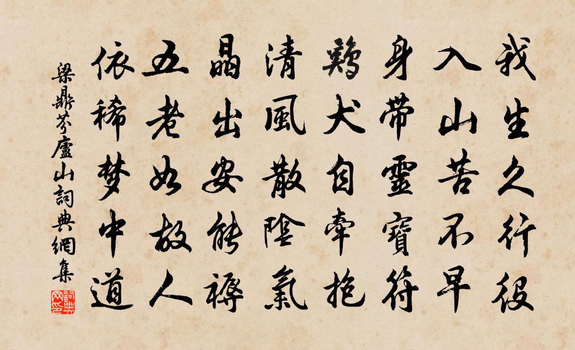 詩詞名句歷史字典書法欣賞書法字典國語詞典說文解字康熙字典古漢語字典標 題 作 者 詩 句 廬山作者:梁鼎芬 朝代:清代廬山原文我生久行役,入山苦不早。身帶靈寶符,雞犬自牽抱。清風散陰氣,晶出安能褥。五老如故人,依稀夢中道。詩詞問答問:廬山的作者是誰?答:梁鼎芬問:廬山寫於哪個朝代?答:清代梁鼎芬廬山書法欣賞廬山書法作品詩詞推薦感懷劉長卿〔唐代〕秋風落葉正堪悲, * 殘花欲待誰。水近偏逢寒氣早,山深常見日光遲。愁中卜命看周易,夢裡招魂讀楚詞。自笑題清遠峽和光洞安昌期〔宋代〕蕙帳將辭去,猨猱不忍啼。琴書自為樂,朋友孰相攜。丹灶非無藥,青雲別有梯。峽山余暫隱,人莫擬夷齊。野步方岳〔宋代〕秋風欲下題詩葉,午枕初醒破悶茶。六七里行溪詰曲,二三子共酒讙嘩。乾坤何似一傳舍,日月不停以轉車。富貴贈孤山周道士賈似道〔宋代〕梅花和靖宅,此處住來清。肯以詩為事,終於世有名。山空丹鶴老,湖淨白鷗明。時亦扶筇出,何曾踏帝城。崔鎮驛文天祥〔宋代〕萬里中原役,北風天正涼。黃沙漫道路,蒼耳滿衣裳。野闊人聲小,日斜駒影長。解鞍身似夢,遊子意茫茫。得山中道友書寄苗錢二員外李端〔唐代〕有謀皆轗軻,非病亦遲回。壯志年年減,馳暉日日催。還山不及伴,到闕又無媒。高臥成長策,微官稱下才。詩人噴玉泉冥會詩八首四丈夫同賦李玖〔唐代〕鳥啼鶯語思何窮,一世榮華一夢中。李固有冤藏蠹簡,鄧攸無子續清風。文章高韻傳流水,絲管遺音托草蟲。春月送黃同甫周弼〔宋代〕人生各有安,出易欲歸難。古道春泥重,孤城暮雪寒。酒鋒精似將,詩業遠於官。野谷如堪飽,從君借鶡冠。殘句旅雁何時更著行蘇軾〔宋代〕旅雁何時更著行。秋獵孟諸夜歸置酒單父東樓觀妓李白〔唐代〕傾暉速短炬,走海無停川。冀餐圓丘草,欲以還頹年。此事不可得,微生若浮煙。駿發跨名駒,雕弓控鳴弦。鷹豪江行夜宿龍吼灘,臨眺思峨眉隱者,兼寄幕中諸公岑參〔唐代〕官舍臨江口,灘聲人慣聞。水煙晴吐月,山火夜燒雲。且欲尋方士,無心戀使君。異鄉何可住,況復久離群。哀韓君表無文編晁說之〔宋代〕少師名德振鵷鸞,孫子何為短羽翰。不使功名藏竹間,宜留文字後人看。六丁取去嗟韓第,七子亡來恨建安。賴有游真陽石室祖無擇〔宋代〕昔讀到難篇,乃聞真陽室,亦嘗惟斯人,稱道或浮實。邈在數千里,莫覿煙霞質。青山有獨往,吾志久已必。如何九張機佚名〔宋代〕三張機。吳蠶已老燕雛飛。東風宴罷長洲苑,輕綃催趁,館娃宮女,要換舞時衣。送狄明府赴九江李頻〔唐代〕字人修祖德,清白定聞傳。匹馬從秦去,孤帆入楚懸。關中寒食雨,湖上暑衣天。四考兼重請,相知住幾年。懷借舟主人袁說友〔宋代〕自憐五十鬢如絲,更把閒身與物馳。惟有高人收倦翼,世間萬事一彈棋。句徐遜綿〔宋代〕士死惟留姓與名。句幸夤遜〔唐代〕寒艷芳姿色盡明。送周子充左史奉祠歸廬陵范成大〔宋代〕黃鵠飄然下九關,江船載月客俱還。名高豈是孤臣願,身退聊開壯十顏。傾蓋當年真旦暮,沾巾明日有河山。後期自況三首邵雍〔宋代〕名利場中難著腳,林泉路上早回頭。不然半百殘軀體,正被風波汩未休。名句推薦強欲登高去,無人送酒來。岑參《行軍九日思長安故園》 小娃撐小艇,偷采白蓮回。白居易《池上》 登車宿遷北,萬頃鋪瓊田。陸文圭《宿遷道中遇雪》 人之忌,在好為人師。孟子《孟子·離婁章句上·第二十三節》 從別後,憶相逢,幾回魂夢與君同。晏幾道《鷓鴣天·彩袖殷勤捧玉鍾》 已過才追問,相看是故人。吳偉業《遇舊友》 晨必盥,兼漱口。便溺回,輒淨手。李毓秀《弟子規·謹》 兒女此情同。往事朦朧。湘娥竹上淚痕濃。辛棄疾《浪淘沙·賦虞美人草》 庭前生瑞草,好事不如無。佚名《增廣賢文·上集》 儒者在本朝則美政,在下位則美俗。荀子《荀子·儒效》