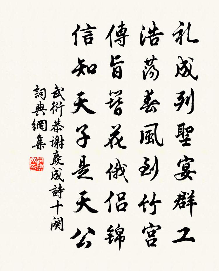 詩詞名句歷史字典書法欣賞書法字典國語詞典說文解字康熙字典古漢語字典標 題 作 者 詩 句 恭謝慶成詩十闋作者:武衍 朝代:宋代恭謝慶成詩十闋原文禮成列聖宴群工,浩蕩春風到竹宮。傳旨簪花俄侶錦,信知天子是天公。詩詞問答問:恭謝慶成詩十闋的作者是誰?答:武衍問:恭謝慶成詩十闋寫於哪個朝代?答:宋代武衍恭謝慶成詩十闋書法欣賞恭謝慶成詩十闋書法作品詩詞推薦趙山甫使君為所部七十老叟記顏索贊周必大〔宋代〕元亮無適俗韻,醉中強釋形神。置我青原台上,不勞半道邀迎。述懷何宏中〔宋代〕馬革盛屍每恨遲,西山餓踣更何辭。姓名不到中興歷,付與皇天后土知。玉樓春毛滂〔宋代〕我公兩器兼文武。談笑岩廊無治古。紅顏綠髮已官高,赤舄繡裳今仲父。我欲形容無妙語。頌穆清風須吉甫。望公同段吉甫汎湖仇遠〔宋代〕西湖春碧淨無泥,畫舫朱簾傍岸移。寒食清明初過後,杏花楊柳乍晴時。後從西日催歌鼓,莫放東風轉酒旗。只恐和王給事同諸官留題林逋〔宋代〕千兵款戶迂紅旆,四壁留題拂紫苔。他日北山傳故事,願將猿鶴比雲來。書禪靜寺集翠堂示堂中老人琳徑山詩毛滂〔宋代〕煙岫供寒翠,風簾舞小晴。短牆分竹色,虛戶納松聲。弄筆雲窗暖,煎茶玉醴輕。端知孤檜月,獨伴夜禪清。滿江紅陳三聘〔宋代〕天豈無情,天若道、有情亦老。功名事、問天因甚,蒙人不了。好伴雲煙耕谷口,休將翰墨傳江表。算鬢邊、能得送無相和尚歸鄉釋師範〔宋代〕同名同號同桑梓,同住江湖亡彼此。有時同上孤峰巔,有時同下滄溟底。苦同憂,樂同喜,金博金兮水洗水。有時冬至程大昌〔宋代〕世間剝復每相乘,此理几几喚得譍。萬木凍僵梅有信,黃河冰合井如蒸。和諸葛元亮韻辛棄疾〔宋代〕偊泛清溪李郭船,路旁人已羨登仙。看君不似南陽臥,只似喔詩孟浩然。京口江亭周翼之〔宋代〕不忍憑闌久,邊愁隨望生。如何萬馬壯,不比一江橫。落日明金嶼,高風撼鐵城。寒濤觸沙渚,天意苦難平。答文與可以六言詩相示因道濟南事作十首蘇轍〔宋代〕佳句近參風雅,微詞間發離騷。竊欲比君庾信,莫年詩賦尤高。野步齊己〔唐代〕城裡無閒處,卻尋城外行。田園經雨水,鄉國憶桑耕。傍澗蕨薇老,隔村岡隴橫。何窮此心興,時復鷓鴣聲。定風波王哲〔元代〕昔日嘉山第一程。今朝臣海載清清。重泛瑤池真得得,盈盈。昂頭堪認自家聲。玉浪銀波別景致,瓊濤朱溜作高名喜雨劉過〔宋代〕北方旱氣與兵連,猶恐淮州亦蔓延。數日下田新雨足,不應千里不同天。禪人並化主寫真求贊釋正覺〔宋代〕清若松篁雪,虛明河漢秋。深心老節歲寒事,穩放胡床默默游。老君洞陸游〔宋代〕丹鳳樓頭語未終,崎嶇蜀道復相逢。太清宮闕俱煨燼,豈亦南來避賊鋒?句元絳〔宋代〕英翰五五出南閩。太師中書令魏國公冊贈尚書令追封真定王趙挽王禹偁〔宋代〕麟喪虛靈囿,鳳衰空帝梧。陶熔存庶匯,霖雨潤寰區。舊疏同伊訓,遺章入禹謨。九原何所恨,猶未滅匈奴。送唐介南遷五首謝景初〔宋代〕諫逐古今有,例為朝政疵。況與廊廟臣,世復惡其私。安危治亂跡,此事姑置之。儻未監謗者,失得何須悲。名句推薦遊子乍聞征袖濕,佳人才唱翠眉低。鄭谷《鷓鴣》 君子不蔽人之美,不言人之惡。韓非及後人《韓非子·內儲說上七術》 處事要代人作想,讀書須切己用功。王永彬《圍爐夜話·第五則》 想文君望久,倚竹愁生步羅襪。姜夔《八歸·湘中送胡德華》 羅幕輕寒,燕子雙飛去。晏殊《蝶戀花·檻菊愁煙蘭泣露》 話須通俗方傳遠,語必關風始動人。馮夢龍《警世通言·卷十二》 夫天地者,萬物之逆旅也;光陰者,百代之過客也。李白《春夜宴桃李園序 / 春夜宴從弟桃花園序》 君子戒慎乎其所不睹,恐懼乎其所不聞。子思《中庸·第一章》 人生自是有情痴,此恨不關風與月。歐陽修《玉樓春·尊前擬把歸期說》 平岡細草鳴黃犢,斜日寒林點暮鴉。辛棄疾《鷓鴣天·陌上柔桑破嫩芽》