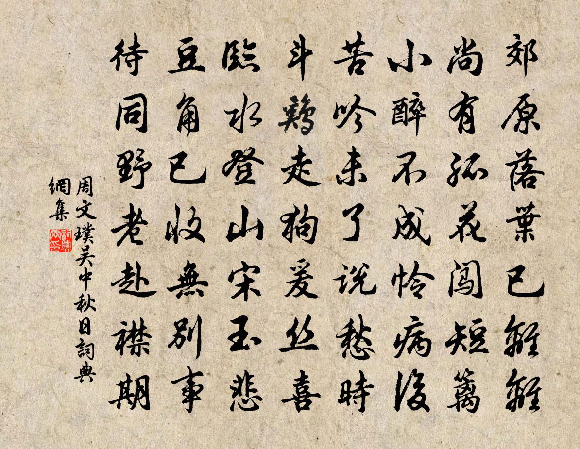 詩詞名句歷史字典書法欣賞書法字典國語詞典說文解字康熙字典古漢語字典標 題 作 者 詩 句 吳中秋日作者:周文璞 朝代:宋代吳中秋日原文郊原落葉已離離,尚有孤花闖短籬。小醉不成憐病後,苦吟未了說愁時。鬥雞走狗爰絲喜,臨水登山宋玉悲。豆角已收無別事,待同野老赴襟期。詩詞問答問:吳中秋日的作者是誰?答:周文璞問:吳中秋日寫於哪個朝代?答:宋代周文璞吳中秋日書法欣賞吳中秋日書法作品詩詞推薦崇德道中張鎡〔宋代〕羊蹄根老漫溪潯,灰蝶閒飛興亦深。春色醉人勝似酒,覓詩天氣要微陰。詩一首張珍奴〔宋代〕逢師許多時,不說些兒個。及至如今悶,損我援筆末。緣識宋太宗〔宋代〕智使千般用,思量也大愚。黃昏直至曉,皎日瑩康衢。瑞典通三界,華胥樂四隅。諭開方便治,平坦絕崎嶇。請息齋書事范成大〔宋代〕刻木牽絲罷戲場,祭余雨後兩相忘。門雖有雀尚廷尉,食已無魚休孟嘗。虱里趨時真是賊,虎中宣力任為倀。籬東減字浣溪沙(十五之十一)賀鑄〔宋代〕青翰舟中祓禊筵。粉娥窺影兩神仙。酒闌飛去作非煙。重訪舊遊人不見,雨荷風蓼夕陽天。折花臨水思茫然。五月二十三夜記夢陸游〔宋代〕夜漏欲盡雞初唱,夢到神仙信非妄。泉流直舂碧澗底,松根橫走蒼崖上。徐行林際遇飛橋,峭壁驚濤臨萬丈,非惟潼關河亭薛逢〔唐代〕重崗如抱岳如蹲,屈曲秦川勢自尊。天地並功開帝宅,山河相湊束龍門。櫓聲嘔軋中流度,柳色微茫遠岸村。滿眼丹陽湖阻風二首王之道〔宋代〕老去心猶壯,詩成喜欲顛。時危思報主,窮極待呼天。歸夢先湖外,離情到酒邊。晚來風更惡,舟臥不成眠。重憶一首李白〔唐代〕欲向江東去,定將誰舉杯。稽山無賀老,卻棹酒船回。王夢得捕蝗二首章甫〔宋代〕江頭曉日方曈曈,僕夫喘汗天無風。茅檐汲井洗塵土,野寺煮餅燒油蔥。平生憂國寸心赤,在處喔詩雙鬢蓬。村民覆舟山曾極〔宋代〕六代興亡貉一丘,繁華夢逐水東流。操蛇神向山前笑,三百年前幾度舟。遙夜宋庠〔宋代〕夜夕更籌永,霜飛歲籥空。斗杓常記候,蟾暈豫知風。過雁驚流弋,衰螢戀故叢。可堪鄉思發,夢繞免園東。首尾吟邵雍〔宋代〕堯夫非是愛吟詩,詩是堯夫難老時。齒暮乍逢新歲月,眼明初見舊親知。歡情此去未伏減,飲量近來差覺低。六十有感王珪〔唐代〕聞笛更懷舊,望鴻難寄音。西風行客淚,明月故人心。離恨江波闊,歸期歲景深。何時紫溪隱,尊酒起狂吟。陳天成詩多和東坡韻茲因寄喜雨詩走筆謝之樓鑰〔宋代〕一春垂垂困多雨,雖曰如膏反成苦。自知潦後必成旱,果見晴天雨黃土。連旬不雨已嘆嗟,滌滌山川雲不吐。未聞漫感龔自珍〔清代〕絕域從軍計惘然,東南幽恨滿詞箋。一簫一劍平生意,負盡狂名十五年。漁父/漁歌子陸游〔宋代〕晴山滴翠水挼藍。聚散漁舟兩復三。橫埭北,斷橋南。側起船篷便作帆。中秋文天祥〔宋代〕不教收骨瘴江邊,驅向胡沙著去鞭。舊奪宮袍空獨步,新食宮飯飽孤眠。客程恰與秋天半,人影何如月倍圓。猶是暑中客懷董嗣杲〔宋代〕飄蓬於此趣何迂,破卻牢愁是酒壺。世上利名休羨有,胸中丘壑不應無。秋侵客鬢從添白,春滿侯門亦謾朱。無地黃兵部生辰仲並〔宋代〕早歲蜚聲應宿郎,至今雞舌尚含香。未應駟馬夸流俗,只為慈親樂故鄉。名句推薦花隱掖垣暮,啾啾棲鳥過。杜甫《春宿左省》 知君仙骨無寒暑。蘇軾《木蘭花令·次馬中玉韻》 強國戰兵,霸國戰智,王國戰義,帝國戰德,皇國戰無為。王通《中說·卷五·問易篇》 松雪飄寒,嶺雲吹凍,紅破數椒春淺。周密《獻仙音·吊雪香亭梅》 志士不忘在溝壑,勇士不忘喪其元。孟子《孟子·滕文公章句下·第一節》 掩妾淚,聽君歌。李白《夜坐吟》 里仁為美,擇不處仁,焉得知?孔子弟子《論語·里仁篇》 雖慚老圃秋容淡,且看黃花晚節香。韓琦《九日水閣》 少婦今春意,良人昨夜情。沈佺期《雜詩三首·其三》 揉藍衫子杏黃裙,獨倚玉闌無語點檀唇。秦觀《南歌子·香墨彎彎畫》