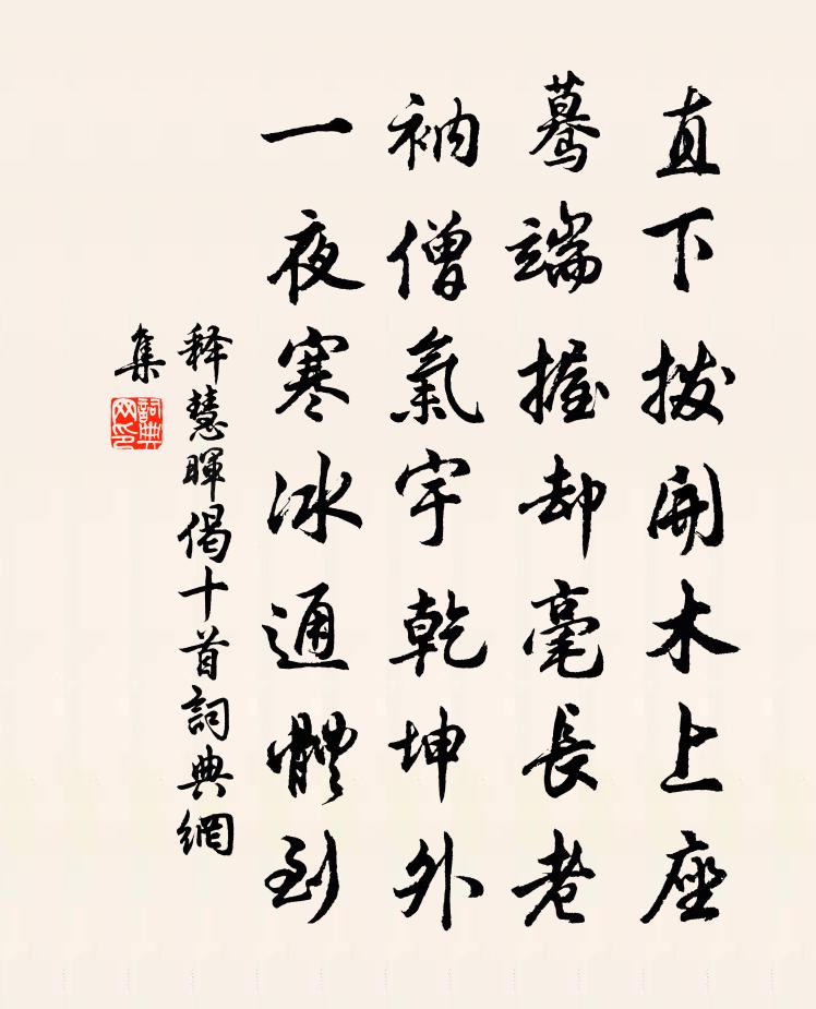 詩詞名句歷史字典書法欣賞書法字典國語詞典說文解字康熙字典古漢語字典標 題 作 者 詩 句 偈十首作者:釋慧暉 朝代:宋代偈十首原文直下撥開木上座,驀端握卻毫長老。衲僧氣宇乾坤外,一夜寒冰通體到。詩詞問答問:偈十首的作者是誰?答:釋慧暉問:偈十首寫於哪個朝代?答:宋代釋慧暉偈十首書法欣賞偈十首書法作品詩詞推薦句張耒〔宋代〕淮山二十里,秀色已在戶。舟車走梁宋,煙樹引吳楚。古意十四首章雲心〔宋代〕谷風扇春和,卉木皆敷芬。貞松但如故,高標在煙雲。君子守常性,時榮非所欣。亦有孤鳳皇,不與眾鳥群。客舍久雨無酒戲柬沈泰叔陳棣〔宋代〕秋來濘淖幾曾乾,旅邸盤旋尋丈間。擬仗神功擊陽石,卻疑天漏類陰山。已甘從事經年別,未放管城終日閒。欲課寄劉八陳藻〔宋代〕六度封書向小孤,一度逢人寄書無。劉郎嗔我無短吟,素書百紙難論心。我愛劉郎可無詩,劉郎愛客還笞兒。我為乳燕飛(寄劉閬風祭酒)汪莘〔宋代〕曉趁西湖約。到湖頭、煙消日出,波生雨腳。日挈白魚攜碧酒,要與詩人共酌。把樓上、珠簾卷卻。坐對荷花三萬賦得九月盡(秋字)元稹〔唐代〕霜降三旬後,蓂餘一葉秋。玄陰迎落日,涼魄盡殘鉤。半夜灰移琯,明朝帝御裘。潘安過今夕,休詠賦中愁。送陳七還廣陵萬齊融〔唐代〕風流誰代子,雖有舊無雙。歡酒言相送,愁弦意不降。落花馥河道,垂楊拂水窗。海潮與春夢,朝夕廣陵江。送陝州王司馬建赴任(建,善詩者)白居易〔唐代〕陝州司馬去何如,養靜資貧兩有餘。公事閒忙同少尹,料錢多少敵尚書。只攜美酒為行伴,唯作新詩趁下車。自有下第後懷舊居劉滄〔唐代〕幾到青門未立名,芳時多負故鄉情。雨余秦苑綠蕪合,春盡灞原白髮生。每見山泉長屬意,終期身事在歸耕。蘋花秋懷五首孫嵩〔宋代〕疇昔旅江湖,夜夜南飛雁。山園柿栗秋,出戶望河漢。祗今寒雁時,中夕起三嘆。次韻王簽判二首陳造〔宋代〕五鬼侵陵兩鬢蒼,振窮掃白分無妨。酒徒叢里投名懶,詩社中間趁課忙。塵暗鳳笙空自嘆,風驚雁字不能行。向君和酬周啟明賢良見寄林逋〔宋代〕治世誰能吊屈平,且披湘帙散幽經。春陽盡吐芊芊草,霄極長垂兩兩星。半壁煙嵐圖太華,一筇風雪訪支硎。雅吟蓮峰前軒司空圖〔唐代〕人間上壽若能添,只向人間也不嫌。看著四鄰花競發,高樓從此莫垂簾。蘭若生春陽佚名〔兩漢〕蘭若生春陽,涉冬猶盛滋。願言追昔愛,情款感四時。美人在雲端,天路隔無期。夜光照玄陰,長嘆戀所思。誰謂句釋惠崇〔宋代〕離磧雁沖雪,渡河人上冰。月夜泛舟李流謙〔宋代〕苦雨毛邊日夜,毛佳月遭薄毛蝕。晚風散積靄,水天忽改碧。江皋放幽步,露下襟袂濕。劃然湖海興,如驥不受勒句李白〔唐代〕心為 * 劍,淚是報恩珠。奉使契丹二十八首其二十送文太師致仕還洛三蘇轍〔宋代〕西都風物漢唐余,天作溪山養退居。盈尺好花扶几杖,拂天修竹倚庭除。白頭伴侶誰猶健,率意壼飧久已疏。我欲與客西湖上感事區仕衡〔宋代〕湖頭雙槳藕花新,五嫂魚羹麯院春。只道西陵松柏下,繁台賓客更何人。聞李公擇飲傅國博家大醉二首蘇軾〔宋代〕兒童拍手鬧黃昏,應笑山公醉習園。縱使先生能一石,主人未肯獨留髡。不肯惺惺騎馬回,玉山知為玉人頹。紫雲名句推薦上無不智,臣無至賢。來俊臣《羅織經·事上卷第二》 馬色雖不同,人心本無隔。李白《君馬黃》 善學者盡其理,善行者究其難。荀子《荀子·大略》 鞭影落春堤,綠錦鄣泥卷。納蘭性德《生查子·鞭影落春堤》 床前明月光,疑是地上霜。李白《靜夜思》 孤燈不明思欲絕,卷帷望月空長嘆。李白《長相思·其一》 東風不與周郎便,銅雀春深鎖二喬。杜牧《赤壁》 人隨沙岸向江村,余亦乘舟歸鹿門。孟浩然《夜歸鹿門山歌 / 夜歸鹿門歌》 軍聽了軍愁,民聽了民怕。王磐《朝天子·詠喇叭》 不教而誅,則刑繁而邪不勝;教而不誅,則奸民不懲。荀子《荀子·富國》
