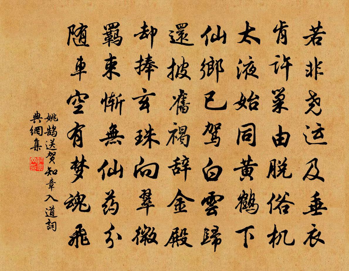 詩詞名句歷史字典書法欣賞書法字典國語詞典說文解字康熙字典古漢語字典標 題 作 者 詩 句 送賀知章入道作者:姚鵠 朝代:唐代送賀知章入道原文若非堯運及垂衣,肯許巢由脫俗機。太液始同黃鶴下,仙鄉已駕白雲歸。還披舊褐辭金殿,卻捧玄珠向翠微。羈束慚無仙藥分,隨車空有夢魂飛。詩詞問答問:送賀知章入道的作者是誰?答:姚鵠問:送賀知章入道寫於哪個朝代?答:唐代問:送賀知章入道是什麼體裁?答:七律姚鵠送賀知章入道書法欣賞送賀知章入道書法作品注釋全唐詩:卷553-27詩詞推薦清心鏡 內耕種贈木張先生馬鈺〔元代〕處孤清,內耕種。心意安閒,不搖不動。杳冥中、見個金牛,向溪田深*。清雨降,紫芝聳。赤鳳烏龜,前來看供曉行高翥〔宋代〕跨馬登長路,聞雞度遠關。水光斜漾月,雲影倒薶山。人跡霜橋外,禽聲煙樹間。自慚林下客,清夢未曾還。聞諸君不裹糧游山暮歸清坐靜林僧居相與樂以毛滂〔宋代〕禪房何許最清深,庚嶺梅邊晉竹林。餉客好山勝挈榼,遺予病骨任支琴。應餐秀色嚥溪茗,想待暗香來水沉。何似題新創南樓榜曰寬閒陳宓〔宋代〕樓高二丈只三間,四面平疇繞海山。白水青秧開淨練,碧巒蒼巘擁妝鬟。靜中始覺乾坤大,老去唯思歲月慳。但願無射詩佚名〔先秦〕國誠寧矣。遠人來觀。脩義經矣。好樂無荒。猗覺寮晚飯朱翌〔宋代〕卒律葛答美,鉤輈格磔肥。翁川茶不媚,何氏酒今非。硯水添池淺,棋盤下子稀。姮娥憐我獨,未暮款窗扉。示侄佐(佐草堂在東柯谷)杜甫〔唐代〕多病秋風落,君來慰眼前。自聞茅屋趣,只想竹林眠。滿谷山雲起,侵籬澗水懸。嗣宗諸子侄,早覺仲容賢。見翰林蘇公馬祖龐翁贊戲書黃庭堅〔宋代〕一口吸盡西江水,磨卻馬師三尺觜。馬駒蹋殺天下人,驚雷破浪非凡鱗。馬祖龐公,水泄不通。游鯈方樂,科斗生留宿山家葉元素〔宋代〕山翁留我宿,行倦看群捷。黃□滿山落,白猿終夜啼。枕邊千里夢,窗外一聲雞。明日登程去,何村日又西。哭澤孺方先生二首劉克莊〔宋代〕弟子成名眾,先生獨命窮。廣場雙鬢禿,陋巷一瓢空。雞饌為親設,牛衣與婦同。嗟乎猶薔壽,神理竟難通。次韻仇仁近晴窗二首方回〔宋代〕往時淟涊玷蕃宣,處士名聞積有年。甚欲同傾彭澤酒,未能略送始興錢。細看好句無疵處,時出名言亦自然。苦海生寶信常前杏花盛開置酒招同官以詩先之卷剛中〔宋代〕晴光先已媚簾櫳,炫書那堪杏吐紅。柳色半分高致外,鳥聲全在艷香中。催科共喜錢初減,種藝須聞麥已豐。官府函谷關汪元量〔宋代〕西風吹我度函關,古壑泉聲靜自閒。老子騎牛沙上去,仙人化鶴苑中還。斷崖木脫懸殘日,絕域雲橫失好山。舊說太皇太后閣春帖子趙湘〔唐代〕銅霤消殘凍,朱樓拂早霞。傳聲回步輦,來賞小桃花。夜行船(京口南園)黃機〔宋代〕紅濺羅裙三月二。露桃開、柳眠又起。百尺遊絲,罥鶯留燕,判與南園一醉。歷歷斜陽明野水。倚危闌、暮雲千里依韻答胡侍郎見寄范仲淹〔宋代〕千年風采逢明主,一寸襟靈慕昔賢。待看朝廷興禮讓,天衢何敢斗先鞭。贈念《法華經》僧齊己〔唐代〕萬境心隨一念平,紅芙蓉折愛河清。持經功力能如是,任駕白牛安穩行。滿庭芳(和洪丞相景伯韻呈景盧內翰)辛棄疾〔宋代〕急管哀弦,長歌慢舞,連娟十樣宮眉。不堪紅紫,風雨曉來稀。惟有楊花飛絮,依舊是、萍滿芳池。酴醿在,青虬宿桐廬館,同崔存度醉後作白居易〔唐代〕江海漂漂共旅遊,一尊相勸散窮愁。夜深醒後愁還在,雨滴梧桐山館秋。壬申春雪一絕蘇籀〔宋代〕長天頓改楚雲容,初夕依微後攪空。點綴柳條紛若絮,未妨梅蕊炫芳叢。名句推薦若似月輪終皎潔,不辭冰雪為卿熱。納蘭性德《蝶戀花·辛苦最憐天上月》 花落花開自有時,總賴東君主。嚴蕊《卜運算元·不是愛風塵》 牆裡鞦韆牆外道。牆外行人,牆裡佳人笑。蘇軾《蝶戀花·春景》 屈盤戲白馬,大笑上青山。李白《登敬亭北二小山余時送客逢崔侍御並登此地》 兼聽則明,偏信則暗。司馬光《資治通鑑·唐紀八》 人生何事須聚畜,一身之 外亦復何須。李大師、李延壽《南史·列傳·卷三十三》 聞道欲來相問訊,西樓望月幾回圓。韋應物《寄李儋元錫》 疏影橫斜水清淺,暗香浮動月黃昏。林逋《山園小梅·其一》 死去元知萬事空,但悲不見九州同。陸游《示兒》 無情燕子,怕春寒、輕失花期。晁沖之《漢宮春·梅》