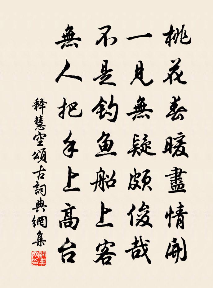 詩詞名句歷史字典書法欣賞書法字典國語詞典說文解字康熙字典古漢語字典標 題 作 者 詩 句 頌古作者:釋慧空 朝代:宋代頌古原文桃花春暖盡情開,一見無疑頗俊哉。不是釣魚船上客,無人把手上高台。詩詞問答問:頌古的作者是誰?答:釋慧空問:頌古寫於哪個朝代?答:宋代釋慧空頌古書法欣賞頌古書法作品詩詞推薦和仲求即席分題得庶字王安石〔宋代〕刀筆漫無營,圖書紛不御。平生攜手人,邂逅賞心處。名卿邵朱邑,膚使超嚴助。都官富篇章,博士熟經據。豈特淨業寺納蘭性德〔清代〕紅樓高聳碧池深,荷芰生涼豁遠襟。湖色靜涵孤剎影,花香暗入定僧心。經翻佛藏研朱莢,地賜朝家布紫金。下馬新涼書懷陸游〔宋代〕烏帽圍寬頻眼移,閉門慣忍日長飢。文章雖媿聲名誤,志節寧隨血氣衰?天地無私非困我,聖賢可學有餘師。短檠晨坐道室有感陸游〔宋代〕一缽青精便有餘,世間萬事總成余。手揮弦上烏棲曲,口誦岩間鳥跡書。丹氣初升勤沐浴,芝房未熟飽耘鋤。碧霄十蟲吟舒岳祥〔宋代〕蟲有絡緯婆,如繅復如紡。豆籬秋雨余,秉燭不須綱。置之銀絲籠,因而入羅幌。偏資兒女玩,終夜奏繁響。虎丘釋永頤〔宋代〕山色吳門少,行人愛此游。天高雲閣晚,石裂劍池秋。虎去空陵變,僧棲古塔幽。上方曾眺遠,落日駐扁舟。八冬苦雨禱晴幸應劉若訥惠詩為賀因次其韻韓元吉〔宋代〕麥田秋過未休工,{左禾右罷}稏如雲白雨中。乞得晴明三十日,披襟可詠快哉風。探梅李龍高〔宋代〕問訊南枝開未開,花禪許 * 徘徊。桐江一縷清風在,莫誤劉郎物色來。壽李悅齋五首和三勞使尹使君韻程公許〔宋代〕宇縣風塵暗,軍需色目繁。時機寧我待,心事向誰論。膻聚蟣爭慕,泉深驥渴奔。非公能借箸,猛虱恐徒捫。句孫何〔宋代〕美人與月正同色,客子折梅空斷腸。相和歌辭。銅雀台鄭愔〔唐代〕日斜漳浦望,風起鄴台寒。玉座平生晚,金尊妓吹闌。舞餘依帳泣,歌罷向陵看。蕭索松風暮,愁煙入井闌。偈頌十七首釋智愚〔宋代〕有意待不來,無心忽會面。頂發垂絲,眼光如電。說盡湖海風波,論量柴米貴賤。更有一處少人知,也是重安眼上王竟攜酒,高亦同過,共用寒字杜甫〔唐代〕臥病荒郊遠,通行小徑難。故人能領客,攜酒重相看。自愧無鮭菜,空煩卸馬鞍。移樽勸山簡,頭白恐風寒。玉樓春·寂寂畫堂樑上魏承班〔唐代〕寂寂畫堂樑上燕,高卷翠簾橫數扇。一庭春色惱人來,滿地落花紅幾片。愁倚錦屏低雪面,淚滴繡羅金縷線。好天宿應庵次季承韻趙蕃〔宋代〕只思借榻尋僧屋,不悟山行亦已深。異日重來應記路,斷塍窮處轉松林。贈虞教授別林季仲〔宋代〕儒生底用苦知書,學到根源物物無。曾子當年多一唯,顏淵終日只如愚。水流萬折心無競,月落千家境自孤。把手題陳宰戲彩亭梅堯臣〔宋代〕仕宦固已美,及親此其難。況慕五彩戲,而奉興居安。翁喜君亦喜,翁餐君亦餐。嗷嗷園中禽,口哺心違丸。邑大道中劉子翬〔宋代〕微風收宿靄,細路繞平皋。石亂春溪急,山寒曉月高。鳥聲時出樹,花氣欲侵袍。行役兼清賞,驅馳未覺勞。對酒陸游〔宋代〕天上何曾許寄愁,酒中正自可忘憂。不能上樹作巢飲,尚辦滿船供拍浮。神仙可學君豈信,衣食裁足吾何求?但憶寧都上元有作陳元晉〔宋代〕一覺悠然已五更,窗橫梅影月偏明。年時記得嬉遊罷,猶為梅花夢不成。名句推薦曾與美人橋上別,恨無訊息到今朝。劉禹錫《楊柳枝 / 柳枝詞》 黃鶴一去不復返,白雲千載空悠悠。崔顥《黃鶴樓 / 登黃鶴樓》 一年之計在於春,一日之計在於寅。佚名《增廣賢文·上集》 爽口物多終作疾,快心事過必為殃。馮夢龍《喻世明言·卷三》 迢迢新秋夕,亭亭月將圓。陶淵明《戊申歲六月中遇火》 春雲吹散湘簾雨,絮黏蝴蝶飛還住。納蘭性德《菩薩蠻·春雲吹散湘簾雨》 古人今人若流水,共看明月皆如此。李白《把酒問月·故人賈淳令予問之》 吾所以有大患者,為吾有身,及吾無身,吾有何患?老子《老子·道經·第十三章》 知之曰明哲,明哲實作則。佚名《尚書·商書·說命上》 清風明月苦相思,盪子從戎十載餘。王維《伊州歌》