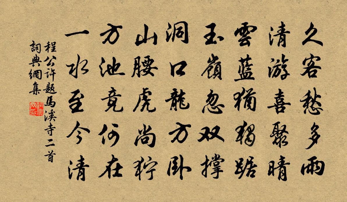 詩詞名句歷史字典書法欣賞書法字典國語詞典說文解字康熙字典古漢語字典標 題 作 者 詩 句 題馬溪寺二首作者:程公許 朝代:宋代題馬溪寺二首原文久客愁多雨,清游喜聚晴。雲藍猶獨踞,玉嶺忽雙撐。洞口龍方臥,山腰虎尚獰。方池竟何在,一水至今清。詩詞問答問:題馬溪寺二首的作者是誰?答:程公許問:題馬溪寺二首寫於哪個朝代?答:宋代程公許題馬溪寺二首書法欣賞題馬溪寺二首書法作品詩詞推薦自贊三首釋文準〔宋代〕我若自贊,雲居羅漢。我若自毀,無主餓鬼。贊之不欣,毀之不嗔。毀譽不動,江魯西秦。荷花韓偓〔唐代〕紈扇相欹綠,香囊獨立紅。浸淫因重露,狂暴是秋風。逸調無人唱,秋塘每夜空。何繇見周昉,移入畫屏中。南歌子·天上星河轉李清照〔宋代〕天上星河轉,人間簾幕垂。涼生枕簟淚痕滋,起解羅衣聊問、夜何其?翠貼蓮蓬小,金銷藕葉希舊時天氣舊時衣,舫齋王宗賢〔宋代〕滿船載月歸時趣,泛宅浮家避世狂。趺坐舫齋能靜嘿,神馳游宴無何鄉。幽居陸游〔宋代〕謝病言歸一鹿車,短籬數掩護幽居。樹枝南畔有飛鵲,蓮葉東邊多戲魚。倦枕續成驚斷夢,斜風吹落讀殘書。興來題鑒止軒陳棣〔宋代〕安身南北皆吾里,勿較使行兼尼止。心猶泥絮吹不起,豈有顏甲生微泚。方塘淨綠含真理,與我娛嬉聊爾爾。佳處頌古十首釋曇華〔宋代〕金色頭陀忽破顏,看來也是管窺斑。當時若得回頭早,免見兒孫墮黑山。用佚老園叟韻簡直孺並寄園叟方岳〔宋代〕趙君規模要名世,徐君人物南州稚。欲攜老硯共硯冰,梅花不許山礬弟。今年識徐如識春,未識佚老園中人。似聞夜讀了翁遺文有感陸游〔宋代〕秋雨蕭蕭夜不眠,挑燈開卷意悽然。吾曹自欲期千載,世論何曾待百年。當日公卿笑迂闊,即今河洛污腥膻。陰陽次韻和石學士見寄十首宋庠〔宋代〕老去勤勤念一丘,已將身世上虛舟。濟川善謔情雖厚,似倚清才惱白頭。訴董寺丞華岳〔宋代〕神首羅睺欲蝕天,彎弓直造玉皇前。九重不忍誅林甫,一札翻令囿馬遷。投鼠固知當忌器,得魚誰敢便忘筌。吾今賢者之孝二百四十首鄭潛曜林同〔宋代〕願以身代母,書焚上徹天。若非神許我,未必字依然。讀史文同〔宋代〕不得滎陽遂失秦,始知成敗盡由人。可憐一擲贏天下,只使黃金四萬斤。夜同宴,用人字張謂〔唐代〕北斗回新歲,東園值早春。竹風能醒酒,花月解留人。邑宰陶元亮,山家鄭子真。平生頗同道,相見日相親。同崔邠登鸛雀樓李益〔唐代〕鸛雀樓西百尺檣,汀洲雲樹共茫茫。漢家蕭鼓空流水,魏國山河半夕陽。事去千年猶恨速。愁來一日即為長。風煙送行和楊廷秀韻楊時〔宋代〕學粗知方始為人,敢崇文貌獨真誠。意雖阿世非忘世,志不謀身豈誤身。逐遇寬恩猶得祿,歸沖臘雪自生春。君詩葉公秉、王仲至見和,次韻答之蘇軾〔宋代〕袗絺方暑亦堪朝,歲晚淒風憶皁貂。共喜鵷鸞歸禁篽,心知日月在重霄。君如老驥初遭絡,我似枯桑不受條。強鑷時事感慨王同祖〔宋代〕羽書昨夜下長安,胡騎駸駸犯蜀關。愁殺閨中年少婦,朝朝空望戍夫還。游雁盪山八首大龍湫瀑布徐照〔宋代〕飛下數千盡,全然無定形。電橫天日射,龍出石雲腥。壯勢春曾看,寒聲佛共聽。昔人云此水,洗目最能靈。燕山九日汪元量〔宋代〕九日淒涼戲馬台,龍山高會亦塵埃。天翻地覆英雄盡,暑往寒來歲月催。人隔關河歸未得,客逢時節轉堪哀。十年名句推薦爭渡,爭渡,驚起一灘鷗鷺。李清照《如夢令·常記溪亭日暮》 憶君心似西江水,日夜東流無歇時。魚玄機《江陵愁望寄子安》 寂寞尊前席上,唯愁海角天涯。李清照《轉調滿庭芳·芳草池塘》 遊人不管春將老,來往亭前踏落花。歐陽修《豐樂亭遊春·其三》 秋到長門秋草黃。畫梁雙燕去,出宮牆。薛昭蘊《小重山·秋到長門秋草黃》 笙歌散盡遊人去,始覺春空。歐陽修《採桑子·群芳過後西湖好》 宿草春風又,新阡去歲無。楊萬里《寒食上冢》 酒美梅酸,恰稱人懷抱。李清照《蝶戀花·上巳召親族》 去年寄書報陽台,今年寄書重相催。李白《久別離》 君子懷德,小人懷土;君子懷刑,小人懷惠。孔子弟子《論語·里仁篇》