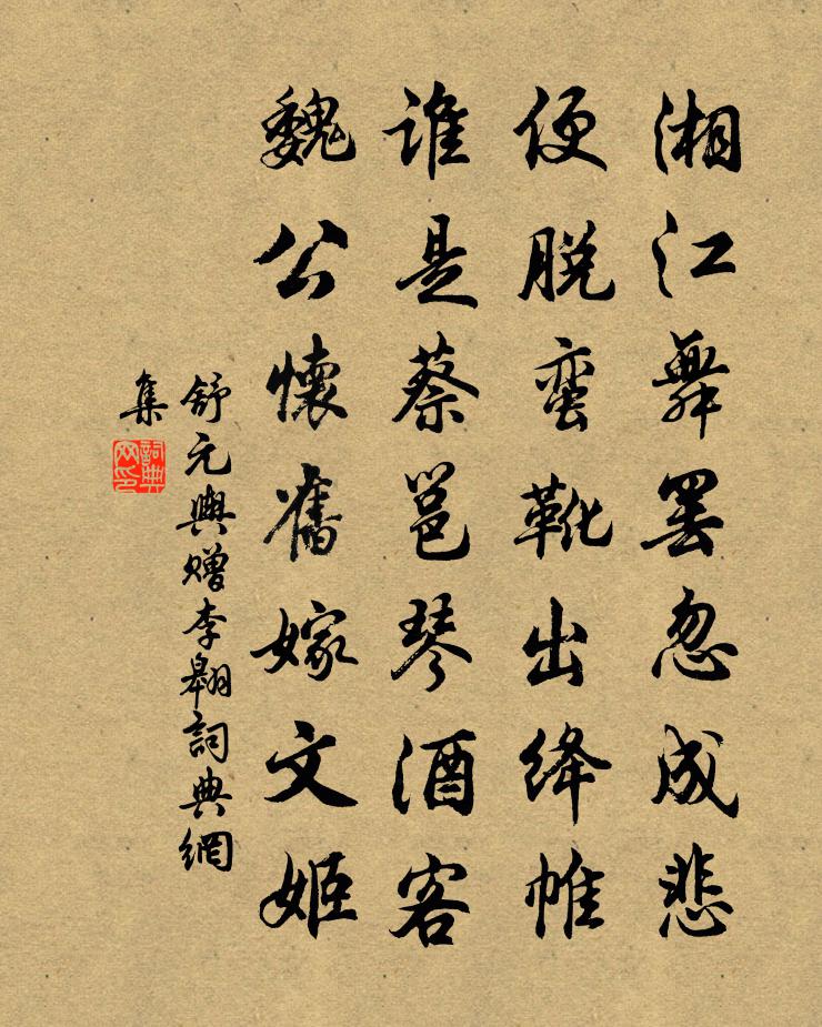 詩詞名句歷史字典書法欣賞書法字典國語詞典說文解字康熙字典古漢語字典標 題 作 者 詩 句 贈李翱作者:舒元輿 朝代:唐代贈李翱原文湘江舞罷忽成悲,便脫蠻靴出絳帷。誰是蔡邕琴酒客,魏公懷舊嫁文姬。詩詞問答問:贈李翱的作者是誰?答:舒元輿問:贈李翱寫於哪個朝代?答:唐代問:贈李翱是什麼體裁?答:七絕舒元輿贈李翱書法欣賞贈李翱書法作品注釋全唐詩:卷489-6詩詞推薦太上皇后合端午帖子詞汪應辰〔宋代〕寶殿名康壽,皇心在祝延。願從重五日,更閱萬千年。鷓鴣天(題廣文官舍竹外梅花呈萬教)盧炳〔宋代〕閣雨浮雲寒尚輕。商量雪意未全成。莫嫌竹外蕭然處,忽有幽香透鼻清。詩興逸,酒魂醒。主人留客更多情。不辭頌古三十一首釋梵琮〔宋代〕水牯牛兒也可夸,鼻繩拽斷臥煙霞。驀然癢處輕抓著,便向人前露尾巴。簡蔡天任吳則禮〔宋代〕天公與此強健身,故遣雨洗南徐春。梅柳暮年經老眼,江湖疇昔著覉臣。要穿遙集腳底屐,不負淵明頭上巾。頗欲兜率寺作林憲〔宋代〕歸雲薄如霧,徐行江上山。徘徊印松竹,輕風約之還。悠然渡江去,余影猶闌斑。白鳥更自在,幾點落遠灘。次吊原韻葉茵〔宋代〕為憐舉世不曾醒,放浪形骸澤畔行。會得危言危行意,佐成濯足濯纓名。義無可去緣同姓,心亦何求要獨清。今日將使有詩許移廚雙溪次其韻王炎〔宋代〕艤舟柳岸載清尊,招我花邊一賞春。莫笑看花人已老,白頭曾是少年人。嘆別羅鄴〔唐代〕北來南去幾時休,人在光陰似箭流。直待江山盡無路,始因拋得別離愁。和文與可洋州園亭三十詠其十九過溪亭蘇轍〔宋代〕溪淺復通橋,過者猶恨懶。賴有沙上鷗,常為獨遊伴。燕子樓賀鑄〔宋代〕城據山川勝,千年楚故都。高樓臨汴水,楊柳蔭芙蕖。唐室中多故,將軍老鎮徐。球場朝戲馬,玉帳夜投壺。白雪曲肱詩二十首白玉蟾〔宋代〕桑田變海海成田,這話教人信也難。只有一般輸我處,君王未有此清閒。贈眼醫天彥若蘇軾〔宋代〕鍼頭如麥芒,氣出如車軸。間關脈絡中,性命寄毛粟。而況清淨眼,內景含天燭。琉璃貯沆瀣,輕脆不任觸。而子孟子存心養性陳普〔宋代〕心體能存無走作,油然義理自中生。更無物慾相攻伐,萌櫱欣欣競向榮。虛谷志歸十首方回〔宋代〕饋篚承先問,吟箋辱暗投。駟車端肯顧,貳缶尚能謀。官妓呼難至,家姬出似羞。但令賓客喜,吾亦可忘憂。機舂歌錢時〔宋代〕機舂結草溪之唇,翳桑古柳聯清陰。無人認得東流水,如此妙旨誰知音。碧渠走峻琉璃滑,鳴瀑怒卷波瀾闊。飛輪贈然公界方晁說之〔宋代〕西方石為簡,東山人可與。不用量三江,聊以壓四虎。高士詠伯夷叔齊吳筠〔唐代〕夷齊互崇讓,棄國從所欽。聿來及宗周,乃復非其心。世濁不可處,冰清首陽岑。採薇詠羲農,高義越古今。詠懷阮籍〔魏晉〕灼灼西頹日,餘光照我衣。迴風吹四壁,寒鳥相因依。周周尚銜羽,蛩蛩亦念飢。如何當路子,磬折忘所歸。豈為挽陳提舉趙善括〔宋代〕志學屢辭爵,傳家蔚有聲。小 * 抗疏,文吏乃知兵。守法摧強御,輸忠沃聖明。平生無所負,讒口任蠅營。寧考神御奉安原廟王遂〔宋代〕禁殿薰風傳賜敕,宮門曉日緩催班。小臣未報君恩重,耿耿孤君入夢間。名句推薦不得乎親,不可以為人;不順乎親,不可以為子。孟子《孟子·離婁章句上·第二十八節》 騮馬新跨白玉鞍,戰罷沙場月色寒。王昌齡《出塞二首》 可譽而不譽,非仁也。墨子《墨子·46章 耕柱》 善附者異旨如肝膽,拙會者同音如胡越。劉勰《文心雕龍·附會》 不可同日而語畢沅《續資治通鑑·宋紀·宋紀七十三》 猿鳥猶疑畏簡書,風雲常為護儲胥。李商隱《籌筆驛》 四時有不謝之花,八節有長青之草。李汝珍《鏡花緣·第一回》 且樂生前一杯酒,何須身後千載名?李白《行路難三首》 宦情羈思共淒淒,春半如秋意轉迷柳宗元《柳州二月榕葉落盡偶題》 著葉滿枝翠羽蓋,開花無數黃金錢杜甫《秋雨嘆三首》