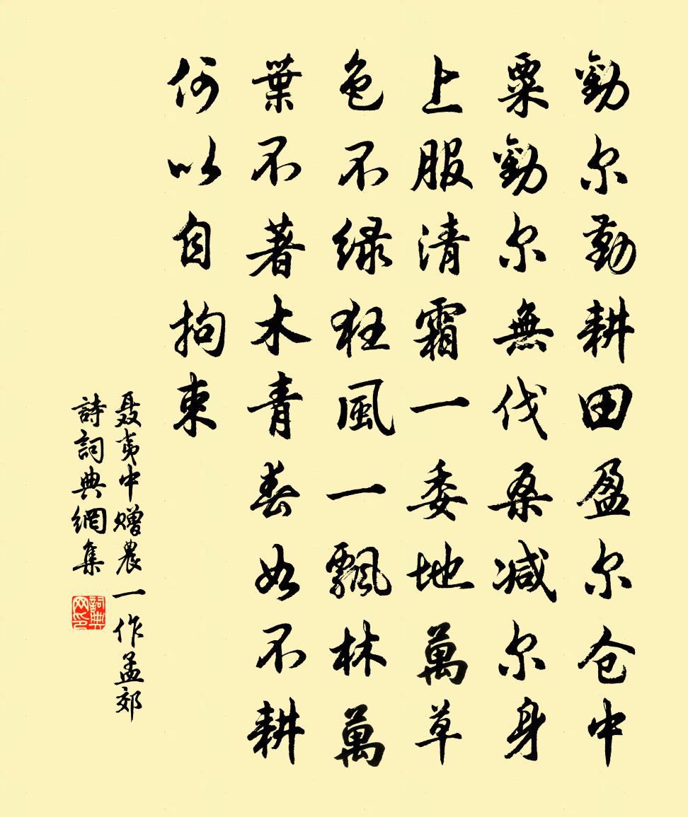 詩詞名句歷史字典書法欣賞書法字典國語詞典說文解字康熙字典古漢語字典標 題 作 者 詩 句 贈農(一作孟郊詩)作者:聶夷中 朝代:唐代贈農(一作孟郊詩)原文勸爾勤耕田,盈爾倉中粟。勸爾無伐桑,減爾身上服。清霜一委地,萬草色不綠。狂風一飄林,萬葉不著木。青春如不耕,何以自拘束。詩詞問答問:贈農(一作孟郊詩)的作者是誰?答:聶夷中問:贈農(一作孟郊詩)寫於哪個朝代?答:唐代聶夷中贈農(一作孟郊詩)書法欣賞贈農(一作孟郊詩)書法作品詩詞推薦春園醉醒閒臥小齋楊發〔唐代〕酣醉送餘春,醒來恨更頻。花殘蜂蠹物,葉暗鳥欺人。簾閉高眠貴,齋空浩氣新。從今北窗蝶,長是夢中身。己亥歲感事曹松〔唐代〕澤國江山入戰圖,生民何計樂樵蘇。憑君莫話封侯事,一將功成萬骨枯。早歲趙蕃〔宋代〕早歲耽詩老不工,但余多難似詩窮。忽來數紙丁寧甚,恍憶他時繾綣同。幕府十年公勿厭,風霜滿面我思東。幾因送黃子弘歸吳門劉宰〔宋代〕玉樓工就故人仙,宿草離離起暮煙。曾說項斯誰復記,尚懷中散子真賢。鼎來窮巷方今日,勝讀殘編已十年。西望司馬歸州輓詩項安世〔宋代〕玉立氣如春,魁然長者人。三朝陳素業,兩郡駕朱輪。國乾須名族,吾衰倚大姻。那知沙步酒,一別遂終身。山禽張籍〔唐代〕山禽毛如白練帶,棲我庭前栗樹枝。獼猴半夜來取栗,一雙中林向月飛。題漢州西湖嚴公貺〔唐代〕鳳沼才難盡,餘思鑿西湖。珍木羅修岸,冰光映坐隅。琴台今寂寞,竹島尚縈紆。猶蘊濟川志,芳名終不渝。西江月吳儆〔宋代〕山色不隨春老,竹枝長向人新。桃蹊李徑已成陰。深院鶯啼人靜。塵世白駒過隙,人情蒼狗浮雲。不須計較謾勞神浪淘沙佚名〔宋代〕修竹間青松。翠影重重。道家樓閣白雲中。隔岸紅塵飛不到,水浸寒空。此景與誰同。洞口仙翁。素琴彈罷倒金鐘湖上新晴宋伯仁〔宋代〕湖邊膏雨弄晴時,桃杏紅爭錦一機。楊柳也如新及第,向人爭舞綠羅衣。問信紅梅二章舒岳祥〔宋代〕花到紅梅真有韻,人生白髮未宜愁。只須竟就花前醉,如此風流不外學。蒙再示屬辭三嘆之餘詵贊巨麗無地託言輒依元陳與義〔宋代〕書如嘉肴要知旨,區區太沖空詠史。百年能掛幾牛角,火急編摩時亹亹。柳家文類今無遺,可忍行事空違之。此書留仲謙錢時〔宋代〕二十年前舊詩友,子居仲謙真耐久。少時懷抱易過逢,老去雲林難聚首。去年廣墊得子居,論心豈但相煦濡。咫尺贊大慧和尚釋鹹傑〔宋代〕戳瞎頂門三隻眼,是非佛法一齊劃。竹篦頭上放無端,正是徐六擔片板。日望冉雄飛之來久不聞近耗因成鄙句以見翹然馮時行〔宋代〕緩轡微吟自不催,看山下馬想徘徊。陽春白雪久不聽,日暮碧雲殊未來。已戒兒童篘熟酒,更勤風雪化新梅。雲間省試風光草際浮劉禹錫〔唐代〕熙熙春景霽,草綠春光麗。的歷亂相鮮,葳蕤互虧蔽。乍疑芊綿里,稍動丰茸際。影碎翻崇蘭,浮香轉叢蕙。含煙桂花程公許〔宋代〕雨花那得著衣裾,遍界香分佛飯余。金粟如來元一點,橫陳妙供盡從渠。判道士黃山隱皇甫大夫〔唐代〕道士黃山隱,輕人復重財。太山將比甑,東海只容杯。綠綬藏雲帔,烏巾換鹿胎。黃泉六個鬼,今夜待君來。近於伊川卜山居將命者畫圖而至欣然有感…青田胎化鶴李德裕〔唐代〕弱歲弄詞翰,遂叨明主恩。懷章過越邸,建旆守吳門。西圯陰難駐,東皋意尚存。慚逾六百石,愧負五千言。寄世文宣王及其弟子贊宋高宗〔宋代〕開國乘氏,有德斯彰。叅稽百行,贊理三綱。自拔行閒,榮名甚光。在史藹藹,歷久彌芳。名句推薦淮水悠悠。萬頃煙波萬頃愁。淮上女《減字木蘭花·淮山隱隱》 芭蕉不展丁香結, 同向春風各自愁。李商隱《代贈二首》 二十四橋,頗有杜書記否。劉辰翁《桂枝香· * 人去》 年華共,混同江水,流去幾時回納蘭性德《滿庭芳·堠雪翻鴉》 青山隱隱水迢迢,秋盡江南草未凋。杜牧《寄揚州韓綽判官》 兄弟叔侄,須分多潤寡;長幼內外,宜法肅辭嚴。朱柏廬《朱子家訓·全文》 憶君遙在瀟湘月,愁聽清猿夢裡長。王昌齡《送魏二》 如知其非義,斯速已矣,何待來年。孟子《孟子·滕文公章句下·第八節》 雷雨窈冥而未半,皦日籠光於綺寮。左思《三都賦》 野童扶醉舞,山鳥助酣歌。孟浩然《夏日浮舟過陳大水亭 / 浮舟過滕逸人別業》