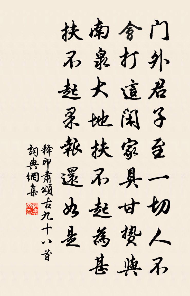 詩詞名句歷史字典書法欣賞書法字典國語詞典說文解字康熙字典古漢語字典標 題 作 者 詩 句 頌古九十八首作者:釋印肅 朝代:宋代頌古九十八首原文門外君子至,一切人不會。打這閒家具,甘贄與南泉。大地扶不起,為甚扶不起,果報還如是。詩詞問答問:頌古九十八首的作者是誰?答:釋印肅問:頌古九十八首寫於哪個朝代?答:宋代釋印肅頌古九十八首書法欣賞頌古九十八首書法作品詩詞推薦頌古三十六首釋惟一〔宋代〕無寒暑處報君知,不離寒時與熱時。熱則乘涼寒向火,不須迴避不須疑。歷陽十詠之一厤湖賀鑄〔宋代〕昔也萬家邑,今為無底淵。城郭泯遺蹟,人民安得全。弔古一回首,薄暮愁風煙。拯溺不無意,吾生後千年。奉同何濟川迎吏示至秋暑方劇呈同舍司馬光〔宋代〕稚金酒避老火,酒暑勢萬驕酒盈。朱光酒爍厚地,萬葉焦無聲。夫子久倦遊,得郡為親榮。束裝待騶吏,歸期殊未秋日雜詠陸游〔宋代〕久雨初晴喜欲迷,青鞋踏偏舍東西。忽然來到柳橋下,露濕蓼花紅一溪。山居雜詩九十首曹勛〔宋代〕僧相同剃除,其門則異竇。律儀尚講論,估禪則烏有。悟去此大魁,窮說則學究。與語判此科,是非免紛糅。題規無范雲深室釋文珦〔宋代〕物外清虛境,由來遠眾紛。靈蹤幾年說,梵放或時聞。似有似無路,漫山漫谷雲。自難容俗駕,曾不待移文。松隱坐上寄錢大參曹勛〔宋代〕閒里光陰不記名,曲勤宏度訪公榮。五雲灑翰情文厚,九節浮香琖色輕。寶箑含風清致爽,彩絲縈臂眼增明。團欒過故斛斯校書莊二首杜甫〔唐代〕此老已雲歿,鄰人嗟亦休。竟無宣室召,徒有茂陵求。妻子寄他食,園林非昔游。空餘繐帷在,淅淅野風秋。燕入卜居遣興一首蘇籀〔宋代〕老懶清吟口角鈐,任真虛一性安恬。士農軌範一身任,孔老窮探兩者兼。齋舍晦晨雞弗已,翱翔晚節蔗彌甜。平生送僧釋如淨〔宋代〕生逼猢猻坐鐵砧,一槌天地盡崩沈。橫來豎去呵呵笑,喫飯噇眠邁古今。河南鄭少尹城南亭送鄭判官還河東皇甫冉〔唐代〕使臣懷餞席,亞尹有前溪。客是仙舟里,途從御苑西。泉聲喧暗竹,草色引長堤。故絳青山在,新田綠樹齊。天秋屈原徐鈞〔宋代〕托興妃嬪疑褻嫚,幻言神怪似荒唐。若無一點精忠節,未必文爭日月光。公擇這門告別口占送之趙蕃〔宋代〕平生幾作送行詩,展卷常增別後思。我分無堪只貧賤,君才未免尚驅驅。江山此去雖多識,桃李何心亦念離。邂逅贈寶覺王安石〔宋代〕大師京國舊,興趣江湖迥。往與惠詢輩,一宿金山頂。懷哉苦留戀,王事有朝請。別來能幾時,浮念劇含梗。今朝寄新人王同祖〔宋代〕恰回午枕自華胥,忽得周郎一紙書。江上春風能幾日,莫教門外柳蕭疏。送環知客歸省親釋子淳〔宋代〕清風明月秋光半,環禪別我雲南歸。當堂子母相逢日,妙圓孰敢分離微。咦,撥轉吾家向上機,回頭觸處生光輝。挽潘德夫左司孫應時〔宋代〕愛士風流古,繙書氣味長。詩家入陶謝,書法到顏楊。竹石故無恙,人琴今則亡。二龍天下秀,一一看增光。送徐隱父宰餘干二首黃庭堅〔宋代〕天上麒麟來下瑞,江南橘柚間生賢。玉台書在猶騷雅,孺子亭荒只草煙。半世功名初墨綬,同兄文字直青錢。割雞句王俊彥〔宋代〕不雜人間種,恐遭天上殃。與瀼溪鄰里元結〔唐代〕昔年苦逆亂,舉族來南奔。日行幾十里,愛君此山村。峰谷呀回映,誰家無泉源。修竹多夾路,扁舟皆到門。瀼溪名句推薦執子之手,與子偕老。詩經《擊鼓》 關西老將不勝愁,駐馬聽之雙淚流。王維《隴頭吟》 兩行疏柳,一絲殘照,萬點鴉棲。劉基《眼兒媚·秋思》 謗書盈篋不復辯,脫身來看江南山。謝逸《送董元達》 教人怎不傷情。覺幾度、魂飛夢驚。劉過《柳梢青·送盧梅坡》 黃埃散漫風蕭索,雲棧縈紆登劍閣。白居易《長恨歌》 予若洞庭葉,隨波送逐臣。李白《送郄昂謫巴中》 滿眼遊絲兼落絮,紅杏開時,一霎清明雨。馮延巳《鵲踏枝·清明》 識時務者為俊傑,昧先幾者非明哲。程登吉《幼學瓊林·卷三·人事》 驚塞雁,起城烏,畫屏金鷓鴣。溫庭筠《更漏子·柳絲長》