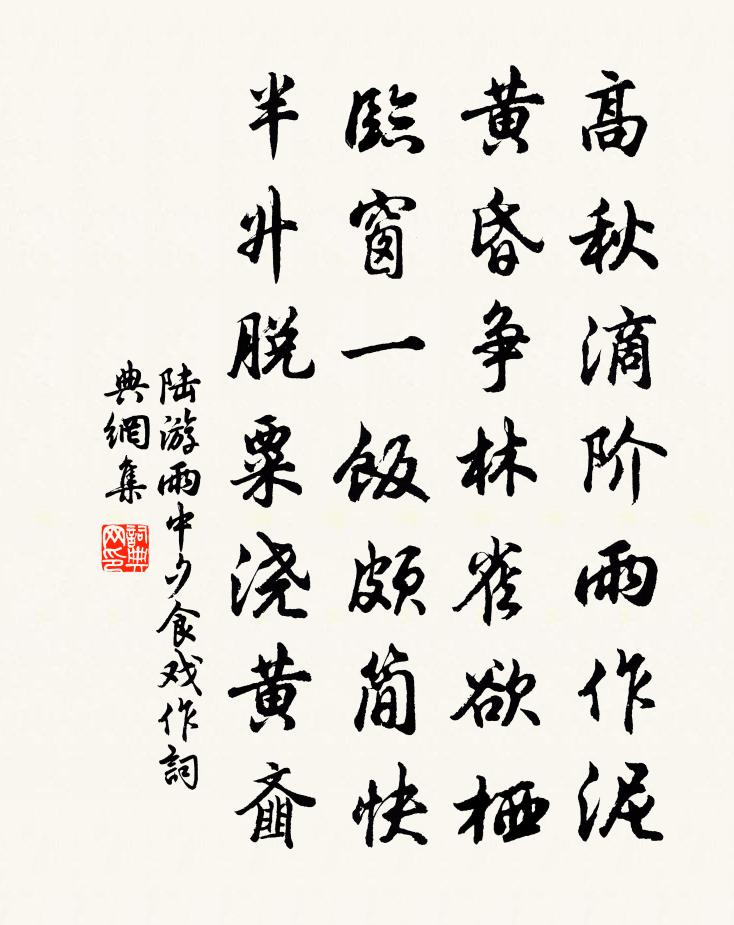 高秋滴階雨作泥,黃昏爭林雀欲棲。臨窗一飯頗簡快,半升脫粟澆黃齏。