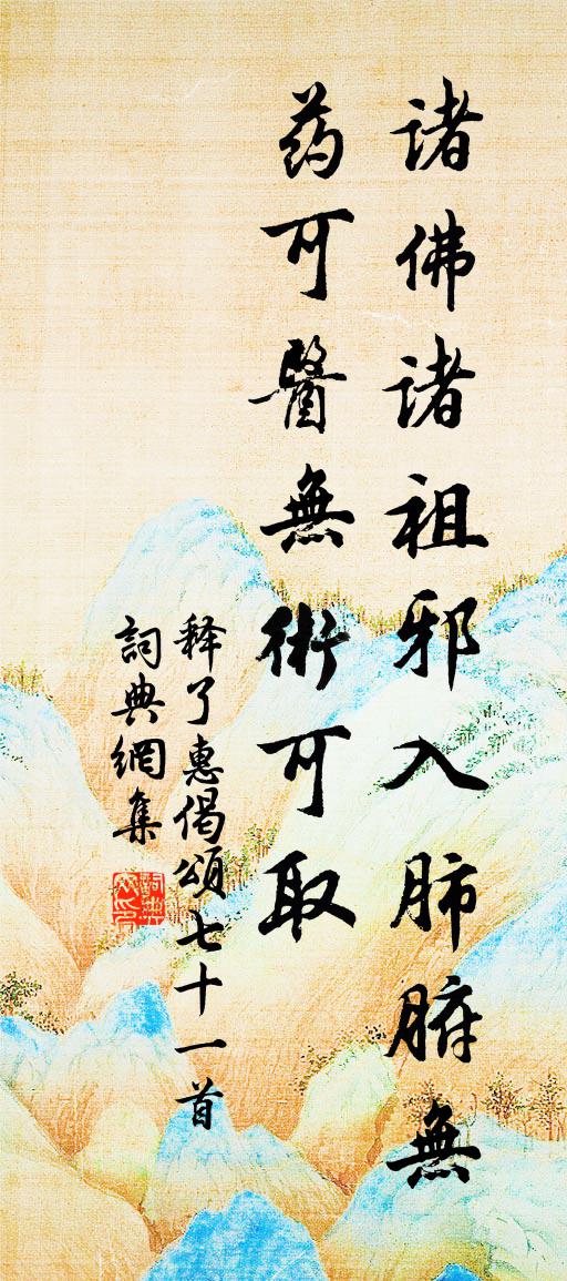 詩詞名句歷史字典書法欣賞書法字典國語詞典說文解字康熙字典古漢語字典標 題 作 者 詩 句 偈頌七十一首作者:釋了惠 朝代:宋代偈頌七十一首原文諸佛諸祖,邪入肺腑。無藥可醫,無術可取。詩詞問答問:偈頌七十一首的作者是誰?答:釋了惠問:偈頌七十一首寫於哪個朝代?答:宋代釋了惠偈頌七十一首書法欣賞偈頌七十一首書法作品詩詞推薦句周元范〔唐代〕誰雲蒿上煙,隨雲依碧落。莫怪西陵風景別,鏡湖花草為先春。自警劉克莊〔宋代〕筆枯硯燥自傷悲,文體全關氣盛衰。倚馬縱允揮萬字,騎驢尚足課千詩。奉盤誰可推盟主,撼樹人方謗老師。疑有七夕次韻李呂〔宋代〕天上佳期歲一來,人間急管莫相催。鵲橋成後天孫度,雨泣懸知飈馭回。兒女歡呼爭乞巧,樓台羅列賸傳杯。欲搜東寺詩僧照上人 訪予於普明寺,贈以詩楊萬里〔宋代〕故人深住白雲隈,欲到何因只寄梅。歲晚觀山吾獨立,泥中騎馬子能來。轉頭不覺三年別,病眼相看一笑開。說似答士宜張埴〔宋代〕書生何飾結天各,忽放晴光渺四涯。一片歸心湖草外,輕風搖艇自吟詩。扈蹕建康道中值雪二首曹勛〔宋代〕玉界瓊田處處村,群山繚白曉雲昏。聖君縞素天垂應,三白飛花奉至尊。得句姜特立〔宋代〕得句勝於得好官,平生事業蠹魚間。近來世味尤如蠟,唯有吟詩不奈閒。發興章采〔宋代〕主靜觀心妙,耽奇發興長。蘭邊招翡翠,梧下待鸞凰。天地東風綠,江湖西日黃。靈修猶浩蕩,誰與玩瓊芳。宴樣州南亭得池字盧照鄰〔唐代〕二條開勝跡,大隱葉沖規。亭閣分危蛐,樓台繞曲他。長薄秋煙起,飛梁古蔓垂。水鳥翻荷葉,山蟲咬桂枝。遊人偈頌一百零二首釋慧遠〔宋代〕而來與一杓鹹鹽酸醋,北來與一杓苦菜淡虀。吃則因邪打正,不吃則東自西。追和淵明貧土詩七首劉黻〔宋代〕高山與流水,妙趣歸之琴。吾愧學未成,菲嘆無知音。但向胸中會,毋勞指下尋。種菊或可茹,得酒聊復斟。窮達湖上薛師石〔宋代〕勢利絕交初,瞿然臥隱廬。無營心淡泊,見客禮生疎。游有漁樵伴,看多佛老書。春深草易長,忘卻倩人鋤。雪中憶李楫王維〔唐代〕積雪滿阡陌,故人不可期。長安千門復萬戶,何處躞蹀黃金羈。法曲獻仙音姜夔〔宋代〕齋下瞰湖山,光景奇絕。予數過之,為賦此虛閣籠寒,小簾通月,暮色偏憐高處。樹隔離宮,水平馳道,湖山盡入崇壽印師以詩見惠次韻答之王洋〔宋代〕客問王居士,如何是半僧。祛緣都未盡,學道又無能。身世隨忙業,妻兒飽歲登。時逢方外士,陪奉說心燈。絕句一首蘇籀〔宋代〕雙紋八尺展雕床,蓮艷方空夜玉香。雅秀冰姿延閣彥,豈應簪斷作淒涼。閔子騫金朋說〔宋代〕名稱大才世這難,襖絮蘆花豈耐寒。寧使一身甘凍死,肯教三子受衣單。暮春即事楊萬里〔宋代〕花時追賞夜將朝,花過痴眠日盡高。又與山禽爭口腹,執竿挾彈守櫻桃。郊廟歌辭。五郊樂章。黑郊迎神佚名〔唐代〕玄英戒序,黑郊臨候。掌禮陳彝,司筵執豆。寒氛斂色,冱泉凝漏。樂以迎神,八音斯奏。依韻吳沖卿秘閣觀逸少墨跡梅堯臣〔宋代〕奇哉王右軍,下筆若神聖。長戈與伏弩,無不從號令。賢豪雖林立,帖斂孰敢競。師徒氣揚揚,龍虎旗正正。勝聲名句推薦西北望長安,可憐無數山辛棄疾《菩薩蠻·書江西造口壁》 驪山四顧,阿房一炬,當時奢侈今何處?張養浩《山坡羊·驪山懷古》 乃翁知國如知兵,塞垣草木識威名。黃庭堅《送范德孺知慶州》 柳花深巷午雞聲,桑葉尖新綠未成。范成大《春日田園雜興》 青蒲銜紫茸,長葉復從風。佚名《拔蒲二首》 讀書好處心先覺,立雪深時道已傳。袁枚《隨園詩話·卷三》 歷覽千載書,時時見遺烈。陶淵明《癸卯歲十二月中作與從弟敬遠》 兒不嫌母醜,狗不嫌家貧。佚名《增廣賢文·下集》 天際兩蛾凝黛,愁與恨、幾時極。韓元吉《霜天曉角·題採石蛾眉亭》 七八個星天外,兩三點雨山前。辛棄疾《西江月·夜行黃沙道中》