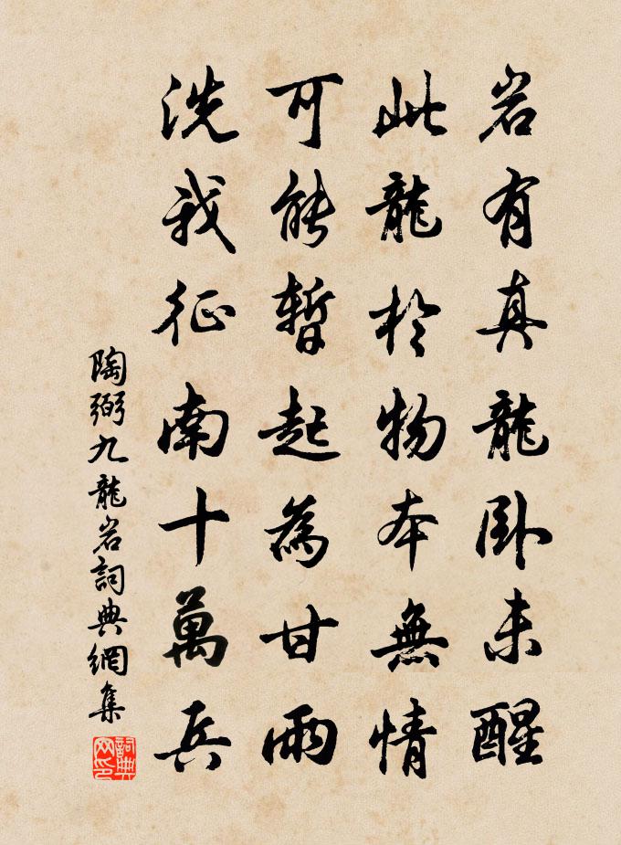 詩詞名句歷史字典書法欣賞書法字典國語詞典說文解字康熙字典古漢語字典標 題 作 者 詩 句 九龍巖作者:陶弼 朝代:宋代九龍巖原文岩有真龍臥未醒,此龍於物本無情。可能暫起為甘雨,洗我征南十萬兵。詩詞問答問:九龍巖的作者是誰?答:陶弼問:九龍巖寫於哪個朝代?答:宋代陶弼九龍巖書法欣賞九龍巖書法作品詩詞推薦九里松鄧林〔宋代〕松是山靈一手栽,堯天長就棟樑材。龍髯怒起春風急,似怪遊人喝道來。閒趣陸游〔宋代〕飯滿七綴缽,香凝百衲窗。雨聲酣曉枕,燈燼落秋釭。疾豎元知遯,天魔亦已降。超然對兒子,未媿鹿門龐。寄吳道子王冕〔元代〕三月不見吳道子,十日兩渡錢塘江。詩書壓架自足樂,風月滿壇誰敢降?菖蒲青青繞石壁,薜荔密密緣山窗。歸來東門之楊佚名〔先秦〕東門之楊,其葉牂牂。昏以為期,明星煌煌。東門之楊,其葉肺肺。昏以為期,明星晢晢。禪人寫師真請贊釋慧遠〔宋代〕畫出不堪,棄智雜毒。贊之不是,厭身桎梏。一十三處坐道場,二時粥飯何曾足。日裹夜行,投明暗宿。殘年陸游〔宋代〕殘年垂八十,高臥豈逃名。泥巷多牛跡,茅檐有碓聲。炊菰觴父老,煮棗哺雛嬰。遣戍雖傳說,何時復兩京?謝趙太傅遺聚米圖經黃庶〔宋代〕文武生賢子,羌圖帝所多。始欣知馬援,終嘆失廉頗。蒼鼠巢遺稿,黃埃鎖舊戈。遠人猶偃蹇,掩帙淚滂沱。廣陵李僕射借示近詩因投獻羅隱〔唐代〕朝論國計暮論兵,餘力猶隨鳳藻生。語繼盤盂拋俗格,氣兼河嶽帶商聲。閒尋綺思千花麗,靜想高吟六義清。天柄題周諫別業(予寺與周生所居俱臨苕水)皎然〔唐代〕隱身苕上欲如何,不著青袍愛綠蘿。柳巷任疏容馬入,水籬從破許船過。昂 * 鶴閒心遠,寂歷秋花野意多。若訪贈呂通秘丞王禹偁〔宋代〕聞君公事苦喧卑,紅粟堆邊獨歛眉。已入朝行翻掌庾,未如畿尉且吟詩。堰頭笑傲同張祜,市里優遊比路隨。唯有酒徒徐渭〔明代〕御史別淳于,金釵墮長夜。 五斗不濕唇,雙鬟抱壚瀉。 笑殺斗升腸,耳熱索稈蔗。 夜遊宮·記夢寄師伯渾陸游〔宋代〕雪曉清笳亂起。夢遊處、不知何地。鐵騎無聲望似水。想關河,雁門西,青海際。睡覺寒燈里。漏聲斷、月斜窗紙和陳子良海棠四首吳芾〔宋代〕花間春色麗晴空,惱我狂來只繞叢。試問妖嬈誰與比,一株勝卻萬株紅。辭二知己賈島〔唐代〕一雙千歲鶴,立別孤翔鴻。波島忽已暮,海雨寒濛濛。離人聞美彈,亦與哀彈同。況茲切切弄,繞彼行行躬。雲飛州橋范成大〔宋代〕州橋南北是天街,父老年年等駕回。忍淚失聲詢使者,"幾時真有六軍來?"登樓野望趙汝鐩〔宋代〕雲藏日影微吞吐,道是晴來又似陰。秋色涵空醒醉眠,雁聲到耳引歸心。暴流決岸危橋斷,古木堆煙遠寺深。自料再次韻寄林郎中陳造〔宋代〕林侯理窟元無底,如拜宣尼親闕里。經笥沈醇文筆古,俯視時流皆日耳。我生憂虞占多半,鱉跛蠖屈今已慣。林侯梁廣畫花歌顧況〔唐代〕王母欲過劉徹家,飛瓊夜入雲輧車。紫書分付與青鳥,卻向人間求好花。上元夫人最小女,頭面端正能言語。手把謝宋推官惠白牛邵雍〔宋代〕毛如霜雪眼如朱,耳角方齊三尺餘。狀異不將耕曠土,性馴宜用駕安車。水邊牧處龍能擾,月下牽時兔可驅。從此送劉萱之道州謁崔大夫劉長卿〔唐代〕沅水悠悠湘水春,臨歧南望一沾巾。信陵門下三千客,君到長沙見幾人。名句推薦春色邊城動,客思故鄉來。何遜《邊城思》 中池所以綠,待我泛紅光。沈約《詠芙蓉》 雨洗娟娟淨,風吹細細香。杜甫《嚴鄭公宅同詠竹》 物雖小,勿私藏。苟私藏,親心傷。李毓秀《弟子規·入則孝》 君子以行言,小人以舌言佚名《孔子家語·顏回》 君在陰兮影不見,君依光兮妾所願。傅玄《車遙遙篇》 志以淡泊明,而節從肥甘喪矣。洪應明《菜根譚·概論》 章台柳,章台柳,昔日青青今在否?韓翃《章台柳·寄柳氏》 日暮秋煙起,蕭蕭楓樹林。戴叔倫《過三閭廟》 世界微塵里,吾寧愛與憎。李商隱《北青蘿》