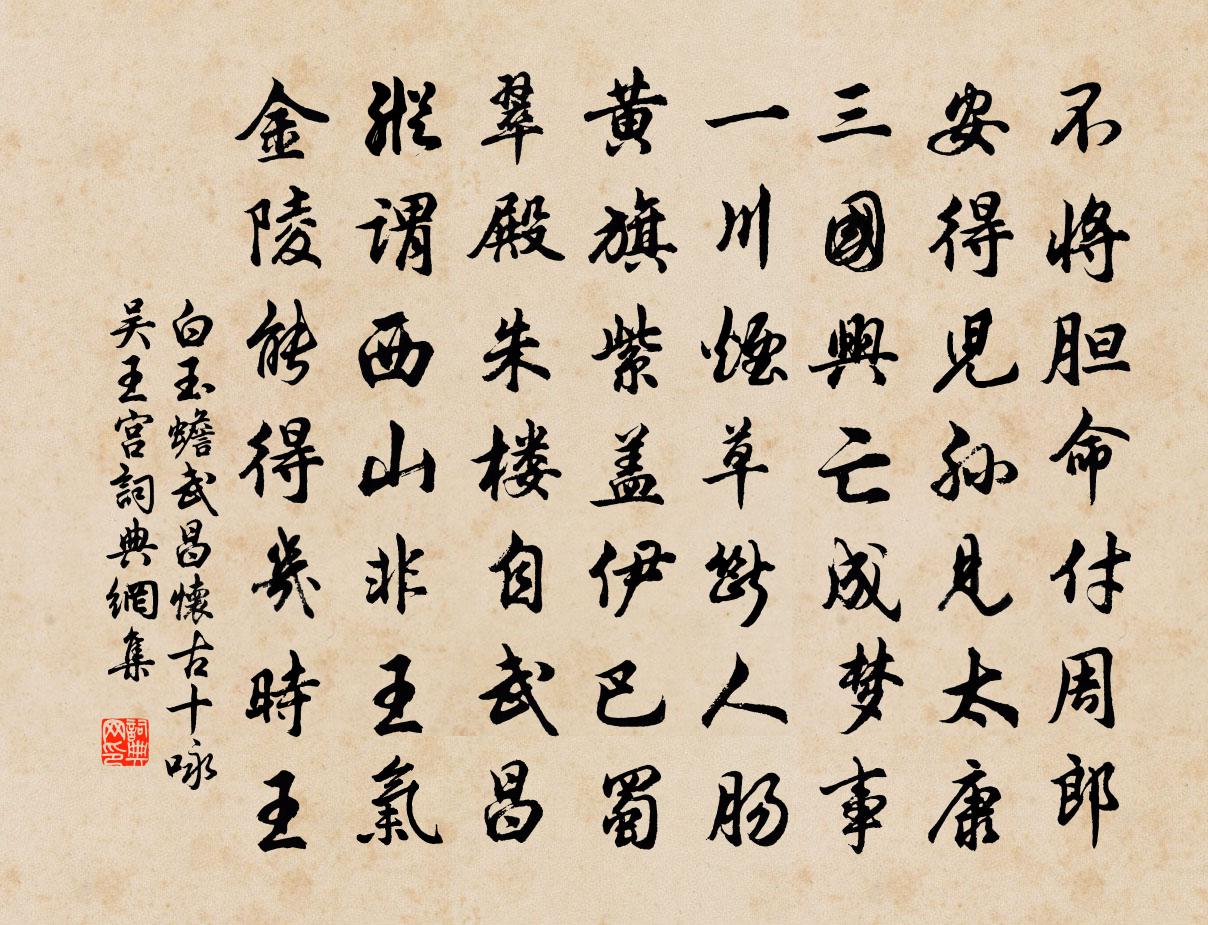 詩詞名句歷史字典書法欣賞書法字典國語詞典說文解字康熙字典古漢語字典標 題 作 者 詩 句 武昌懷古十詠吳王宮作者:白玉蟾 朝代:宋代武昌懷古十詠吳王宮原文不將膽命付周郎,安得兒孫見太康。三國興亡成夢事,一川菸草斷人腸。黃旗紫蓋伊巴蜀,翠殿朱樓自武昌。縱謂西山非王氣,金陵能得幾時王。詩詞問答問:武昌懷古十詠吳王宮的作者是誰?答:白玉蟾問:武昌懷古十詠吳王宮寫於哪個朝代?答:宋代問:武昌懷古十詠吳王宮是什麼體裁?答:七律白玉蟾武昌懷古十詠吳王宮書法欣賞武昌懷古十詠吳王宮書法作品詩詞推薦海上從事秋日書懷李中〔唐代〕悠悠旅宦役塵埃,舊業那堪信未回。千里夢隨殘月斷,一聲蟬送早秋來。壺傾濁酒終難醉,匣鎖青萍久不開。唯有捕狼陳師道〔宋代〕一狼將四子,二嶺走千羊。意得無前敵,時乖闕後防。寧知射生手,已發弩機張。會使烏鳶飽,空令豺虎傷。鷓鴣天(獻汲公相國壽)米芾〔宋代〕暖日晴烘候小春。際天和氣與精神。靈台靜養千年壽,丹灶全無一點塵。壽彭祖,壽廣成。華陽仙裔是今身。夜來郵亭張繼〔唐代〕雲淡山橫日欲斜,郵亭下馬對殘花。自從身逐征西府,每到開時不在家。烏夜啼(醉枕不能寐)程垓〔宋代〕白酒欺人易醉,黃花笑我多愁。一年只有秋光好,獨自卻悲秋。風急常吹夢去,月遲多為人留。半黃橙子和詩卷,念奴嬌趙鼎臣〔宋代〕姮娥伴侶,降人世,天與長生仙籙。五色雲開浮瑞靄,中有西真眉目。賢德家風,艷容天賦,占盡人間福。長庚明送使廣州張九齡〔唐代〕家在湘源住,君今海嶠行。經過正中道,相送倍為情。心逐書郵去,形隨世網嬰。因聲謝遠別,緣義不緣名。送宋秀才綦毋潛〔唐代〕冠古積榮盛,當時數戟門。舊交丞相子,繼世五侯孫。長劍倚天外,短書盈萬言。秋風一送別,江上黯消魂。晚登望雲陸游〔宋代〕晚來煙雨暗江乾,烽火遙傳畫角殘。看鏡功名空自許,上樓懷抱若為寬。青楓搖落新秋令,白髮淒涼舊史官。飽見浣溪沙楊 * 〔宋代〕風遞餘花點素繒。日烘芳炷下蘿藤。為誰雕琢碎春冰。玉蕊觀中猶得譽,木樨岩下尚馳聲。何如高架任伊憑。和叔夏歲除胡寅〔宋代〕新年節物推排有,舊歲光陰掃蕩無。白髮任教裝鬢換,青春元自與心符。茹芝休慕商山老,舍瑟當睎魯國儒。三益寇準讀書佚名〔宋代〕初,張詠在成都,聞準入相,謂其僚屬曰:“寇公奇材,惜學術不足爾。”及準出陝,詠適自成都罷還,準嚴供帳秋懷羅公升〔宋代〕空庭下梧葉,欲靜聞疏雨。幽懷耿無寐,鄰客終夜語。寓嘆陸游〔宋代〕小隱終非隱,休官尚是官。早知農圃樂,不見道途難。故國雞豚社,貧家菽水歡。至今清夜夢,猶覺畏濤瀾。天中節前三日大聖慈寺華嚴閣燃燈甚盛遊人過陸游〔宋代〕萬瓦如鱗百尺梯,遙看突兀與雲齊。寶簾風定燈相射,綺陌塵香馬不嘶。星隕半空天宇靜,蓮生陸地客心迷。歸途梅杜牧〔唐代〕輕盈照溪水,掩斂下瑤台。妒雪聊相比,欺春不逐來。偶同佳客見,似為凍醪開。若在秦樓畔,堪為弄玉媒。拋球樂馮延巳〔唐代〕年少王孫有俊才,登高歡醉夜忘回。歌闌賞盡珊瑚樹,情厚重斟琥珀杯。但願千千歲,金菊年年秋解開。永和道中懷成父趙蕃〔宋代〕風帆十幅空百灘,布衾高臥寧知寒。連明風雨曉增劇,嘆我山行逢路難。東坡在惠州窘於衣食以重九近有樽俎蕭然之嘆趙蕃〔宋代〕故鄉墮渺茫,乃此窮山依。力業睏乏資,蕭颯如秋暉。人生初無根,歲月著翼飛。更堪幾寒暑,蔓劃真同歸。與懷早秋二首宋祁〔宋代〕落照臨風細細寒,已收紋簟未收紈。山中桂老初含紫,澤上楓多並是丹。月過河橋低映榭,露從霄極暗供盤。何人名句推薦出南門即大海,一日兩潮,如萬丈銀堤破海而過。沈復《浮生六記·浪遊記快》 雨打梨花深閉門,忘了青春,誤了青春。唐寅《一剪梅·雨打梨花深閉門》 學不精勤,不如不學 。令狐德棻《周書·列傳·卷二十五》 笑綠鬟鄰女,倚窗猶唱,夕陽西下。蔣捷《女冠子·元夕》 井放轆轤閒浸酒,籠開鸚鵡報煎茶。張蠙《夏日題老將林亭》 屋上春鳩鳴,村邊杏花白。王維《春中田園作》 巧笑東鄰女伴,採桑徑里逢迎。晏殊《破陣子·春景》 芳原綠野恣行事,春入遙山碧四圍。程顥《郊行即事》 乃翁知國如知兵,塞垣草木識威名。黃庭堅《送范德孺知慶州》 驚起卻回頭,有恨無人省。蘇軾《卜運算元·黃州定慧院寓居作》