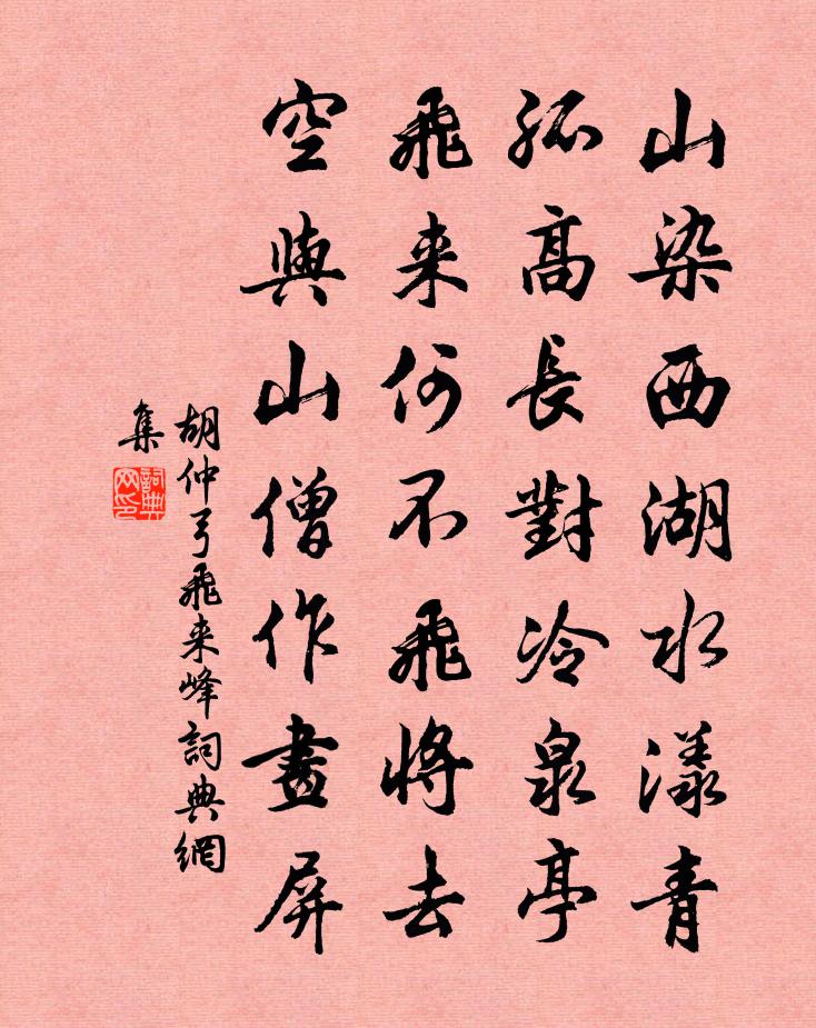 詩詞名句歷史字典書法欣賞書法字典國語詞典說文解字康熙字典古漢語字典標 題 作 者 詩 句 飛來峰作者:胡仲弓 朝代:宋代飛來峰原文山染西湖水漾青,孤高長對冷泉亭。飛來何不飛將去,空與山僧作畫屏。詩詞問答問:飛來峰的作者是誰?答:胡仲弓問:飛來峰寫於哪個朝代?答:宋代胡仲弓飛來峰書法欣賞飛來峰書法作品詩詞推薦減字木蘭花張元乾〔宋代〕客亭小會。可惜無歡容易醉。歸去更闌。細雨鳴窗一夜寒。昏然獨坐。舉世疏狂誰似我。強撥爐煙。也道今宵是上驀山溪侯置〔宋代〕玉麟春晚,綠遍甘棠蔭。可是惜花深,旋移得、翻階紅影。朱簾卷處,如在古揚州,寶瓔珞,玉盤盂,嬌艷交相映禪人寫師真請贊釋慧遠〔宋代〕普證作此像,是相故非真。虛空無背面,露柱倒生根。傍提正按低叉手,獨掇單提高打躬。佛魔削跡,凡聖泯蹤。臨江仙(宰執得旨移庖復會報勸)史浩〔宋代〕袞繡蟬聯三重客,朝回曉日曈曨。綠楊門巷擁花驄。喜承天上語,來作主人公。況值瑤林風露爽,冰輪碾上晴空。游徑山蘇軾〔宋代〕眾峰來自天目山,勢若駿馬奔平川。中途勒破千里足,金鞭玉登相迴旋。人言山住水亦住,下有萬古蛟龍淵。道昭君詞戴叔倫〔唐代〕漢家宮闕夢中歸,幾度氈房淚濕衣。惆悵不如邊雁影,秋風猶得向南飛。山丹五本盛開陳宓〔宋代〕簇簇丹葩巧作叢,開時兩月受薰風。北人見此應偷眼,未羨猩唇鶴頂紅。戲贈子仁侄楊萬里〔宋代〕小阮新來覓句忙,自攜破硯汲寒江。天公念子抄詩苦,借與朝陽小半窗。次韻陳季陵主簿秋雨陳棣〔宋代〕一雨庭蕪便許涼,掃除旱魃化驕陽。微添遠水羅襟潤,已覺疏苗玉粒香。樂歲可期寬吏責,譾才無取為詩忙。蕭蕭首尾吟邵雍〔宋代〕堯夫非是愛吟詩,詩是堯夫獨酌時。一盞兩盞至三盞,五題七題或十題。只知人事是太古,不信我身非伏義。為幸示阿泰三首陳造〔宋代〕官上依然四壁空,訟庭人寂每從容。看家不為穿窬計,老去登臨分外慵。聞雁齊己〔唐代〕瀟湘浦暖全迷鶴,邏逤川寒只有雕。誰向孤舟憶兄弟,坐看連雁度橫橋。裁縫釋慧開〔宋代〕剪斷萬絲頭,工夫已成片。針劄不入處,為渠通一線。清平調·其三李白〔唐代〕名花傾國兩相歡,常得君王帶笑看。解釋春風無限恨,沉香亭北倚闌乾。池上雙鳧薛濤〔唐代〕雙棲綠池上,朝去暮飛還。更憶將雛日,同心蓮葉間。句黃世長〔宋代〕溪上接秦頭,遠江分楚尾。春望吳錫疇〔宋代〕春事今如此,憑高興未闌。半簾疏雨過,一院落花閒。草色迷幽逕,禽聲出晚山。東風能育物,不改鬢毛斑。禪人並化主寫真求贊釋正覺〔宋代〕眉目炯炯,鬚髮蒼蒼。疏林霑野雪,古澗湛秋光。綿縫誰分梭路細,針關初透線芒長。鶴夢未曉,鳥行無章。平買挽呂東萊二首唐季淵〔宋代〕方持河汾業,雲胡不假年。斯文今已喪,此道後誰傳。秘館藏新吏,門人緝舊編。未明修短理,昂首問蒼天。雜詠一百首周堪劉克莊〔宋代〕舊{左亻右替日換心}臣學淺,晚召主恩深。莫鑒蕭張否,重來遂病瘖。名句推薦窗外日光彈指過,席間花影坐前移。施耐庵《水滸傳·第二回》 梅花散彩向空山,雪花隨意穿簾幕。王旭《踏莎行·雪中看梅花》 歲夜高堂列明燭,美酒一杯聲一曲。李頎《聽安萬善吹觱篥歌》 想到他日是那樣下場,則可以發憤矣。王永彬《圍爐夜話·第三六則》 明日隔山嶽,世事兩茫茫。杜甫《贈衛八處士》 誰信多情道,相思漸覺詩狂少。吳綺《惜分飛·寒夜》 香非在蕊,香非在萼,骨中香徹。晁補之《鹽角兒·亳社觀梅》 疏條交映,有時見日。吳均《與朱元思書》 千里孤墳,無處話淒涼。蘇軾《江城子·乙卯正月二十日夜記夢》 驚風飄白日,忽然歸西山曹植《贈徐幹詩》