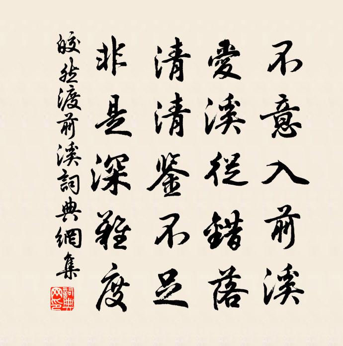 詩詞名句歷史字典書法欣賞書法字典國語詞典說文解字康熙字典古漢語字典標 題 作 者 詩 句 渡前溪作者:皎然 朝代:唐代渡前溪原文不意入前溪,愛溪從錯落。清清鑒不足,非是深難度。詩詞問答問:渡前溪的作者是誰?答:皎然問:渡前溪寫於哪個朝代?答:唐代問:渡前溪是什麼體裁?答:五古皎然渡前溪書法欣賞渡前溪書法作品注釋全唐詩:卷818-70詩詞推薦漫成三首張耒〔宋代〕閉門春風作往還,誰家有花堪醉眠。柳腰榆莢爭入眼,江梅一枝遠如天。盆池邵雍〔宋代〕三五小圓荷,盆容水不多。難非大藪澤,亦有小風波。粗起江湖趣,殊無鴛鷺過。幽人興難遏,時繞醉吟喔。泐潭雲庵偶作釋正覺〔宋代〕曦色雲庵半堵紅,霜林初暖鳥啼風。下知人在蘿窗里,瞑目爐薰百慮空。婦女之孝二十首盧元禮妻林同〔宋代〕貞孝謚已美,何堪復女宗。一朝下明詔,千載被流風。南柯子譚處端〔元代〕雲去南山靜,風來渭水寒。凌波凝結一團團。萬里晴空,清爽此時觀。雄劍鳴開匣,人頭落玉盤。一輪明月上欄桿長風沙范成大〔宋代〕夕陽明遠帆,高浪兀孤嶼。綿綿淮山來,閃閃沙鳥去。落木兩山家,炊煙南北渡。眉伸擊汰行,夢愕阻風處。贈楊教授李石〔宋代〕讀書要身榮,得祿為親喜。端知絳帳華,乃在彩衣里。冷官多澹泊,有道足甘旨。登堂四壁余,發帙照案幾。尚有題仙槎寄呈王待制白玉蟾〔宋代〕道人身世已盟鷗,便好乘雲御氣休。何足風波吾一點,盍思舟楫彼迷流。從教水擊三千里,別是煙飄十二樓。松以西江月王哲〔元代〕酒飲清光滑辣,果餐軟美香甜。兩般每日做抽添。八味依時給贍。信步六街走遍,須尋七寶妝嚴。三田九轉似銀蟾書樓司馬光〔宋代〕使君有書癖,記覽浩無涯。況此孤樓迥,端無外物嘩。橫肱欹曲幾,搔首落烏紗。此趣人誰識,長吟窗日斜。沉綿陸游〔宋代〕沉綿久未平,寂寞閉柴荊。危葉先霜墜,殘螢冒雨明。記書由默誦,得食出躬耕。此事吾親驗,方當告後生。次韻宇文使君山行陸游〔宋代〕城中鐵望西山,鐵爽氣固可鐵致。不如山中行,衣屨染濃翠。使君資格逸,鐵馬奏橫吹。平郊何曠盪,修竹亦清閟書王元之畫像側歐陽修〔宋代〕偶然來繼前賢跡,信矣皆如昔日言。諸縣豐登少公事,一家飽暖荷君恩。想公風采常如在,顧我文章不足論。名姓送外兄方卿公美赴廣東憲十絕黃公度〔宋代〕千里江山一雁聲,廣文官舍冷如冰。祈奚若未忘公舉,魏戊猶堪備內稱。題扇張鎡〔宋代〕梧竹風來玉枕涼,月高偏愛占華堂。休言境界親曾有,畫出如聞夜氣香。張昌宗徐鈞〔宋代〕乘鶴吹笙想俊游,醜聞宮掖擅風流。身膏斧躓終塵土,若比蓮花花亦羞。宮詞王仲修〔宋代〕鱗鱗鴛瓦靜無煙,六幕雲低臘雪天。應是風流學胡蝶,遇牆飛舞自翩翩。補樂府十篇夏後氏之樂歌曹勛〔宋代〕命於帝庭,纂服是膺。隨山浚川,海宇攸宇。橘花董嗣杲〔宋代〕對花懷母望雲心,不見圍棋隱者尋。晚徑風清香更醉,小亭月滿艷能侵。千林翠幄千英雪,一點瓊苞一顆金。莫問山丹花楊萬里〔宋代〕春去無芳可得尋,山丹最晚出雲林。柿紅一色明羅袖,金粉群蟲集寶簪。花似鹿匆還耐久,葉如芍藥不多深。青泥名句推薦便向夕陽影里,倚馬揮毫。納蘭性德《風流子·秋郊即事》 絮影苹香,春在無人處周晉《點絳唇·訪牟存叟南漪釣隱》 人學始知道,不學亦徒然。佚名《增廣賢文·上集》 早梅發高樹,迥映楚天碧。柳宗元《早梅》 淡淡梅花香欲染,絲絲柳帶露初乾。曹雪芹《香菱詠月·其二》 胡雁哀鳴夜夜飛,胡兒眼淚雙雙落。李頎《古從軍行》 夫輕諾必寡信,多易必多難。老子《老子·德經·第六十三章》 風淅淅,雨纖纖。難怪春愁細細添。納蘭性德《赤棗子·風淅淅》 君看蕭蕭只數葉,滿堂風雨不勝寒。李東陽《柯敬仲墨竹》 柳如眉,雲似發,鮫綃霧縠籠香雪。魏承班《漁歌子·柳如眉》