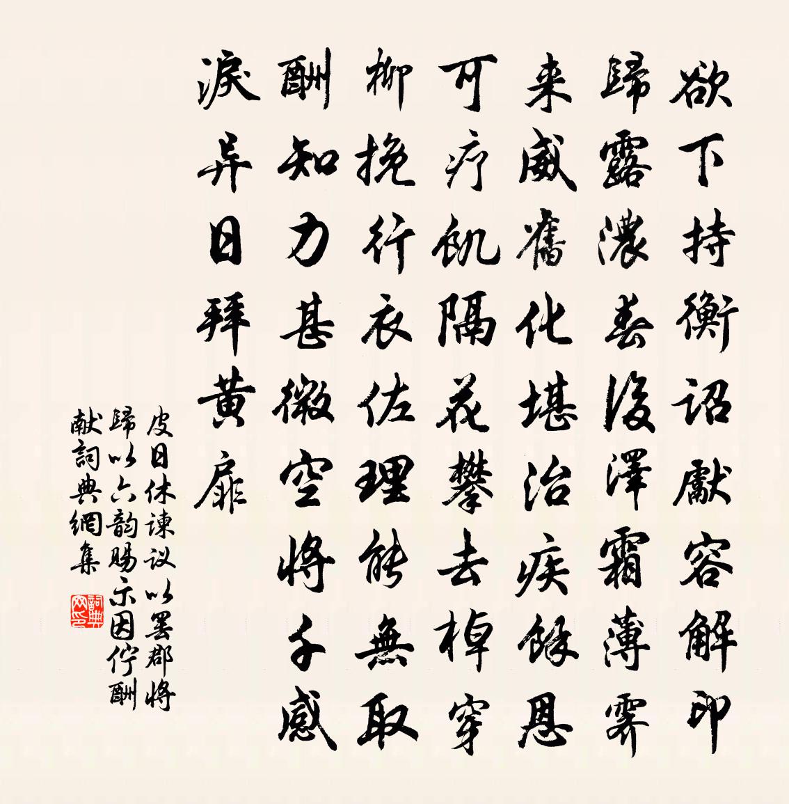 詩詞名句歷史字典書法欣賞書法字典國語詞典說文解字康熙字典古漢語字典標 題 作 者 詩 句 諫議以罷郡將歸以六韻賜示,因佇酬獻作者:皮日休 朝代:唐代原文欲下持衡詔,先容解印歸。露濃春後澤,霜薄霽來威。舊化堪治疾,余恩可療飢。隔花攀去棹,穿柳挽行衣。佐理能無取,酬知力甚微。空將千感淚,異日拜黃扉。詩詞問答問:《諫議以罷郡將歸以六韻賜示,因佇酬獻》的作者是誰?答:皮日休問:該詩寫於哪個朝代?答:唐代書法欣賞諫議以罷郡將歸以六韻賜示,因佇酬獻書法作品注釋全唐詩:卷612-28詩詞推薦珍林張鎡〔宋代〕李棗栗銀杏,橙梨柿木瓜。楊梅與金橘,不讓滿園花。和方虛谷豫章徐子蒼沿制檄抵秋浦張道洽〔宋代〕詞林日凋疎,生意不復新。慎勿大崛奇,崛奇驚恨人。玉堂老仙坡,過海走一巡。非天寔罰之,語言累其身。官舟上富池二首董嗣杲〔宋代〕荒舟可隘守,難供渺茫泛。忽罹風水高,愁睹帆腳蘸。涼薄有身紀,平白慮此隱。聞說所僑地,晝夜演空梵。歲除即事十首劉克莊〔宋代〕草市芳菲節,柴門寂寞濱。桃符聊塞白,免謗作詩人。賀南谷兄與男孫同科趙與辟〔宋代〕暮年驥足聘青雲,更喜文星耀一門。觀榜同登父與子,策名重見祖和孫。偶然盛事酬先志,賸有奇芳在後昆。我亦送傑上人歸成都陸游〔宋代〕錦城一別鬢成絲,今日山陰送傑師。亂絮飛花撲行路,正如東郭放船時。直講周歲宋祁〔宋代〕本自悲涼葆發多,何緣末至濫中阿。馬肝不食非論味,狗曲猶輕枉為歌。舊學空疏緣病廢,壯情牢落伴年過。終然偈頌三十四首釋如淨〔宋代〕大地平沈,側布黃金。虛空透闊,高架枬檀。依稀馬廄,仿佛牛欄。鶻眼鷹眼不許看。贈柳三解晁說之〔宋代〕桃李那知楊柳恨,故時風雨不依依。自從彭澤無人後,青眼雖開心事非。桂殿秋劉翰〔宋代〕青帝子,碧蓮宮。不駕雲車騎白龍。瑤池路遠羽衣濕,玉珮泠泠明月中。用清秋鶴髮翁韻賦小書招潔堂馬廷鸞〔宋代〕幽居抱孤明,懷古思舊京。渴望寶連山,老桂不勝清。十一月二日至紫極宮誦李白詩及坡谷和篇因念劉克莊〔宋代〕翰林兩仙人,偶來聽鳳竹。蕭蕭玉千竿,采采綠一掬。少時負不群,中歲乃見觸。嗟余長十年,所至戀三宿。徑當又輓詞三首傅察〔宋代〕遺子一經足,成家五福並。千鍾欣祿養,萬石仰榮名。日射銘旌字,風傳袞鐸聲。遙知開吉地,不假問三生。金錯刀(一名醉瑤瑟)馮延巳〔唐代〕雙玉斗,百瓊壺,佳人歡飲笑喧呼。麒麟欲畫時難偶,鷗鷺何猜興不孤。歌婉轉,醉模糊,高燒銀燭臥流蘇。只銷示董伯懿王安石〔宋代〕穿橋度塹只閒行,詠石嘲花亦漫成。嚼蠟已能忘世味,畫脂那更惜時名。長乾里北寒山紫,白下門西野水明。此地雨作,抵暮復晴五首楊萬里〔宋代〕清平如席是淮流,風起雷奔怒不休。一浪飛來驚落膽,早知秪要打船頭。義蜂行戴表元〔宋代〕山翁愛蜂如愛花,山蜂營密如營家。蜂營密成蜂自食,翁亦藉密裨生涯。每當山蜂採花出,翁為守關司徼遮。朝朝偶書警俗王邁〔宋代〕大雅吾無望古人,有常猶愈翟公門。貪榮但可驕妻妾,死義方堪托子孫。董生雞哺寧求報,元了雉媒莫少恩。俗物茅茨釋文珦〔宋代〕茅茨住得安,何必府潭潭。省禍由知足,防心在不貧。衣荷同纊暖,食櫱比飴甘。清苦人休訝,山翁已慣諳。玉龍子詩天寶時人〔唐代〕聖運潛符瑞玉龍,自興雲雨更無蹤。不如渭水沙中得,爭保鑾輿復九重。名句推薦春眠不覺曉,處處聞啼鳥。孟浩然《春曉》 仙苑春濃,小桃開,枝枝已堪攀折。阮逸女《花心動·春詞》 女大不中留。馮夢龍《警世通言·卷三十八》 一日不見,如三月兮。佚名《子衿》 肉腐出蟲,魚枯生蠹。荀子《荀子·勸學》 強自取柱,柔自取束。荀子《荀子·勸學》 塵緣一點,回首西風又陳跡。吳文英《六么令·夷則宮七夕》 夜長爭得薄情知,春初早被相思染。姜夔《踏莎行·自沔東來》 生而富者驕,生而貴者傲。范曄《後漢書·列傳·崔駰列傳》 語之所貴者意也,意有所隨。意之所隨者,不可言傳也。莊子《莊子·外篇·天道》