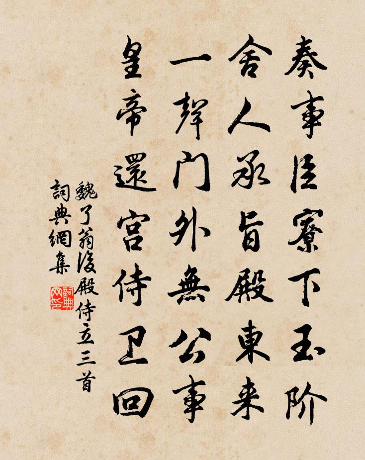 詩詞名句歷史字典書法欣賞書法字典國語詞典說文解字康熙字典古漢語字典標 題 作 者 詩 句 後殿侍立三首作者:魏了翁 朝代:宋代後殿侍立三首原文奏事臣寮下玉階,舍人承旨殿東來。一聲門外無公事,皇帝還宮侍衛回。詩詞問答問:後殿侍立三首的作者是誰?答:魏了翁問:後殿侍立三首寫於哪個朝代?答:宋代魏了翁後殿侍立三首書法欣賞後殿侍立三首書法作品詩詞推薦酬盧汀諫議姚合〔唐代〕粟如流水帛如山,依念倉邊語笑間。篇什縱橫文案少,親朋撩亂吏人閒。杯觴引滿從衣濕,牆壁書多任手頑。遙賀醉蓬萊(林鐘商)柳永〔宋代〕漸亭皋葉下,隴首雲飛,素秋新霽。華闕中天,鎖蔥蔥佳氣。嫩菊黃深,拒霜紅淺,近寶階香砌。玉宇無塵,金莖別智玄法師李商隱〔唐代〕雲鬢無端怨別離,十年移易住山期。東西南北皆垂淚,卻是楊朱真本師。織女圖薩都剌〔元代〕蘭閨織錦秦川女,大姬啞啞弄機杼。小姬織倦何所思?簾幕無人燕雙語。成都花發江水春,門前馬嘶車轔轔。髻鬟彭蠡湖中望廬山孟浩然〔唐代〕太虛生月暈,舟子知天風。掛席候明發,眇漫平湖中。中流見匡阜,勢壓九江雄。黤黕容霽色,崢嶸當曉空。香爐頌古一○一首釋子淳〔宋代〕雖然答盡深深意,爭奈投機句未親。欲曾本來無垢的,更須入水見長人。題李伯照夜白馬圖蔡肇〔宋代〕天上房星不下來,連山芻粟飽駑駘。龍姿逸駕飛騰盡,賴爾毫端力拘回。寄楊八壽州劉禹錫〔唐代〕風獵紅旗入壽春,滿城歌舞向朱輪。八公山下清淮水,千騎塵中白面人。桂嶺雨餘多鶴跡,茗園晴望似龍鱗。聖朝和吟友月夜遇風雨不見薄蝕韻衛宗武〔宋代〕麟經紀載浩歲月,天家妖祥互分別。所書薄蝕三十六,獨於黑夜泯無說。豈以為陽義所崇,可略者陰辭遂轟。曩年念奴嬌(二首催雪)朱淑真〔宋代〕冬晴無雪。是天心未肯,化工非拙。不放玉花飛墮地,留在廣寒宮闕。雲欲同時,霰將集處,紅日三竿揭。六花翦木蘭花/玉樓春莫將〔宋代〕尋梅莫背東風路。路在花前知去處。真香破鼻驀然聞,試問幽叢知幾步。多情更被無寒助。萬物枯時神物護。一枝一枝花 藥方王處一〔元代〕普勸門中友。妙藥時人有。先師親說下,與君修。一味真心,系縛休教走。柔弱為引子,低下服之,論甚食前食後入劍門戎昱〔唐代〕劍門兵革後,萬事盡堪悲。鳥鼠無巢穴,兒童話別離。山川同昔日,荊棘是今時。征戰何年定,家家有畫旗。寄行簡白居易〔唐代〕鬱郁眉多斂,默默口寡言。豈是願如此,舉目誰與歡。去春爾西征,從事巴蜀間。今春我南謫,抱疾江海壖。相去西湖二首葛紹體〔宋代〕楊柳芙蓉舊日栽,近來堂宇更安排。湖光接得全天趣,莫遣遊人鼓吹來。聰大師號無聞送廣福住院釋心月〔宋代〕來日台山大會齋,隔身句子絕安排。如今已落無聞手,雙放雙收機莫偕。遠遊杜甫〔唐代〕賤子何人記,迷芳著處家。竹風連野色,江沫擁春沙。種藥扶衰病,吟詩解嘆嗟。似聞胡騎走,失喜問京華。晚晴姜特立〔宋代〕草木肥梅雨,江山快晚晴。芳塘荷芰發,香泛葛衣輕。句辛棄疾〔宋代〕身為參禪老,家因赴詔貧。燭影搖紅(元宵)程珌〔宋代〕青旆搖風,朱簾漏月黃昏早。蓬山萬疊忽蜚來,上有千燈照。和氣祥煙繚繞。映瓊樓、五雲縹緲。青裙縞袂,亂吹名句推薦野雲萬里無城郭,雨雪紛紛連大漠。李頎《古從軍行》 彩扇紅牙今都在,恨無人、解聽開元曲。蔣捷《賀新郎·夢冷黃金屋》 去年花里逢君別,今日花開已一年。韋應物《寄李儋元錫》 何用慰相思,裁書寄關右。李益《送諸暨王主簿之任》 念去來、歲月如流,徘徊久、嘆息愁思盈。周邦彥《綺寮怨·上馬人扶殘醉》 石欄斜點筆,桐葉坐題詩杜甫《重過何氏五首》 處事要代人作想,讀書須切己用功。王永彬《圍爐夜話·第五則》 夫為將之道,必順天、因時、依人以立勝也。諸葛亮《將苑·卷一·智用》 泛樓船兮濟汾河,橫中流兮揚素波。劉徹《秋風辭》 百王之無變,足以為道貫。一廢一起,應之以貫,理貫不亂。不知貫,不知應變。荀子《荀子·天論》
