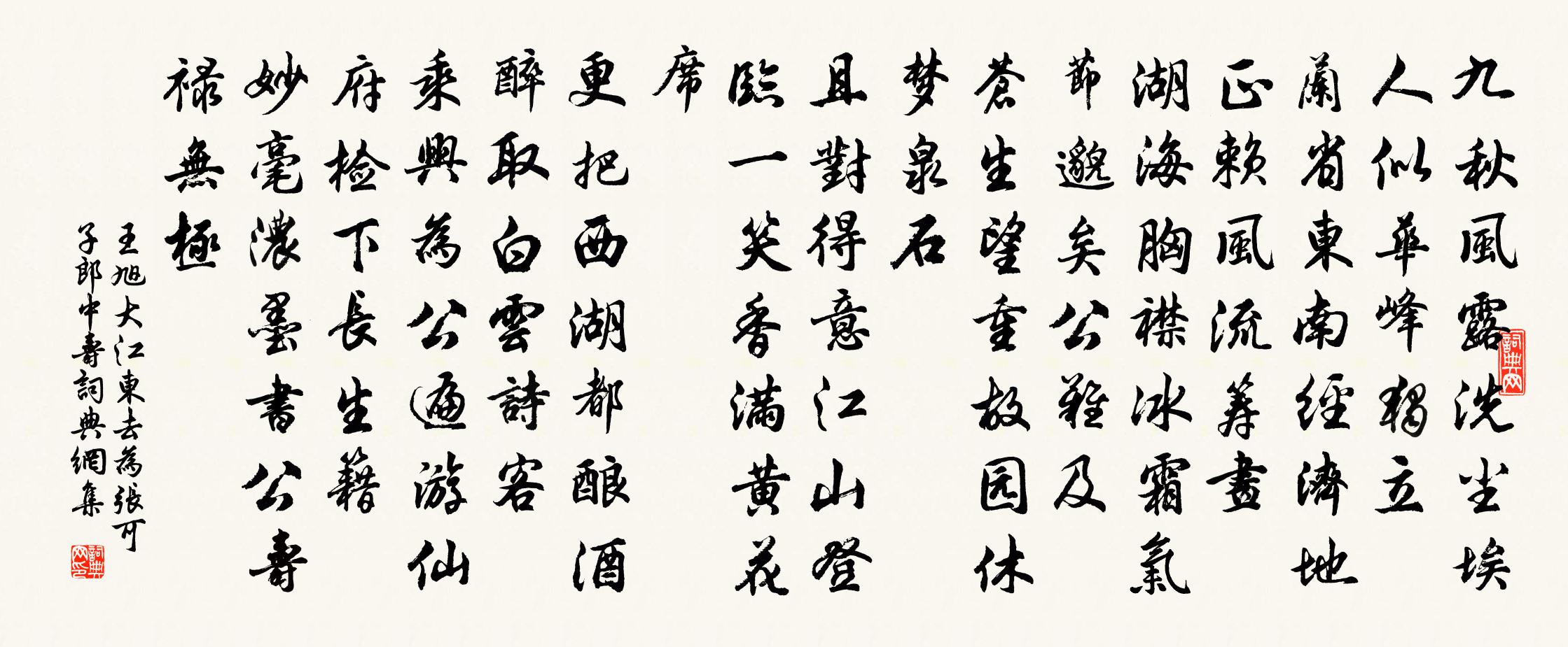 詩詞名句歷史字典書法欣賞書法字典國語詞典說文解字康熙字典古漢語字典標 題 作 者 詩 句 大江東去 為張可子郎中壽作者:王旭 朝代:元代大江東去 為張可子郎中壽原文九秋風露,洗塵埃、人似華峰獨立。蘭省東南經濟地,正賴風流籌畫。湖海胸襟,冰霜氣節,邈矣公難及。蒼生望重,故園休夢泉石。且對得意江山,登臨一笑,香滿黃花席。更把西湖都釀酒,醉取白雲詩客。乘興為公,遍遊仙府,檢下長生籍。妙毫濃墨,書公壽祿無極。詩詞問答問:大江東去 為張可子郎中壽的作者是誰?答:王旭問:大江東去 為張可子郎中壽寫於哪個朝代?答:元代問:大江東去 為張可子郎中壽是什麼體裁?答:詞王旭大江東去 為張可子郎中壽書法欣賞大江東去 為張可子郎中壽書法作品詩詞推薦以使事過成都訖事而歸虞萬州成都尉高表史拉魏了翁〔宋代〕檐卜風清醉騎香,滿身花影踏斜陽。行花盡處山圍郭,又聽松風吹客裳。送吳黯赴闕晁補之〔宋代〕我初官此君未來,君今去此我未往。翻飛豈不慕緬邈,留滯何能悲鞅掌。學道平生昧蹊徑,半世端如走榛莽。古人彭及之邀吳仲源楊公濟與某夜會望湖樓獨某後強至〔宋代〕諸公愛月欲狂顛,腳踏花欄手襞箋。那作常時揮彩筆,直須飛句上青天。豈無劇笑驚山叟,應有妍詞調水仙。獨我再用前韻蘇軾〔宋代〕朱顏發過如春醅,胸中梨棗初未栽。丹砂未易掃白髮,赤松卻欲參黃梅。寒溪本自遠公社,白蓮翠竹依崔嵬。當時點絳唇(和訪梅)劉辰翁〔宋代〕一雪蹉跎,蹇驢不載吟鞭去。夜聽春雨。踏雪差無苦。待得花晴,總是遊人處。梅應許。小橋延佇。蜂蝶先成路。賞牡丹王建〔唐代〕此花名價花別,開艷花益皇都。花香遍苓菱死,紅燒躑躅枯。軟光籠細脈,妖色暖鮮膚。滿蕊攢黃粉,含棱縷絳蘇題畫雲山團扇張鎡〔宋代〕若個大圓鏡,處處山河影。誰謂懶拙翁,而能作斯景。繄予說是語,未免臚窺井。若解目前機,水應言不領。沁園春陳人傑〔宋代〕石城之勝,班班在目,而平淮如席,亦橫陳樽俎間。既而北歷淮山,自齊安溯江泛湖,薄游巴陵,又得登岳陽樓,假節宋祁〔宋代〕誤持軍印攝中牙,朔雪添成兩鬢華,大抵不侯寧戰罪,由來寡要是儒家。山南近暖先迎日,樹北緣寒晚作花。歲晏哀蜀人為南蠻俘虜五章。過大渡河蠻使許之泣望鄉國雍陶〔唐代〕大渡河邊蠻亦愁,漢人將渡盡回頭。此中剩寄思鄉淚,南去應無水北流。夜分趙希邁〔宋代〕夜分天籟寂,誰與共襟期。童子醉眠處,老夫吟苦時。雲黏蒼蘚石,月掛老松枝。一鶴來何處,相從立水湄。和史魏公荔枝韻釋寶曇〔宋代〕炎州草木誠可憐,荔枝六月生蠻煙。瞿聃不出盛明世,星斗一粲黃昏天。憧憧翠蓋下平地,井井絳幘羅群仙。囊封別魯頌李白〔唐代〕誰道泰山高,下卻魯連節。誰雲秦軍眾,摧卻魯連舌。獨立天地間,清風灑蘭雪。夫子還倜儻,攻文繼前烈。錯落秋居法華寺下院望高頂贈如獻上人皎然〔唐代〕峰色秋天見,松聲靜夜聞。影孤長不出,行道在寒雲。卜運算元止禪師〔宋代〕書是玉關來,淚向松江墮。梅自飄香柳自青,嘹唳征鴻過。沙漠暗塵飛,嵩獄愁雲鎖。淮上千營夜枕戈,此恨憑誰清平樂(宮詞)黃升〔宋代〕深深禁篽。霽日明鶯羽。風動槐龍交翠舞。恰恰花陰亭午。一簾暖絮悠揚。金爐旋炷沈香。天子方看諫疏,內人休讀崔昭緯傳張嵲〔宋代〕季末慆憂事可嗟,本根已撥尚肥家。那堪事異荀文若,空費君王十四車。分韻賦古松得青字劉子翬〔宋代〕風韻颼颼遠更清,蒼髯瘦甲聳亭亭。連根欲斗岩巒力,一蓋常涵雨露背。曾映月明留鶴宿,近經雷霹帶龍腥。衰殘月台項安世〔宋代〕小築南台倚北亭,一方荊玉可雲屏。峽中暮雨賞疏月,秋後天河始見星。初與羿妃為此會,自開夔子幾千齡。我雖偈頌二百零五首釋正覺〔宋代〕佛身性光明了無性垢,性水清性淨常不渾性。降生沐浴吉祥事,要以大開功德門。哆哆和和增口業,膠膠綴綴添塵名句推薦公生明,偏生暗荀子《荀子·不苟》 春色滿園關不住,一枝紅杏出牆來。葉紹翁《遊園不值》 白日地中出,黃河天外來。張蠙《登單于台》 余亦赴京國,何當獻凱還。孟浩然《送陳七赴西軍》 淡泊以明志,寧靜而致遠。羅貫中《三國演義·第三十七回》 持而盈之,不如其已。揣而銳之,不可長保。金玉滿堂,莫之能守。富貴而驕,自遺其咎。功成身退,天之道。老子《老子·道經·第九章》 昨夜狂風度,吹折江頭樹李白《長干行二首》 但願蒼生俱飽暖,不辭辛苦出山林。于謙《詠煤炭》 雙槳來時,有人似、舊曲桃根桃葉。姜夔《琵琶仙·雙槳來時》 殘雪庭陰,輕寒簾影,霏霏玉管春葭。王沂孫《高陽台·和周草窗寄越中諸友韻》