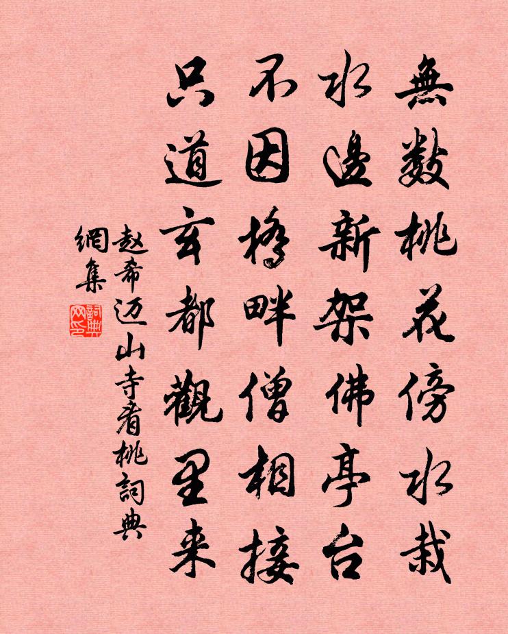詩詞名句歷史字典書法欣賞書法字典國語詞典說文解字康熙字典古漢語字典標 題 作 者 詩 句 山寺看桃作者:趙希邁 朝代:宋代山寺看桃原文無數桃花傍水栽,水邊新架佛亭台。不因橋畔僧相接,只道玄都觀里來。詩詞問答問:山寺看桃的作者是誰?答:趙希邁問:山寺看桃寫於哪個朝代?答:宋代趙希邁山寺看桃書法欣賞山寺看桃書法作品詩詞推薦自嘆文天祥〔宋代〕長安不可詣,何故會皋亭。倦鳥非無翼,神龜弗自靈。乾坤增感慨,身世付飄零。回首西湖曉,雨餘山更青。東堂獨坐懷琳老二首毛滂〔宋代〕聞道年來多掩關,高情定滿渺瀰間。秋風不怕清難忍,曉日應分暖伴閒。欲喚扁舟弄雲水,已疑小閣厭溪山。東堂秋氣尚高涼林披〔唐代〕秋氣尚高涼,寒笛吹萬木。故人入我庭,相照不出屋。山川雖遠觀,高懷不能掬。卜運算元 和師韻馬鈺〔元代〕業重多思算。豈悟爻和象。深謝風仙特地來,便把頑遇喚。忿怒常思難。性燭須教燦。真樂真歡散盡愁,師弟常為吳下同年會詩章澥〔宋代〕咫尺天顏只暫違,兩台聯桂世誠稀。共觀鵬運垂雲舉,還幸魚寒密藻依。賦政將明仲山甫,登樓吟詠謝玄暉。要津忠顯劉公輓詩二首李彌遜〔宋代〕禍基媒櫱自燕雲,搞議如公有幾人。軍旋未聞焉用試,豺狼不噬豈宜親。求魚緣木謾蠹國,曲突徙薪翻殞身。才大華山畿·相送勞勞渚佚名〔南北朝〕相送勞勞渚,長江不應滿,是儂淚成許。彭祖井(一本題上有奉和王相公五字)皇甫冉〔唐代〕上公旌節在徐方,舊井莓苔近寢堂。訪古因知彭祖宅,得仙何必葛洪鄉。清虛不共春池竟,盥漱偏宜夏日長。聞道贈從弟弘元謝靈運〔南北朝〕緬邈荊巫。杳翳江湍。三千既曠。繇役實難。想像微景。延佇音翰。因雲往情。感風來嘆。梁冀二首宋庠〔宋代〕外戚豪華善意錢,折巾平幘映鳶肩。支期一世惟偷寵,虛秉東京跋扈權。武夷九曲棹歌留元剛〔宋代〕五曲雲崖有許深,石門書屋著修林。堂堂不泯清風在,一片寒潭印我心。謝賜飛白書鄭獬〔宋代〕伏馹馳天闕,飛文下玉除。奎成蒼頡字,龍受伏羲書。功業昇平外,文章妙絕初。形聲秦隸拙,點畫蔡邕疏。軸動虞察院生日姜特立〔宋代〕鋤纇除荒政若神,俗安民靖絕紛紜。清宵不見犬吠盜,綠野更無羊敗群。題許宣平南山故居方回〔宋代〕一庵依舊翠微中,身在蓬萊第幾宮。羽衛夜歸人不識,滿山松檜響清風。東山堂趙汝回〔宋代〕謝守登臨地,今為博士居。由來好山水,常得近詩書。洞與銜岳接,泉分玉井余。年年為吟事,春草不教鋤。和陶詠貧士七首吳芾〔宋代〕光景如春花,身世似秋蓬。淵明洞此理,養拙不求工。上獨思四皓,下獨友兩龔。出處呻或異,心跡亦略同。安貧送僧歸豫章省親釋正覺〔宋代〕賓繭風枝夢不寧,夜堂思對老人星。一心歸去事萱草,千里相求鳴鶺鴒。樹樹丹楓金墮葉,叢叢黃葉雪浮汀。西山別馮伯昭新放歸三榮末句乞呈似使君王萬里年程公許〔宋代〕東郭滄江市橋柳,邂逅論心成二友。仙曹如不往復來,永書論文間卮酒。十五年間如掣電,屋樑落月幾回首。愛君自勉陸游〔宋代〕曩歲讀隱書,妄意慕陶葛,芝房及乳石,日夜躬采掇。飛舉固未能,死籍或可脫。那知事大謬,發齒將禿豁。神僊方釣隱挾星學求詩且業醫何夢桂〔宋代〕駢拇不礙履,枝指不害持。兩者各自適,意其天所為。決之足反蹇,齕之手反萎。萬物固有命,勸君休說醫。名句推薦改章難於造篇,易字艱於代句劉勰《文心雕龍·附會》 漠漠水田飛白鷺,陰陰夏木囀黃鸝。王維《積雨輞川莊作 / 秋歸輞川莊作》 一日不讀書,胸臆無佳想。蕭掄謂《讀書有所見作》 軍氣橫大荒,戰酣日將入。王昌齡《從軍行二首》 多言數窮,不如守中。老子《老子·道經·第五章》 黃河西來決崑崙,咆哮萬里觸龍門。李白《公無渡河》 佳期大堤下,淚向南雲滿李白《大堤曲》 棠梨葉落胭脂色,蕎麥花開白雪香。王禹偁《村行·馬穿山徑菊初黃》 用兵之道,先勝後戰。陳壽《三國志·魏書·荀彧攸賈詡傳》 唯仁者能好人,能惡人。孔子弟子《論語·雍也篇》