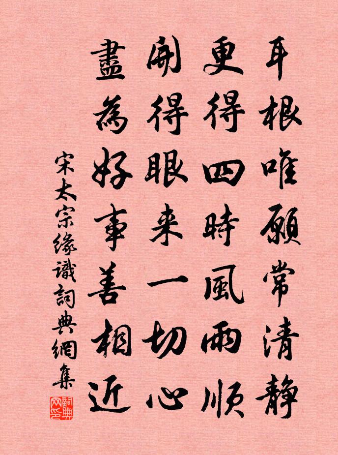 詩詞名句歷史字典書法欣賞書法字典國語詞典說文解字康熙字典古漢語字典標 題 作 者 詩 句 緣識作者:宋太宗 朝代:宋代緣識原文耳根唯願常清靜,更得四時風雨順。開得眼來一切心,盡為好事善相近。詩詞問答問:緣識的作者是誰?答:宋太宗問:緣識寫於哪個朝代?答:宋代宋太宗緣識書法欣賞緣識書法作品詩詞推薦知府石太尉閒抱瑤琴榮臨圭竇燒筍供膳刻竹題魏野〔宋代〕分茆人忽到茅齋,踏破溪邊萬點苔。卻恐歌鐘喧靜境,隨軒祇背古琴來。題九歌圖章甫〔宋代〕大夫放逐沅湘濱,嘗作九歌祠鬼神。鬼神幽遠不可見,餚酒芬芳猶福人。餐菊佩蘭君不識,從彼讒人為鬼蜮。楚江雜言寇準〔宋代〕我徒曠達由胸臆,恥學鯫生事文墨。蛟龍長欲趁風雷,騏驥焉能制銜勒。鏘金佩玉良有時,丐色諛言盡虛飾。功名王逢原二首陳造〔宋代〕文章俯睨漢唐餘,屬思深湛到古初。正使玉樓須有記,忍令銀筆嗣無書。偈頌七十六首釋師觀〔宋代〕開池不待月,池成月自來。寒山逢拾得,拊掌笑咍咍。別雷國輔之皖山王安石〔宋代〕侍郎憂國最賢勞,太尉西州第一豪。家廟比來聞澤厚,公孫今果見才高。明時尚使龍蛇蟄,壯志空傳虎豹韜。莫厭石塘歌呈吳侍郎王奕〔宋代〕誰剜太素一拳石,石殼皴皺涵芳塘。塘中清淑族查滓,積成土塊如浮航。三千界分有南贍,休王帝伯更皇王。堯衢仗錫寺戴表元〔宋代〕仙草漫漫路不分,鍾魚那許外間聞。涼天九月已飛雪,晴日西山猶帶雲。火後客夸新屋樣,兵前僧惜舊碑文。藤湖戲作盆池四於和青堂曾幾〔宋代〕陂湖春盡水茫茫,收拾波濤入小塘。睡起微涼馥荷氣,雨餘斜日麗萍光。聊為堂下龜魚主,少退階前雁鶩行。只欠寄李元叔王洋〔宋代〕北台御史共推貧,飢走三吳幾閱春。襦袴遠聞歌政績,江山應復助詩神。鄉尊耆舊多遺事,地有神山得近鄰。料得苦熱行齊己〔唐代〕離宮劃開赤帝怒,喝出六龍奔日馭。下土熬熬若煎煮,蒼生惶惶無處處。火雲崢嶸焚泬寥,東皋老農腸欲焦。何當用徐編修德夫韻其開藩旴江二首王邁〔宋代〕幾年泉谷養靈根,一立朝班敢盡言。鏁制玉麟辭紺殿,符分金虎坐轅門。郡條上日新施設,民瘼微時預討論。勿鄙贈外魏氏〔唐代〕浮萍依綠水,弱蔦寄青松。與君結大義,移天得所從。翰林無雙鳥,劍水不分龍。諧和類琴瑟,堅固同膠漆。義重和丹客林公曹勛〔宋代〕自念老境今枯楊,徒順和輩求藥方。頗聞大藥性炎燥,如燎於原其中藏。是非海里石鼎煎,大藥何適求雲仙。但傳句崔鶠〔宋代〕一從台傾苑樹死,空餘飄瓦裁紋鴛。送子上弟赴郴州,史君羅達甫寺正之招楊萬里〔宋代〕郴山奇變水清寫,郴江幸繞郴山下。韓秦妙語久絕弦,誰煎鳳觜續此篇。君章詞客山水主,雲錦聘君君好赴。為尋宴交代楊寺丞樂語口號牟巘五〔宋代〕眉間黃色喜浮浮,天遣鸞皇為相攸。新綰絲綸歸右掖,舊遊泉石記南州。春風自滿甘棠國,曉雪初晴杜若洲。樂飲村人學解嘲人語佚名〔宋代〕綿絹,割兩耳,只有面。明道親享先農十首佚名〔宋代〕稼政之本,民食惟天。甫田兆幾,后稷其先。靈壇既祀,黛耜攸虔。乃聖能享,億萬斯年。十月八日九日連夕雷雨陸游〔宋代〕雨聲聒耳不停點,雲氣冒山殊未開。敢恨終年惟短褐,但驚十月有奔雷。牽蘿且復補茆屋,飯豆何妨羹芋魁。莫笑名句推薦江豚吹浪立,沙鳥得魚閒。薛時雨《臨江仙·大風雨過馬當山》 借問此何時?春風語流鶯。李白《春日醉起言志》 月色穿簾風入竹,倚屏雙黛愁時。顧敻《臨江仙·月色穿簾風入竹》 賴其力者生,不賴其力者不生。墨子《墨子·32章 非樂(上)》 欲往從之雪雰雰,側身北望涕沾巾。張衡《四愁詩》 猶憐慣去國,疑是夢還家。盧僎《歲晚還京台望城闕成口號先贈交親》 團扇,團扇,美人病來遮面。王建《宮中調笑·團扇》 琅琅新雨洗湖天,小景六橋邊。張可久《風入松·九日》 紫黯紅愁無緒,日暮春歸甚處?龔自珍《如夢令·紫黯紅愁無緒》 君家玉女從小見,聞道如今畫不成。黃庭堅《謝張仲謀端午送巧作》
