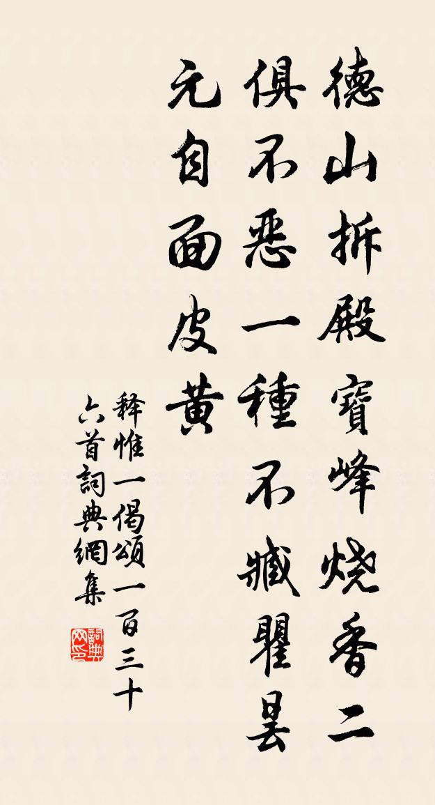 詩詞名句歷史字典書法欣賞書法字典國語詞典說文解字康熙字典古漢語字典標 題 作 者 詩 句 偈頌一百三十六首作者:釋惟一 朝代:宋代偈頌一百三十六首原文德山拆殿,寶峰燒香。二俱不惡,一種不臧。瞿曇元自麵皮黃。詩詞問答問:偈頌一百三十六首的作者是誰?答:釋惟一問:偈頌一百三十六首寫於哪個朝代?答:宋代釋惟一偈頌一百三十六首書法欣賞偈頌一百三十六首書法作品詩詞推薦採桑行顧禧〔宋代〕長安富貴家,上錦下襦,作苦不知。導引洪适〔宋代〕重華天子,長至奉神虞。九奏會軒朱。星暉雲潤東方曉,拜貺竹宮初。歸來千乘護皇輿。瑞景集金鋪。雞竿高唱恩詠菊朱元璋〔明代〕百花發時我不發,我若發時都嚇殺。要與西風戰一場,遍身穿就黃金甲。十月十日蔡鉉升載酒飲我於病榻,練江、南枝杜濬〔清代〕擬上籃輿散百憂,素交排闥且淹留。情親各出三年字,身老猶憐一日秋。客舍自晴黃葉雨,鐘山不動白雲遊。持螯問李二司直所居雲山皇甫冉〔唐代〕門外水流何處?天邊樹繞誰家?山色東西多少?朝朝幾度雲遮。冬至日寄小侄阿宜詩杜牧〔唐代〕小侄名阿宜,未得三尺長。頭圓筋骨緊,兩眼明且光。去年學官人,竹馬繞四廊。指揮群兒輩,意氣何堅剛。今年和前人韻辛棄疾〔宋代〕茶瓜不作片時留,又向悠然作勝游。花徑似經新掃酒,竹林喚起舊風流。天教有象皆楷寫,世已無書可校讐。長日十六夜月朱慶餘〔唐代〕昨夜忽已過,冰輪始覺虧。孤光猶不定,浮世更堪疑。影落澄江海,寒生靜路岐。皎然銀漢外,長有眾星隨。史局坐寢戲呈崇文掌學士韓維〔宋代〕閒官身散誕,飽食坐欹斜。永日槐陰靜,清風葆鬢華。廢書良愧馬,落帽偶同嘉。此適誰知者,逢人莫浪夸。農桑陸游〔宋代〕水長人家浸稻秧,蠶生女手摘桑黃。差科未起身無事,鄰曲相過日正長。奉和御製讀陳書夏竦〔宋代〕猛奴多勇概,大矟事戎征。新蔡凶圍陷,魚梁寇壘傾。遡風輕古法,問道貴奇兵。懋賞宜開府,番禺已盡平。生朝文天祥〔宋代〕客中端二日,風雨送牢愁。昨歲猶潘母,今年更楚囚。田園荒吉水,妻子老幽州。莫作長生祝,吾心在首丘。寄崇福主澤南洲陳著〔宋代〕天地中閒澒洞塵,山林須是好三分。危時安飯僧家鼓,濁世清風相國墳。老後重來如夢見,靜中自韻以心聞。同游醜奴兒/採桑子陳亮〔宋代〕黃昏山驛銷魂處,枝亞疏籬。枝亞疏離。醞藉香風蜜打圍。隔籬雞犬誰家舍,門掩斜暉。門掩斜暉。花落花開總不題表丈三大夫書齋楊巨源〔唐代〕盛府自蓮花,群公是歲華。蘭姿丈人圃,松色大夫家。素卷堆瑤席,朱弦映絳紗。詩題三百首,高韻照春霞。曉雲峰朱元升〔宋代〕旱天無覓處,曉雲此無數。只消一縷飛,亦可作甘露。塞上(一作盧綸詩,題作從軍行)李端〔唐代〕二十在邊城,軍中得勇名。卷旗收敗馬,占磧擁殘兵。覆陣烏鳶起,燒山草木明。塞閒思遠獵,師老厭分營。雪嶺賢者之孝二百四十首霍去病林同〔宋代〕不早知此體,元來托大人。低頭拜縣吏,誰擬霍將軍。醉蓬萊蘇軾〔宋代〕笑勞生一夢,羈旅三年,又還重九。華發蕭蕭,對荒園搔首。賴有多情,好飲無事,似古人賢守。歲歲登高,年年謁吳公路許借論衡復留一日戲作洪邁〔宋代〕幽獨不自得,駕言款齋廬。殷勤主人情,投轄恐回車。轄亦不須投,此去將焉如。惟憂酒錢盡,使吾詩腸枯。會合名句推薦風吹古木晴天雨,月照平沙夏夜霜。白居易《江樓夕望招客》 微雨眾卉新,一雷驚蟄始。韋應物《觀田家》 鳥銜野田草,誤入枯桑里。李白《樹中草》 止謗莫如修身徐幹《中論·上卷·虛道》 視其所以,觀其所由,察其所安,人焉廋哉?人焉廋哉?孔子弟子《論語·為政篇》 憶昔午橋橋上飲,坐中多是豪英。陳與義《臨江仙·夜登小閣憶洛中舊遊》 盤飧市遠無兼味,樽酒家貧只舊醅。杜甫《客至》 勿言草卉賤,幸宅天池中沈約《詠新荷應詔》 修身以敬,勿托以尊。房玄齡《晉書·列傳·第八章》 萬里中原烽火北,一尊濁酒戍樓東。張孝祥《浣溪沙·霜日明霄水蘸空》