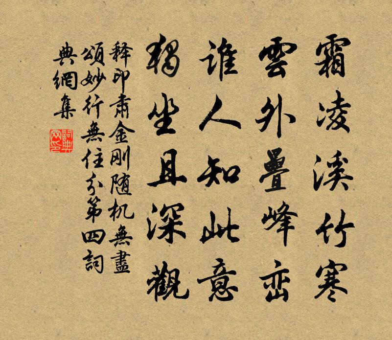 詩詞名句歷史字典書法欣賞書法字典國語詞典說文解字康熙字典古漢語字典標 題 作 者 詩 句 金剛隨機無盡頌妙行無住分第四作者:釋印肅 朝代:宋代原文霜凌溪竹寒,雲外疊峰巒。誰人知此意,獨坐且深觀。詩詞問答問:《金剛隨機無盡頌妙行無住分第四》的作者是誰?答:釋印肅問:該詩寫於哪個朝代?答:宋代書法欣賞金剛隨機無盡頌妙行無住分第四書法作品詩詞推薦明上座贊釋心月〔宋代〕大庾嶺頭提不起,本來面目尚埃塵。南枝不放春訊息,也是茫茫漏網人。如夢令許有壬〔元代〕老子風神清灑。好句自然傳寫。立雪賦梅花,更折綠條成把。閒雅。閒雅。莫道吉人辭寡。曾著作之父文恩判院輓詩項安世〔宋代〕忍窮能到骨,何物可愁翁。守口雙奩靜,抄書萬卷空。朝天尊粟氏,勝地說壺公。脫屣俱無滯,斑衣淚自紅。寄答曾無己見貽詩卷趙蕃〔宋代〕吾舅風流名海內,霜清月淡有梅詩。君曾一向蒸湘識,句里懸應摸索知。邂逅已能成屢見,殷勤還辱問歸期。談間雨意王同祖〔宋代〕春愁如織雨如麻,倦倚吟窗拾落花。坐不忍眠心似醉,悠悠身世在天涯。次韻王鬱林蘇軾〔宋代〕晚途流落不堪言,海上春泥手自翻。漢使節空餘皓首,故侯瓜在有頹垣。平生多難非天意,此去殘年盡主恩。誤辱紹古辭鮑照〔南北朝〕橘生湘水側。菲陋人莫傳。逢君金華宴。得在玉幾前。三川窮名利。京洛富妖妍。恩榮難久恃。隆寵易衰偏。觀席沐浴張伯端〔宋代〕刑德同生殺,加臨二八門。丹砂宜沐浴,神水灌靈根。閉兌留金汞,禁關養魄魂。不須行火候,爐里自溫溫。書璨相公梅卷方岳〔宋代〕一梢兩梢曉灘月,三花五花暮江雪。春風到手眼生寒,煙水村深有茅蕝。荷花江萬里〔宋代〕結亭臨水似舟中,夜雨瀟瀟亂打篷。荷葉曉看元不濕,卻疑誤聽五更風。漢宮春王哲〔元代〕正好修行,得深深幽密,玄玄微妙。樞機是茲,仗此便成關要。惺惺了了。更做就、風流真俏。顏內少、元從亘昔頌古四十五首釋慧遠〔宋代〕膏肓未必兩邊尋,好是良醫雙下針。死活不能全忌口,喪車背後念觀音。石州慢 留別雷御史魏初〔元代〕才得相從,還有此行,難合交錯。公餘頗喜新涼,杖履頻承談益。白衣蒼狗,不如付與無心,到頭誰是真功業。天禪人並化主寫真求贊釋正覺〔宋代〕霜縑寫病姿,寒木得春遲。山居自肯束三篾,塵立每煩顰兩眉。牛頭不懶,虎頭不痴,個事十成還自知。飯塞飢腸雁後歸(臨江仙人日席上作·三之一)賀鑄〔宋代〕巧翦合歡羅勝子,釵頭春意翩翩。艷歌淺拜笑嫣然。願郎宜此酒,行樂駐華年。未是文園多病客,幽襟淒斷堪憐。逍遙詠宋太宗〔宋代〕烘烘火色水中論,至寶須教鼎記憶體。點化自然常在手,區分道理有玄門。莫將容易夸言說,盡入虛無是我尊。天動與謝良輔游涇川陵岩寺李白〔唐代〕乘君素舸泛涇西,宛似雲門對若溪。且從康樂尋山水,何必東遊入會稽。蹤跡韓偓〔唐代〕東烏西兔似車輪,劫火桑田不復論。唯有風光與蹤跡,思量長是暗銷魂。九日次定國韻蘇軾〔宋代〕朝菌無晦朔,蟪蛄疑春秋。南柯已一世,我眠未轉頭。仙人視吾曹,何異蜂蟻稠。不知蠻觸氏,自有兩國憂。我觀和楊縣尉五首陳宓〔宋代〕後生若無聞,諸老久矣衰。西蜀惜子云,南閩見孫枝。文章擅妍麗,草木春葳蕤。從君授真訣,恐我無仙姿。名句推薦前山急雨過溪來,盡洗卻、人間暑氣吳潛《鵲橋仙·扁舟昨泊》 成事莫說,覆水難收。佚名《增廣賢文·上集》 弱冠弄柔翰,卓犖觀群書。左思《詠史八首·其一》 繞池閒步看魚游,正值兒童弄釣舟。白居易《觀游魚》 欺君為大,加諸罪無可免;枉法不容,縱其為禍方懲。來俊臣《羅織經·謀劃卷第九》 有真性情,須有真涵養:有大識見,乃有大文章。王永彬《圍爐夜話·第一六二則》 斜風細雨作春寒。對尊前。朱淑真《江城子·賞春》 曾逐東風拂舞筵,樂遊春苑斷腸天。李商隱《柳》 絲槐煙柳長亭路,恨取次、分離去。惠洪《青玉案·絲槐煙柳長亭路》 至若窮陰凝閉,凜冽海隅,積雪沒脛,堅冰在須。李華《弔古戰場文》