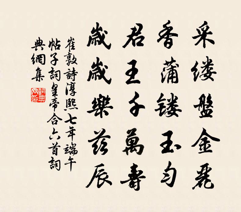 詩詞名句歷史字典書法欣賞書法字典國語詞典說文解字康熙字典古漢語字典標 題 作 者 詩 句 淳熙七年端午帖子詞皇帝合六首作者:崔敦詩 朝代:宋代原文采縷盤金麗,香蒲鏤玉勻。君王千萬壽,歲歲樂茲辰。詩詞問答問:《淳熙七年端午帖子詞皇帝合六首》的作者是誰?答:崔敦詩問:該詩寫於哪個朝代?答:宋代書法欣賞淳熙七年端午帖子詞皇帝合六首書法作品詩詞推薦代簡答次中見留孔武仲〔宋代〕詩夸洞庭湖,蓋舉其粗爾。自此稍南行,更有瀟湘水。瀟湘如此流,淺深清見底。吾邑在其旁,桑麻百餘里。民經題畫春景李用〔宋代〕春水滿四澤,浪暖魚龍化。呼吸成風雲,霖雨遍天下。南楚杜甫〔唐代〕南楚青春異,暄寒早早分。無名江上草,隨意嶺頭雲。正月蜂相見,非時鳥共聞。杖藜妨躍馬,不是故離群。古樂府釋斯植〔宋代〕蘭死根亦香,人死不知處。人死不堪悲,蘭香化為霧。詠瀟湘八景各一首漁村夕照劉克莊〔宋代〕估客擊征纜,漁家收釣筒。何妨千嶂黑,猶作半江紅。江中晚釣,寄荊南一二相識劉長卿〔唐代〕楚郭微雨收,荊門遙在目。漾舟水雲里,日暮春江綠。霽華靜洲渚,暝色連松竹。月出波上時,人歸渡頭宿。一身游曉覺寺陳睍〔宋代〕肩輿行到竹邊村,竹里僧房盡閉門。小洞頗聞三里近,殘僧今有一人存。旋沽薄酒欺寒力,未怯春泥踏雨痕。笑覓偈頌一百二十三首釋崇岳〔宋代〕不著佛求,不著法求,不著僧求。揚帆鼓棹,任性優遊。收舍南州與北州,都盧無有一絲頭。詠花扇崖州女子〔宋代〕團扇畫方新,金花照席茵。那緣燈下見,更值月中人。草三段二首賈似道〔宋代〕滿頭 * 紫葡萄,並無紋理項青毛。更兼淡薄輕銀翅,三段之名亦似高。雪中六解姜夔〔宋代〕塞草汀雲護玉鞍,連天花落路漫漫。如今卻憶當時健,下馬題詩不道寒。三月十一日趙蕃〔宋代〕少年意與春競,老老全將病供。鵲噪芳陰樹樹,蝶飛幽夢重重。送晁元默自潭還撫二首趙蕃〔宋代〕臨汝差池再,長沙邂逅初。飄零渠念我,留滯我嗟渠。盤礴雖雲久,追隨固若疏。未知從此別,後會復何如。和毗陵傅知錄送其侄得雋廣童科王邁〔宋代〕渥窪書驥子展足書長,朝發書燕都夕夜郎。一腹如椰貯書,揮毫落紙爛成章。誦筴無遺忘,風采聳動中書堂。伯父失調名佚名〔宋代〕雙鳳釵頭,爭帶御書符。立春黃庭堅〔宋代〕韭苗香煮餅,野老不知春。看鏡道如咫,倚樓梅照人。滿江紅(題博見樓)呂勝己〔宋代〕物理分明,人事巧、元來是拙。常自覺、滿懷春意,向他誰說。剩喜登臨頻眺望,那知出處成迂闊。細閒思、蕭散自祭文陶淵明〔魏晉〕歲惟丁卯,律中無射。天寒夜長,風氣蕭索,鴻雁於徵,草木黃落。陶子將辭逆旅之館,永歸於本宅。故人淒其相贈彥先李處權〔宋代〕此地堪營屋,何山更採薇。怪松拏石出,好鳥傍人飛。衰相年來見,幽尋亂後稀。郎君似冰玉,令我亦忘歸。垂虹亭陳瓘〔宋代〕三年為吏住東濱,重到江頭照病身。滿眼碧波輸野鳥,一蓑疏雨屬漁人。隨船曉月孤輪白,入座群山數點春。張翰名句推薦都雲作者痴,誰解其中味。曹雪芹《紅樓夢·第一回》 人不通今古,馬牛如襟裾。佚名《增廣賢文·上集》 微陽下喬木,遠色隱秋山。馬戴《落日悵望》 疏籬曲徑田家小。雲樹開清曉。周邦彥《虞美人·疏籬曲徑田家小》 道不遠人。人之為道而遠人,不可以為道。子思《中庸·第十三章》 學不可以已。荀子《荀子·勸學》 城外蕭蕭北風起,城上健兒吹落耳。劉基《北風行》 洛陽親友如相問,一片冰心在玉壺。王昌齡《芙蓉樓送辛漸》 江送巴南水,山橫塞北雲王勃《江亭夜月送別二首》 油壁香車不再逢,峽雲無跡任西東。晏殊《無題·油壁香車不再逢》