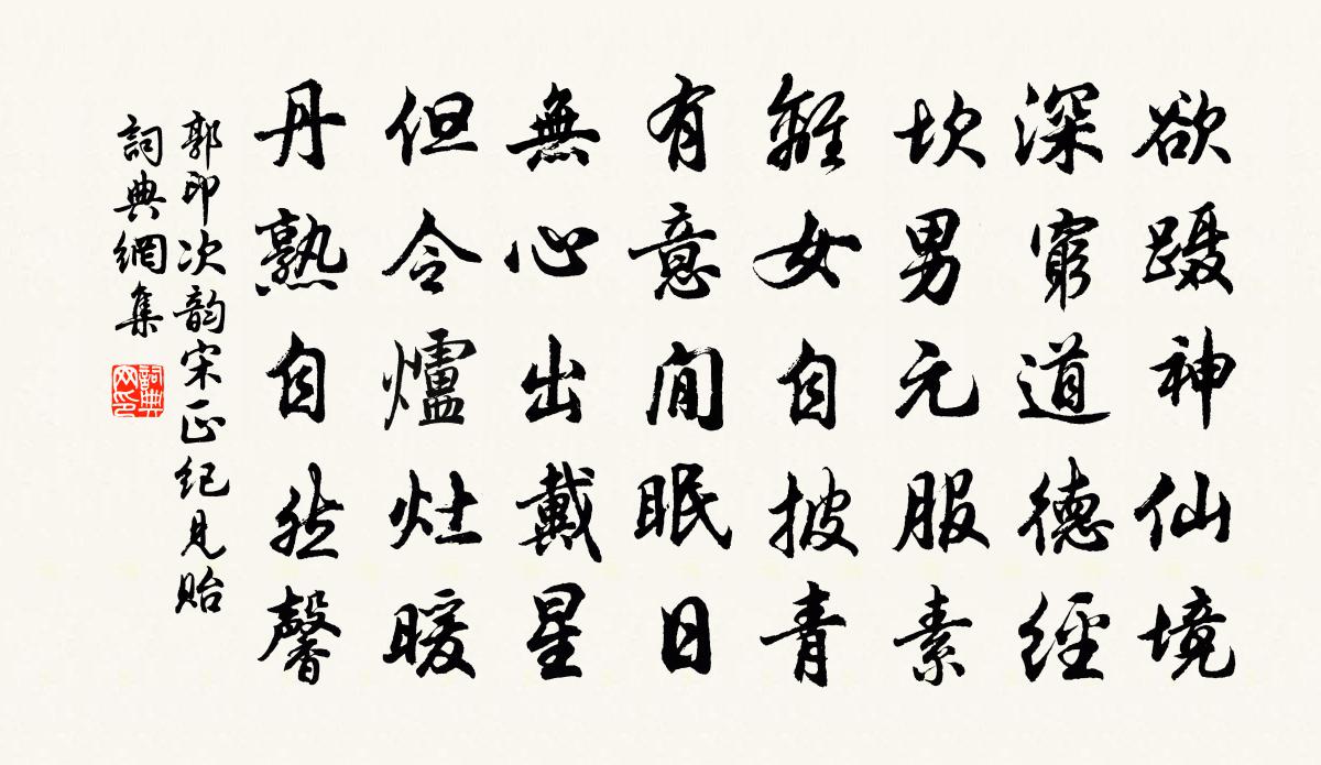 詩詞名句歷史字典書法欣賞書法字典國語詞典說文解字康熙字典古漢語字典標 題 作 者 詩 句 次韻宋正紀見貽作者:郭印 朝代:宋代次韻宋正紀見貽原文欲躡神仙境,深窮道德經。坎男元服素,離女自披青。有意閒眠日,無心出戴星。但令爐灶暖,丹熟自然馨。詩詞問答問:次韻宋正紀見貽的作者是誰?答:郭印問:次韻宋正紀見貽寫於哪個朝代?答:宋代郭印次韻宋正紀見貽書法欣賞次韻宋正紀見貽書法作品詩詞推薦題過所畫枯木竹石三首蘇軾〔宋代〕散木支離得自全,交柯蚴蟉欲相纏。不須更說能鳴雁,要以空中得盡年。莆門陳東野輓詞戴栩〔宋代〕碧海雲邊為小隱,暮年世味等空濛。笑看朝友題銜闊,愛共鄰翁話歲豐。書述南軒兒自注,詩參東野字應同。一丘雜詠一百首扶蘇劉克莊〔宋代〕詔自沙丘至,如何便釋兵。君王令賜死,公子不求生。誨子游酢〔宋代〕三十年前宿草廬,五年三第世間無。門前獬豸公裳在,只恐兒孫不讀書。樂府四首吳龍翰〔宋代〕瑟瑟涼風來,妾身似秋扇。安得復炎熱,相攜不相厭。句戴復古〔宋代〕詩骨梅花瘦,歸心江水流。自喜陸游〔宋代〕了了復惺惺,蓍龜未是靈。閒中有富貴,壽外更康寧。身備鄉三老,家傳子一經。春回元不記,出戶四山青。靜坐朱翌〔宋代〕年來豈復為秋悲,靜里端能閱化機。風引飢烏將子下,雨催群蟻運糧歸。略無車馬閒尤好,粗有詩書家亦肥。更得雜興二首葉茵〔宋代〕七十雲古稀,予年三之二。來景殊無多,那復就枯瘁。窘步驚畏途,撫心慨時事。何以怡餘生,一日委一醉。允傑侄以詩來卒章和予生孫次韻一百首今存四許月卿〔宋代〕孫枝遙喜道韋經,老手摩頭咳唾名。豚犬吾兒夷□侄,虎龍孫祖退之情。洗兒湯餅吾方拙,教子鹽梅汝更榮。許氏西江月(正月四日和建寧陳安行舍人,時被召)辛棄疾〔宋代〕風月亭危致爽,管弦聲脆休催。主人只是舊時懷。錦瑟旁邊須醉。玉殿何須儂去,沙堤只要公來。看看紅藥又翻階和趙忠州歸耕之賦陳文蔚〔宋代〕壯年學易計非疏,晚讀人間種樹書。不向雲霄羨鴻鵠,卻來江海瘵舂鋤。感君綠野成歸計,令我青山思故居。只恐舟中漫興李新〔宋代〕蓬窗幾點落梅花,旋覺春容放草芽。莫上江樓發歸興,斷霞衰照起寒鴉。浪淘沙佚名〔宋代〕簾外五更風。吹夢無蹤。畫樓重上與誰同。記得玉釵斜撥火,寶篆成空。回首紫金峰。雨潤煙濃。一江春浪醉醒中紹興祀岳鎮海瀆四十三首佚名〔宋代〕瞻彼芒芒,日北之常。既高既厚,迺紀迺網。薦鬯伊始,靈示孔將。玄服鐵駕,覽此下方。小重山(四之四)賀鑄〔宋代〕月月相逢只舊圓。迢迢三十夜,夜如年。傷心不照綺羅筵。孤舟里,單枕若為眠。茂苑想依然。花樓連苑起,壓漪望江南/憶江南王琪〔宋代〕江南月,清夜滿西樓。雲落開時冰吐鑒,浪花深處玉沈鉤。圓缺幾時休。星漢迥,風露入新秋。丹桂不知搖落恨,小吳園胡仲弓〔宋代〕臨水開門徑,關防俗子來。竹添當戶筍,梅老靠牆枝。嵐氣侵衣袂,湖光媚酒卮。主人全謝客,時遣鶴相隨。幽事陸游〔宋代〕老夫病起日支離,幽事關心只自知。社近鄰翁饋新釀,客歸童子拾殘棋。功名已付來生了,筆墨尤非晚歲宜。余習輞川集二十首斤竹嶺裴迪〔唐代〕明流紆且直,綠筱密復深。一徑通山路,行歌望舊岑。名句推薦上林訊息好,鴻雁已歸來。張元乾《臨江仙·送宇文德和被召赴行在所》 滿目山河空念遠,落花風雨更傷春,不如憐取眼前人。晏殊《浣溪沙·一向年光有限身》 心事孤山春夢在,到思量、猶斷詩魂吳文英《極相思·題陳藏一水月梅扇》 違山十里,蟪蛄之聲,猶在於佚名《孔子家語·子路初見》 星垂平野闊,月涌大江流。杜甫《旅夜書懷》 枕上詩書閒處好,門前風景雨來佳。李清照《攤破浣溪沙·病起蕭蕭兩鬢華》 雙槳來時,有人似、舊曲桃根桃葉。姜夔《琵琶仙·雙槳來時》 聖賢之所美,莫美乎聰明;聰明之所貴,莫貴乎知人。劉劭《人物誌·序》 小童疑是有村客,急向柴門去卻關。崔道融《溪居即事》 誰忍窺河漢,迢迢問鬥牛。孟浩然《他鄉七夕》