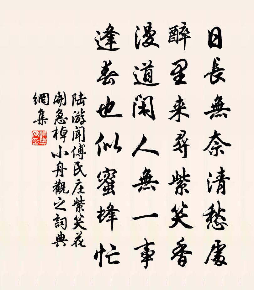 詩詞名句歷史字典書法欣賞書法字典國語詞典說文解字康熙字典古漢語字典標 題 作 者 詩 句 聞傅氏莊紫笑花開急棹小舟觀之作者:陸游 朝代:宋代原文日長無奈清愁處,醉里來尋紫笑香。漫道閒人無一事,逢春也似蜜蜂忙。詩詞問答問:《聞傅氏莊紫笑花開急棹小舟觀之》的作者是誰?答:陸游問:該詩寫於哪個朝代?答:宋代問:陸游的名句有哪些?答:陸游名句大全書法欣賞聞傅氏莊紫笑花開急棹小舟觀之書法作品詩詞推薦禪人寫師真請贊釋慧遠〔宋代〕畫出不堪,棄智雜毒。贊之不是,厭身桎梏。一十三處坐道場,二時粥飯何曾足。日裹夜行,投明暗宿。宿許山人別業釋簡長〔宋代〕嵐霽景初分,溪橋對石門。犬聲知遠客,燒影見前村。古木秋生菌,空山夜答猿。幾因留我宿,靜話極詩源。病目黎廷瑞〔宋代〕兩眼誰憐著古今,中年贏得淚沾巾。冥鴻滅沒看天曉,搔首薰風對玉琴。正月十二日至邵州十三日夜暴雨滂沱陳與義〔宋代〕邵州正月風氣殊,鶉尾之南更山塢。昨日已見三月花,今夜還聞五更雨。箋與天公一破顏,走避北狄趨南蠻。夢到惜芳時王哲〔元代〕諸公學道應徒甚。細細把、玄機苒荏。頭邊認取清涼枕、當風月、瑩然刀圭滋味頻頻飲。漸漸放、千花似錦。馨香挽趙龍泉王柏〔宋代〕滿擬田廬樂莫年,誰知鳧舄遽飛仙。鶚書連走文揚捷,麟趾多推正脈賢。晚錫藍衫更鶡弁,徑分蒲璧鎮龍泉。春風十五日游龍華淨明兩院值雨蔡襄〔宋代〕垂楊修竹半藏山,一徑紆迴暮雨間。綠滿野田看渺渺,白飛岩溜自潺潺。空村鮐背行歌去,古寺頭陀乞食還。卻羨矮齋雜詠二十首春思華岳〔宋代〕東風吹恨入青樓,滿目春容總是愁。楊柳織成絲萬縷,憑誰裁作翠茸裘。隴上行張仲素〔唐代〕行到黃雲隴,唯聞羌戍鼙。不如山下水,猶得任東西。題嚴陵犯釣台佚名〔宋代〕范陽忘名載西子,介推逃蹟累山樊。先生政爾無多事,聊把漁桿坐水村。瑞香楊萬里〔宋代〕買斷春光與曉晴,幽香逸艷獨婷婷。齊開忽作欒枝錦,未圻猶疑紫素馨。絕愛小花和月露,折將一朵篸銀瓶。今年逍遙詠宋太宗〔宋代〕乘雲駕鶴自西東,修煉真人意氣雄。出離凡為高見識,周旋道理遠懷通。愚迷盡說皆非實,解者方知事不空。宿業偈頌三十首釋慧暉〔宋代〕青山山上,白云云下。戶外水寒,波心船點。送梅秀才歸宣城歐陽修〔宋代〕從學方年少,還家罄橐金。久為江北客,能作洛生吟。罷亞霜前稻,鉤輈竹上禽。歸帆何處落,應拂野梅林。和子忱惠八月青梅曹勛〔宋代〕神仙聞水部。妙物與長生。鼎飪元滋味,山樊好弟兄。佳音當有象,短韻已馳兵。試咽甘酸處,行看雪裡英。將離柯山十月二十七日張耒〔宋代〕去此定有期,逝將泛扁舟。千里須聚糧,尚復少遲留。雖有隸囚籍,聊喜脫遐陬。問我行何之,岱宗古東州。念我寄張侍郎羅隱〔唐代〕衰羸豈合話荊州,爭奈思多不自由。無路重趨桓典馬,有詩曾上仲宣樓。塵銷別跡堪垂淚,樹拂他門懶舉頭。一種題資福院石井潘閬〔宋代〕炎炎畏日樹將焚,卻恨都無一點雲。強跨蹇驢來得到,皆疑渴殺老參軍。覽古五首方回〔宋代〕六經樂故亡,三禮復不完。名數頗舛刺,或亦疑同官。易詩書春秋,論孟庸學篇。彌縫救破斷,誰實心斯傳。始以四月朔日鄉飲於邑董氏之依綠亭口占陳著〔宋代〕道義為鄉自不同,肯隨流俗唾衰翁。高談驚散洗紅雨,清飲喚回依綠風。直欲鳶魚相上下,那知烏兔有西東。得閒名句推薦笑綠鬟鄰女,倚窗猶唱,夕陽西下。蔣捷《女冠子·元夕》 仗酒祓清愁,花銷英氣姜夔《翠樓吟·淳熙丙午冬》 德之不修,學之不講,聞義不能徙,不善不能改,是吾憂也。孔子弟子《論語·述而篇》 中夜四五嘆,常為大國憂。李白《經亂離後天恩流夜郎憶舊遊書懷贈江夏韋太守良宰》 一日不讀書,胸臆無佳想。蕭掄謂《讀書有所見作》 社下燒錢鼓似雷,日斜扶得醉翁回。范成大《春日田園雜興》 龍馬花雪毛,金鞍五陵豪。李白《白馬篇》 今夕復何夕,共此燈燭光。杜甫《贈衛八處士》 午夢初回,捲簾盡放春愁去。周晉《點絳唇·訪牟存叟南漪釣隱》 兵者兇器,將者危任,是以器剛則缺,任重則危。諸葛亮《將苑·卷一·將志》