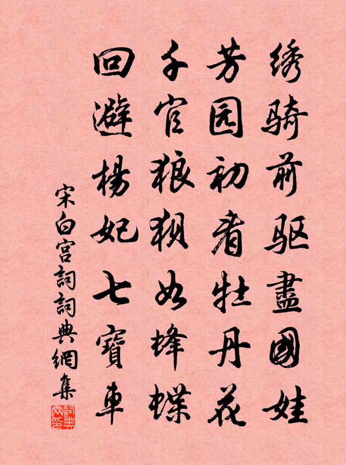 詩詞名句歷史字典書法欣賞書法字典國語詞典說文解字康熙字典古漢語字典標 題 作 者 詩 句 宮詞作者:宋白 朝代:宋代宮詞原文繡騎前驅盡國娃,芳園初看牡丹花。千官狼狽如蜂蝶,迴避楊妃七寶車。詩詞問答問:宮詞的作者是誰?答:宋白問:宮詞寫於哪個朝代?答:宋代宋白宮詞書法欣賞宮詞書法作品詩詞推薦發古塘王冕〔元代〕秋風籬落菊花黃,滿眼江山似故鄉。投老無家真可笑,長年為客尚能狂。青苔蝕盡床頭劍,白日消磨鏡里霜。聞道浣溪沙(慶董內機)李劉〔宋代〕濯錦江邊玉樹明。碧油幢里彩衣榮。當年此日下長庚。細酌成都千歲酒,閒看嶰谷一陽春。歸聽雲母隔屏聲。解語花楊 * 〔宋代〕星橋夜度,火樹宵開,燈月光交射。翠檐銅瓦。相輝映、隱隱絳霞飄下。風流艷雅。向柳陌、纖纖共把。筵宴時、句符蒙〔唐代〕都緣心似水,故以缽為舟。公肅在東南三有書來未報聞其除司直以詩寄賀史堯弼〔宋代〕縱橫才力自時須,今代鵷行政要渠。亦有故人岩石里,未嫌不奉子公書。吳娃曲陸游〔宋代〕滿地花陰不閉門,琵琶抱恨立黃昏。妾身不似天邊月,此夜此時重見君。浪淘沙 冬景梁寅〔元代〕錦樹分明上苑花。晴花宜日又宜霞。碧煙橫處有人家。綠似鴨頭松下水,白於魚腹柳邊沙。一溪雲影雁飛斜。古風其三十七李白〔唐代〕燕臣昔慟哭。五月飛秋霜。庶女號蒼天。震風擊齊堂。精誠有所感。造化為悲傷。而我竟何辜。遠身金殿旁。( 詠風張祜〔唐代〕搖搖歌扇舉,悄悄舞衣輕。引笛秋臨塞,吹沙夜繞城。向峰迴雁影,出峽送猿聲。何似琴中奏,依依別帶情。和推官壓沙寺惠詩強至〔宋代〕上相行春樂有餘,繡旗朝共宿雲舒。特教紅袖停妍唱,為許朱衫托後車。肯說大烹專鼎食,旋容小摘薦園蔬。多才感中原舊事戲作陸游〔宋代〕蜂兒園裹香塵細,燕子樓中寶瑟斜。惟有天知太平事,乞傾東海洗胡沙。雪中憶昔五首方回〔宋代〕憶昔湖天雪最奇,畫船朝出暮歸遲。忍寒常竹憐高節,踏濕尋梅致好枝。熟醉何嘗知病酒,狂吟所至動成詩。褵褷贈梅谷高士何夢桂〔宋代〕去年無方老瞿曇,授我雲門一劄禪。今年羽衣梅谷仙,丹法葛翁口談玄。無方是兄仲梅谷,誤墮凡胎投母腹。豈非花月吟效連珠體十一首 1唐寅〔明代〕花正開時月正明, 花如羅綺月如銀。 溶溶月里花千朵, 燦燦花前月一輪。 月下幾般花意思? 花間多少月題尊信齋陸游〔宋代〕於虖蓋孔孟何其蓋卓,如天蓋日月地海岳。正令舉世皆楊墨,邪正豈復勞商搉?雖然此道久橫流,執熱其誰不思濯和程泰之閣學泛舟南溪遇雪韻三首袁說友〔宋代〕孤雁聲悲南浦,漁人冷徹歸蓑。獨有耐寒瓊玉,一枝先奪陽和。題烏江官舍木芙蓉王之道〔宋代〕桃葉蕭疏柳葉黃,清寒應怯夜來霜。芙蓉雅與秋相好,獨對層台試曉妝。平政橋華岳〔宋代〕建水合流三百里,直下富沙如捻指。溪東披拽纜過西,千丈春風怒濤起。香輪不解碾清江,造舟貫索成河梁。年年尋幽宿隱者居釋文珦〔宋代〕先生巢許流,遠志在箕潁。由來天機深,遂使塵事屏。雲霾山徑長,草沒柴門靜。相逢冬日暮,共語寒夜永。照暝定叟弟生辰張栻〔宋代〕清秋記弧矢,舉酒頌年長。別去今逾歲,情親只對床。韋編閒玩味,幕府小徜徉。刮目綜時看,光暉映棣棠。名句推薦輪匠執其規、矩,以度天下之方圓墨子《墨子·天志(上)》 名豈文章著,官應老病休。杜甫《旅夜書懷》 昔在零陵厭,神器若無依。何遜《行經孫氏陵》 知不知,上矣。過者之患,不知而自以為知。呂不韋《呂氏春秋·論·似順論》 兵出無名,事故不成班固《漢書·紀·高帝紀上》 信宿漁人還泛泛,清秋燕子故飛飛。杜甫《秋興八首》 把君詩卷燈前讀, 詩盡燈殘天未明。白居易《舟中讀元九詩》 柳外輕雷池上雨,雨聲滴碎荷聲。歐陽修《臨江仙·柳外輕雷池上雨》 愁腸已斷無由醉,酒未到,先成淚。范仲淹《御街行·秋日懷舊》 練於骨者,析辭必精;深乎風者,述情必顯。劉勰《文心雕龍·風骨》
