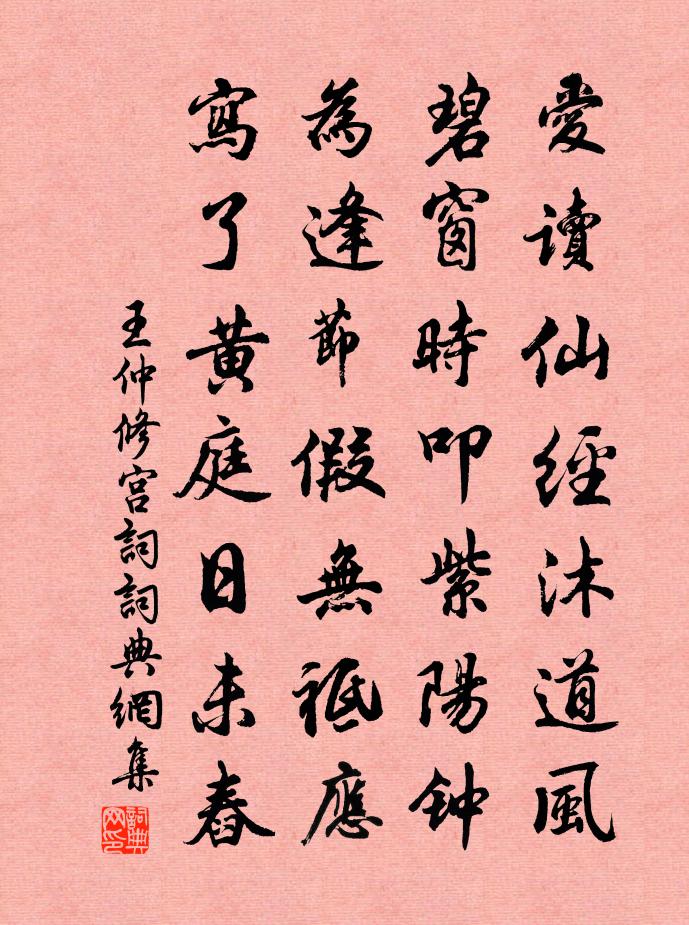 詩詞名句歷史字典書法欣賞書法字典國語詞典說文解字康熙字典古漢語字典標 題 作 者 詩 句 宮詞作者:王仲修 朝代:宋代宮詞原文愛讀仙經沐道風,碧窗時叩紫陽鍾。為逢節假無祗應,寫了黃庭日未舂。詩詞問答問:宮詞的作者是誰?答:王仲修問:宮詞寫於哪個朝代?答:宋代王仲修宮詞書法欣賞宮詞書法作品詩詞推薦孟子憂憂喜喜陳普〔宋代〕骨肉真情出不期,捐階蓋井我何知。風埃滿目間來往,天性曾無一點疵。酒醒彭龜年〔宋代〕世間顛倒事,一切自酒出。醒時清明心,醉後不可覓。醉時顛倒苗,或發醒時實。酒能醉人形,不能醉人心。心儻和翁常之徐照〔宋代〕八尺蘄州桃竹簟,坐來疑是水侵裳。垂楊葉下閒吟久,又與鳴蟬共晚涼。雲仙葛立方〔宋代〕木葉蕭蕭兮雨冥冥,山鬼呼風兮猿夜鳴。巫假神兮驚愚,髡假巫兮乞靈。雲仙來兮瑤席啟,坎坎擊鼓兮拜寒水。雲追念鱅谿老人王炎〔宋代〕交遊大半上青雲,可使斯人竟陸沈。寒日亂山皆慘色,北風古木亦悲吟。傷情空拜丹青像,提耳不聞金玉音。舐墨即目李郢〔唐代〕自笑騰騰者,非憨又不狂。何為跧似鼠,而復怯於獐。落拓無生計,伶俜戀酒鄉。冥搜得詩窟,偶戰出文場。愛雪再和十首蘇轍〔宋代〕歌舞留賓意自多,華燈數問夜如何。白頭病客無才思,慣臥茅檐長薜蘿。歸憩澗亭橋丘葵〔宋代〕雨後溪流深更深,倚欄照見一生心。青山只在橋南北,枉自穿雲渡水尋。子駿運使八詠堂巽堂文同〔宋代〕華堂聳嚴台,地勢側隨水。高臨巽宮上,其取名以是。峨峨寶峰頂,日影正辰已。繚棧入雲林,詰屈如篆字。輕霏留題黃山院楊億〔宋代〕禾黍離離一徑通,遊人攬轡即過從。趁齊綢緞鳥聞疏磬,出定高僧見偃松。夜靜翕燈凝古殿,雨餘岩溜迸前峰。昔三月十八日趙蕃〔宋代〕巴陵一月雨不休,豈惟人病天亦愁。蠶飢麥腐谷種壞,農夫田婦呼天求。巴邑有客方倦遊,杭湖欲歸思具舟。冥冥木蘭花(唐守生日)管鑒〔宋代〕亂花飛絮。卻是一年春好處。留住韶光。共醉蓬萊日月長。翻階紅藥。天上東風傳近約。綠遍庭槐。看取除書一併別聖俞歐陽修〔宋代〕車馬古城隅,喧喧分曉色。行人念歸塗,居者徒慘惻。薄宦共羈旅,論交喜金石。薦以朋酒懽,寧知歲月適。人事夏日三首張耒〔宋代〕棗徑瓜畦經雨涼,白衫烏帽野人裝。幽花避日房房斂,翠樹含風葉葉香。養拙久拚藏姓氏,致身安事巧文章。漢庭曉行釋文珦〔宋代〕寒雞誤客行,躑躅犯霜露。冰凍不生潮,娥江夜難渡。楚中作張俞〔宋代〕渺渺洞庭野,蕭蕭黃鶴樓。水通雲夢浦,人渡沔陽舟。廣澤侵吳壤,孤城接郢丘。山分三楚斷,溪入九江流。寂寞雪作陳元晉〔宋代〕簾卷虛堂曉,兒童笑語嘩。恍疑開月窟,渾是散天花。竹里聞清響,江邊看玉槎。訪梅好興去,著屐過鄰家。題雲居壁韓世忠〔宋代〕芒鞋行杖是生涯,老鬢今年玩物華。為愛雲居松檜好,不須更看牡丹花。憶少年趙彥端〔宋代〕逢春如酒,逢花如露,逢人如玉。東風送寒去,蔚溫溫香縠。海上三山元似粟。試招來、共藏金屋。與君醉千歲,畫堂春盧祖皋〔宋代〕柳黃移上袂羅單。酒醒嬌嚲風鬟。茗甌才試鷓鴣斑。沈炷熏殘。夜雨可無歸夢,曉風何處征鞍。海棠開了尚憑闌。名句推薦邯鄲驛里逢冬至,抱膝燈前影伴身。白居易《邯鄲冬至夜思家》 蓮子已成荷葉老。青露洗、蘋花汀草。李清照《怨王孫·湖上風來波浩渺》 秋聲帶葉蕭蕭落,莫響城頭角!董士錫《虞美人·韶華爭肯偎人住》 死者不可再生,用法務在寬簡。吳兢《貞觀政要·卷八·論刑法》 力田已告成,計日宜收藏。黃燮清《秋日田家雜詠》 記取江湖泊船處,臥聞新雁落寒汀。陸游《夜泊水村》 黃鶯不語東風起,深閉朱門伴舞腰。溫庭筠《楊柳八首·其三》 秋風萬里芙蓉國,暮雨千家薜荔村。譚用之《秋宿湘江遇雨》 夢繞神州路。張元乾《賀新郎·送胡邦衡待制赴新州》 天入平湖晴不風,夕帆和雁正浮空。陳與義《登岳陽樓》