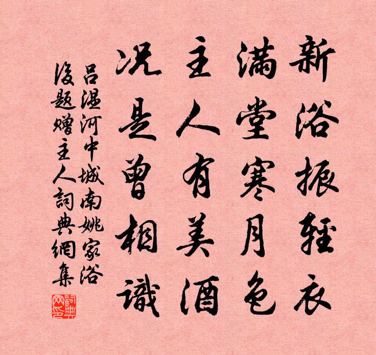 詩詞名句歷史字典書法欣賞書法字典國語詞典說文解字康熙字典古漢語字典標 題 作 者 詩 句 河中城南姚家浴後題贈主人作者:呂溫 朝代:唐代河中城南姚家浴後題贈主人原文新浴振輕衣,滿堂寒月色。主人有美酒,況是曾相識。詩詞問答問:河中城南姚家浴後題贈主人的作者是誰?答:呂溫問:河中城南姚家浴後題贈主人寫於哪個朝代?答:唐代問:河中城南姚家浴後題贈主人是什麼體裁?答:五古呂溫河中城南姚家浴後題贈主人書法欣賞河中城南姚家浴後題贈主人書法作品注釋全唐詩:卷370-18詩詞推薦乍晴二首張耒〔宋代〕虹長飲雨川無滴,苹末生風沼有波。一掃煙雲不知處,夜天如水瀉銀河。謝潘端叔惠紅梅樓鑰〔宋代〕詩老為花空自忙,想應未識此奇芳。青枝綠葉何須辨,桃杏安能如許香。長壽樂(平調)柳永〔宋代〕尤紅殢翠。近日來、陡把狂心牽繫。羅綺叢中,笙歌筵上,有個人人可意。解嚴妝巧笑,取次言談成嬌媚。知幾度仁宗皇帝輓詞三首曾鞏〔宋代〕且轉歸人外,天移入畫中。冕旒餘澤在,驚蹕舊儀空。卜宅三川繞,方喪萬里通。初寒石門路,松檜瘋悲風。初庵傅學士歸田裡汪元量〔宋代〕燕台同看雪花天,別後音書雁不傳。紫閣笑談為職長,彤闈朝謁在班前。揮毫屢掃三千字,把酒時呼十四弦。聞已望郡城酬舟中諸丈陶夢桂〔宋代〕歸路寧迂三兩程,落霞孤鶩近鄉城。水連南浦天然碧。秋入西山雨後清。鹿夢已醒諳世事,鷗盟獨在見交情。近來五盤(七盤嶺在廣元縣北一名五盤棧道盤曲有五重)杜甫〔唐代〕五盤雖雲險,山色佳有餘。仰凌棧道細,俯映江木疏。地僻無網罟,水清反多魚。好鳥不妄飛,野人半巢居。喜見皇后閣端午帖子夏竦〔宋代〕迎祥競獻雙條達,續壽初纏五色絲。共仰齋莊隆內訓,永觀蕃衍藏仙枝。夜直秘閣呈王敏甫蘇軾〔宋代〕蓬瀛宮闕隔埃氛,帝樂天香似許聞。瓦弄寒蟾鴛臥月,樓生晴靄鳳盤雲。共誰交臂論今古,只有閒心對此君。大隱偈頌一百零一首釋慧性〔宋代〕秋風離離,秋色依依。秋雲淡儜,秋月分輝。篆不彫之心印,狀似鐵牛之機。阿呵呵,力{內力外囗}希,再三撈代柬答合淝蘇刑曹兼呈淮西帥同年趙寶謨二首劉宰〔宋代〕青衫擬掾襲芳塵,短褐歸來理約緡。二紀期君紹先烈,一官投老祗參軍。宦情自與秋光薄,公論猶期歲晚伸。見說沈諫議召游湖不赴明日得雙蓮於北山下作一絕蘇軾〔宋代〕湖上棠陰手自栽,問公更得幾回來。水仙亦恐公歸去,故遣雙蓮一夜開。詔書行捧縷金箋,樂府應歌相府蓮。莫忘送梁士衡歸餘杭韓元吉〔宋代〕一水分他縣,音書近可傳。飄零俱北客。憔悴各中年。破屋春風裡,扁舟夜雪前。故人逢短簿,為話意茫然。送聞人伯卿赴銅陵重送伯卿范成大〔宋代〕雪花來無時,入春送三作。冰柱凍不解,去地才一握。東風畏奇寒,未敢破梅萼。已僵員嶠蠶,那問紇乾雀。萬徑次韻俞伯初古松篇汪炎昶〔宋代〕挺植今幾世,追數邈不逮。槃古始分盡,已見數抱大。繁荄茁朽壞,力窮孕貞外。靈椿爾何知,詫閱寒暑代。深根水調歌頭李曾伯〔宋代〕締好恨不早,覿面雅相志。璇星樓上,一見天產此英奇。功在淮梁砥柱,政藹漢扶襦褲,僅借寇恂期。懊惱劍花冷題石勒城二首呂溫〔唐代〕長驅到處積人頭,大旆連營壓上游。建業烏棲何足問,慨然歸去王中州。天生傑異固難馴,應變摧枯若有神。夷甫縱筆陸游〔宋代〕天道何時定?人生固有涯。壯年行出塞,晚歲病還家。積憤憑誰豁,孤忠袛自嗟。今朝茅屋底,隱約聽霜笳。南柯子/南歌子佚名〔宋代〕花萼清輝近,蓬萊紫氣濃。濮園流慶與天同。生得名駒千里、籋秋風。閱武戈初偃,論文酒不空。摩挲銅狄灞橋東梅花惠端方〔宋代〕美人在空谷,抱志苦貞潔。不學桃李顏,甘在枯朽列。素衣飄白雲,玉佩綴明月。肌膚炯凝脂,容色眩春雪。臨風名句推薦含愁獨倚閨幃,玉爐煙斷香微。毛熙震《清平樂·春光欲暮》 哀蟬無留響,叢雁鳴雲霄。陶淵明《己酉歲九月九日》 女蘿發馨香,菟絲斷人腸。李白《古意》 欲知方寸,共有幾許清愁,芭蕉不展丁香結。賀鑄《石州引·薄雨初寒》 福來有由,禍來有漸。陳壽《三國志·吳書·吳主五子傳》 半溪流水綠,千樹落花紅。車萬育《聲律啟蒙·上卷·一 東》 此時相望不相聞,願逐月華流照君。張若虛《春江花月夜》 霖雨泥我塗,流潦浩縱橫。曹植《贈白馬王彪·並序》 醉後不知天在水,滿船清夢壓星河。唐珙《題龍陽縣青草湖》 智不逾奸,伐之莫勝;知不至大,奸者難拒。來俊臣《羅織經·察奸卷第八》