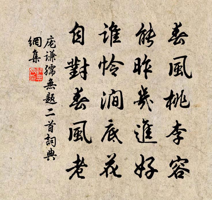 詩詞名句歷史字典書法欣賞書法字典國語詞典說文解字康熙字典古漢語字典標 題 作 者 詩 句 無題二首作者:龐謙孺 朝代:宋代無題二首原文春風桃李容,能昨幾進好。誰憐澗底花,自對春風老。詩詞問答問:無題二首的作者是誰?答:龐謙孺問:無題二首寫於哪個朝代?答:宋代龐謙孺無題二首書法欣賞無題二首書法作品詩詞推薦度清霄張繼先〔宋代〕二更二點二更深。宮鍾聲絕夜沈沈。明月滿天如寫金。同光共影無昏沈。起來閒操無弦琴。聲高調古驚人心。琴罷出戶釋文珦〔宋代〕出戶逢幽客,相攜過別村。凍開泥徑滑,橋斷石星存。雲起難知處,泉流自有源。老農心甚適,耕鑿長兒孫。湖州行魏耕〔清代〕君不見湖州直在太湖東,香楓成林橘青蔥。山川迢迢麗村渚,秋城淡淡遮蒼穹。亭皋百里少荒土,風俗清朴勤桑農宿文殊院呈孫子和二絕張耒〔宋代〕天河初沒空明星,四聽雞號人慾興。高林有露乍蹄馬,佛屋無人到曉燈。題詩口鋪黃公度〔宋代〕一水曳修帶,千山羅峻屏。客懷今古淚,人世短長亭。歲月身將老,功名夢未醒。長卿倦遊久,歸思滿岩扃。題傅侍郎寒碧十五韻觀魚陳宓〔宋代〕燕忙將水撇,魚樂欲空跳。此意誰能會,光陰靜里消。句諶祜〔宋代〕鳳城色映紅雲見,龍袞香飄紫氣浮。寄長安端明王左丞宋庠〔宋代〕綱轄尊華省,旌麾鎮舊秦。州榮朱轂守,公待黑頭人。從橐荷中密,仁風扉外春。才包揚馬思,政續趙張神。鼎飪建溪道間林泳〔宋代〕三兩漁舟竹影中,山禽相對哢晴風。小橋落日無人處,一樹桃花照水紅。豐城道中趙汝鐩〔宋代〕雨後泥深馬費鞭,看來遵陸豈如船。人行灘過無多水,雁帶雲飛不盡天。束擔侵晨離故縣,算程明日至臨川。長安發閶門顧瑛〔元代〕閶門西去是陽關,疊疊秋風疊疊山。便是早春相別處,如今楊柳不堪攀。扇子詩李石〔宋代〕春江拍拍浴鵝兒,一夜潮生水漸肥。畫舫正將桃葉渡,彩橋隨處柳花飛。浣溪沙 送王子勉都運關中王惲〔元代〕薊北分攜已六年。秋風淇上又離筵。一尊情話重留連。內史調兵惟漢相,春潭通漕笑韋堅。岳雲拋翠上吟鞭。寄羅機宜竟陵督捕六首項安世〔宋代〕已賦陽台行雨,還看夢澤連雲。為問當時平土,如今多少耕耘。即目·萬笏尖中路林則徐〔清代〕萬笏尖中路漸成,遠看如削近還平。不知身與諸天接,卻訝雲從下界生。飛瀑正拖千嶂雨,斜陽先放一峰晴。眼前七月望後二日西湖會飲酒酣分韻賦詩得荷字王邁〔宋代〕波平煙霽晚風和,船到湖心水沒窩。涼絕不知三伏暑,醉酣齊唱八仙歌。賞梅洞口憐和靖,種柳堤邊憶老坡。魚鑰寄秋懷趙蕃〔宋代〕求友詠伐木,思兄言陟岡。那知符檄累,不了道途忙。照水形知瘵,臨風發欠長。想渠能我憶,如我不渠忘。試製舉人呈同舍諸公二首蘇轍〔宋代〕垣中不減台端峻,池上來從柱下嚴。同直舊曾連月久,暫來還喜二公兼。〈仆頃與孫莘老同在諫垣,與彭器資同在陳淮水孫元晏〔唐代〕文物衣冠盡入秦,六朝繁盛忽埃塵。自從淮水乾枯後,不見王家更有人。臨洮龍興寺玄上人院,同詠青木香叢岑參〔唐代〕移根自遠方,種得在僧房。六月花新吐,三春葉已長。抽莖高錫杖,引影到繩床。只為能除疾,傾心向藥王。名句推薦不知而自以為知,百禍之宗也。呂不韋《呂氏春秋·覽·有始覽》 凌余陣兮躐余行,左驂殪兮右刃傷。屈原《國殤》 碧溪影里小橋橫,青簾市上孤煙起。謝逸《踏莎行·柳絮風輕》 遠牧牛,繞村四面禾黍稠。李涉《牧童詞》 疏雨池塘見,微風襟袖知。賀鑄《南歌子·疏雨池塘見》 愁因薄暮起,興是清秋發。孟浩然《秋登蘭山寄張五》 以天下為沈濁,不可與莊語。莊子《莊子·雜篇·天下》 青山橫北郭,白水繞東城李白《送友人》 美色不同面,皆佳於目;悲音不共聲,皆快於耳王充《論衡·卷三十·自紀篇》 山邊幽谷水邊村,曾被疏花斷客魂。張嵲《墨梅》