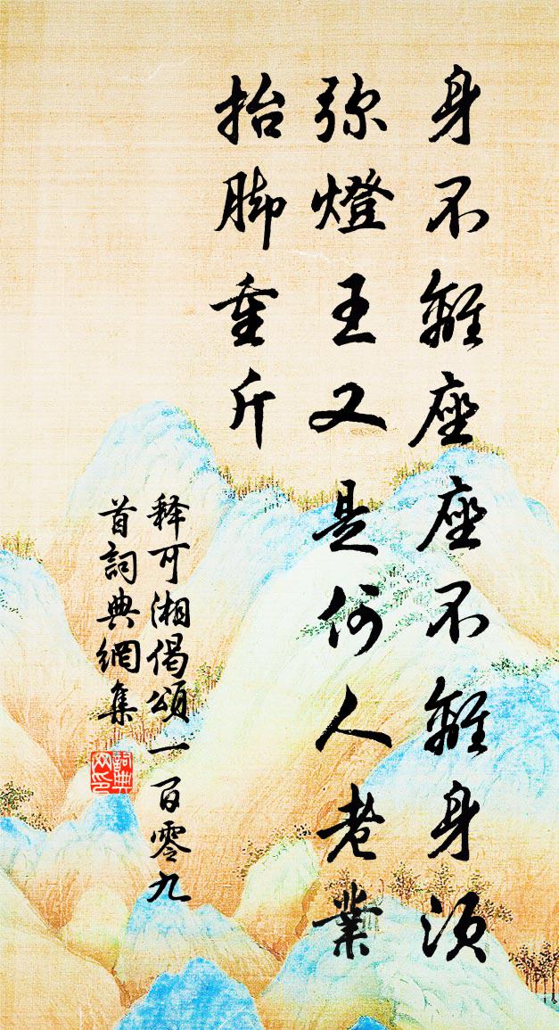 詩詞名句歷史字典書法欣賞書法字典國語詞典說文解字康熙字典古漢語字典標 題 作 者 詩 句 偈頌一百零九首作者:釋可湘 朝代:宋代偈頌一百零九首原文身不離座,座不離身。須彌燈王,又是何人。老業抬腳重斤。詩詞問答問:偈頌一百零九首的作者是誰?答:釋可湘問:偈頌一百零九首寫於哪個朝代?答:宋代釋可湘偈頌一百零九首書法欣賞偈頌一百零九首書法作品詩詞推薦贈李修源(一作送溫飛卿赴方城)張祜〔唐代〕岳陽新尉曉衙參,卻是傍人意未甘。昨夜與君思賈誼,長沙猶在洞庭南。賦應門照綠苔李益〔唐代〕宮闕何年月,應門何歲苔。清光一以照,白露共裴回。 ——李益珠履久行絕,玉房重未開。妾心正如此,昭陽歌書意陸游〔宋代〕秋江菰菜喜新嘗,鹽酪親調七箸香。但有長腰吳下米,豈須細肋大官羊。青衫昔悔塵中老,白髮今宜靜處藏。一事齊天樂(舟中和花翁韻答自村同年)趙必〔宋代〕東南半壁乾坤窄,渺人物、消磨盡。官爵網羅,功名釣餌,眼底紛紛蛙井。暮更朝令。捍格了多少,英雄豪俊。身陵寢第二十三文天祥〔宋代〕旄頭彗紫微,蚩尤塞寒空。愚智心盡死,漂蕩隨高風。頌古六首釋道沖〔宋代〕賓主機先有路通,筆端不是判虛空。筯頭再運回天力,千聖齊教立下風。重過南園梅堯臣〔宋代〕誰作此園為宴喜,而今樂事已難並。佳人去後門長鎖,蔓草離離上古城。百一詩 十九應璩〔魏晉〕茍欲娛耳目。快心樂腹腸。我躬不悅歡。安能慮死亡。次韻李子建春雨李若水〔宋代〕玄雲駕雨來,垂垂勢未已。雙袖貯疏涼,六幕淨餘滓。錦飄風撼花,玉逗水循軌。窗峰碧巑巑,隴麥青靡靡。詩人別妻王韞秀元載〔唐代〕年來誰不厭龍鍾,雖在侯門似不容。看取海山寒翠樹,苦遭霜霰到秦封。句武克誠〔宋代〕昔時說易希程氏,今日傳經愧伏生。新雪八韻(一作閒居新雪)薛能〔唐代〕大雪滿初晨,開門萬象新。龍鍾雞未起,蕭索我何貧。耀若花前境,清如物外身。細飛斑戶牖,乾灑亂松筠。正色偈傾一百六十九首釋智朋〔宋代〕坐斷毗盧頂,不稟釋迦文,且在下風。題芭蕉葉上張仁寶〔唐代〕寒食家家盡禁菸,野棠風墜小花鈿。如今空有孤魂夢,半在嘉陵半錦川。次韻連江陳丞閔雨李彌遜〔宋代〕春雨兩甲子,夏雨知復多。麰麥已受弊,波及術與禾。禾秫尚有望,霖霪人告瘥。雲師挾風伯,斥去煩撝訶。后土和張運使題長樂台陳襄〔宋代〕雲暗騶鳴出谷時,一方生齒庇餘輝。知君才業非張翰,莫為鱸魚有意歸。我行其野佚名〔先秦〕我行其野,蔽芾其樗。婚姻之故,言就爾居。爾不我畜,復我邦家。我行其野,言采其蓫。婚姻之故,言就爾宿。上巳訪楊廷秀賞牡丹於御書匾榜之齋其東園僅周必大〔宋代〕楊監全勝賀監家,賜湖豈比賜書華。四環自斸三三徑,頃刻常開七七花。門外有田聊伏臘,望中無處不煙霞。卻慚鷓鴣徐夤〔唐代〕繡仆梅兼羽翼全,楚雞非瑞莫爭先。啼歸明月落邊樹,飛入百花深處煙。避燒幾曾遺遠岫,引雛時見飲晴川。荔枝【雙調】雁兒落過得勝令_燕鶯語佚名〔元代〕燕鶯語喧,媚景致真堪羨。梨花開白玉蕊,楊柳吐黃金線。 人醉杏花天,仕女戲鞦韆。四季春為貴,風流名句推薦聞道黃龍戍,頻年不解兵。沈佺期《雜詩三首·其三》 年年今夜,月華如練,長是人千里。范仲淹《御街行·秋日懷舊》 金玉其外,敗絮其中劉基《賣柑者言》 無聊成獨臥,彈指韶光過。納蘭性德《菩薩蠻·新寒中酒敲窗雨》 犬吠水聲中,桃花帶露濃。李白《訪戴天山道士不遇》 巫峽啼猿數行淚,衡陽歸雁幾封書。高適《送李少府貶峽中王少府貶長沙》 槐陰別院宜清晝,入座春風秀。美人圖子阿誰留。元好問《虞美人·槐陰別院宜清晝》 過雨西風,數葉井梧愁舞。吳文英《荔枝香近·七夕》 言不過行,行不過道戴聖《大戴禮記·文王官人第七十二》 致治在於任賢,興國在於務農。陳壽《三國志·魏書·辛毗楊阜高堂隆傳》