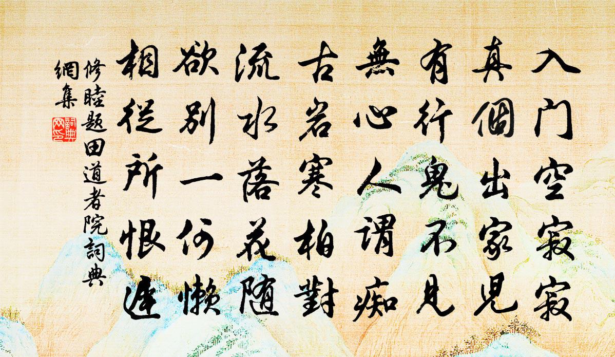 詩詞名句歷史字典書法欣賞書法字典國語詞典說文解字康熙字典古漢語字典標 題 作 者 詩 句 題田道者院作者:修睦 朝代:唐代題田道者院原文入門空寂寂,真箇出家兒。有行鬼不見,無心人謂痴。古岩寒柏對,流水落花隨。欲別一何懶,相從所恨遲。詩詞問答問:題田道者院的作者是誰?答:修睦問:題田道者院寫於哪個朝代?答:唐代問:題田道者院是什麼體裁?答:五律修睦題田道者院書法欣賞題田道者院書法作品注釋全唐詩:卷849-26詩詞推薦郭之美忽過雲往河北謁歐陽永叔沈子山梅堯臣〔宋代〕春風無行跡,似與草木期。高低新萌芽,閉戶我未知。忽聞人扣門,手把蟠桃枝。問我此蟠桃,緣何結子遲。但笑集英殿立侍觀進士唱名六首張鎡〔宋代〕早放天扉一刻開,更聲初斷雨聲催。不因變化魚龍日,焉有風雲轉首來。滿庭芳 贈出家眾王處一〔元代〕米麥精華,沖和恬淡,自然造化成神。無生妙道,**變良因。既得長生久視,明顛倒、月伴風鄰。先師教,頤真連雨偶成二首蘇籀〔宋代〕檻欞生菌地生衣,釜甑有魚盤有薇。適俗簪袂取縈挽,累人口腹得嶇崎。行看海霧江雲盡,卻放風台月觀輝。撥置峭寒輕(賞殘梅)曹勛〔宋代〕照溪流清淺,正萬梅都開,峭寒天氣。才過了元宵,漸晝長禁宇,迤邐佳時。斷腸枝上雪,殘英已、片影初飛。苒春恨韓偓〔唐代〕殘夢依依酒力余,城頭畫角伴啼烏。平明未卷西樓幕,院靜時聞響轆轤。吳參政炎溽帖贊岳珂〔宋代〕公以四□,近事三朝。絕識岩嶢,心畫以昭。人月圓·宴北人張侍御吳激〔金代〕南朝千古傷心事,猶唱後庭花。舊時王榭,堂前燕子,飛向誰家?恍然一夢,仙肌勝雪,宮髻堆鴉。江州司馬,青【正宮】小梁州_春夜張可久〔元代〕春夜玉簫吹斷鳳釵分,瘦損真真。小詞空制錦回文,孤眠恨,翠被寶香溫。【麼】故人一去無音信,望蓬萊隔幾重和穎上人南徐十詠其一鐵瓮城梅堯臣〔宋代〕壍江以為池,增山以為壁。鐵瓮喻其堅,金城非所敵。前朝經喪亂,曾是輕鋒鏑。覽古一徜徉,空聽漁浦笛。虛谷志歸後賦十首方回〔宋代〕年將盈六袠,禮尚記三加。北闕昔分竹,東陵今種瓜。閒吟聊復爾,爛醉豈知他。海內能詩者,時來問我家。浣溪沙(題星洲寺)吳儆〔宋代〕十里青山溯碧流。夕陽沙晚片帆收。重重煙樹出層樓。人去人來芳草渡,鷗飛鷗沒白蘋洲。碧梧翠竹記曾游。應天長馮延巳〔唐代〕朱顏日日驚憔悴,多少離愁誰得會?人事改,空追悔,枕上夜長只如歲。紅綃三尺淚,雙結解時心醉。魂夢萬重雲棲真院於石〔宋代〕空翠凝寒不受埃,斷崖千尺擁崔嵬。老僧倚樹驚猿去,童子掃階知客來。石徑晴因松露濕,茶煙遠趁竹風回。禪家題峴坡書院鄭會〔宋代〕羊公碑字晉苔昏,中有襄人古淚痕。憶作風煙漲塵土,自今日月照乾坤。維甌有客傷前哲,以峴名坡續後昆。且莫二月十三日灰池炎灼得混沌胚腪吳誤〔宋代〕灰池炎灼定浮枕,見了方知造化深。世上本來無此物,人間終是少知音。蒙蒙恍恍離宮本,杳杳冥冥坎戶金。得一和關彥遠雪晁補之〔宋代〕春雨翻成雪,朝壚未覺炎。拂檐驚乍響,綴袖喜初沾。庭薄寧堪跡,空繁詎可瞻。正憐風共起,終恨雨同漸。疏箔夏日過莊嚴寺僧索詩為留三絕晁公武〔宋代〕松筠窈窕隱禪房,茗碗熏爐白晝長。門外塵埃生熟惱,誰知林下自清涼。念奴嬌(題臨湖閣。閣在東陽,向巨源所創,洪容齋作記,舊贅漕幕居其下)王義山〔宋代〕南昌奇觀,最東湖、好景重重疊疊。誰瞰湖光新佳閣,橫挹翠峰嶻辥。十里芙蓉,海神捧出,一鏡何明徹。鳶魚飛念奴嬌曾紆〔宋代〕片帆暮落,正前村梅蕊,愁人如雪。東陌西溪長記得,疏影橫斜時節。六出冰姿,玉人微步,笑里輕輕折。蘭房沈名句推薦喪雖有禮,而哀為本焉。墨子《墨子·02章 修身》 客思似楊柳,春風千萬條。王安石《壬辰寒食》 明妃一朝西入胡,胡中美女多羞死。李白《于闐採花》 且莫思身外,長近尊前。周邦彥《滿庭芳·夏日溧水無想山作》 不識廬山真面目,只緣身在此山中。蘇軾《題西林壁》 兵者詭道,善因事變。房玄齡《晉書·帝紀·第一章》 野幕敞瓊筵,羌戎賀勞旋。盧綸《和張僕射塞下曲·其四》 上有青冥之長天,下有淥水之波瀾李白《長相思·其一》 富而可求也,雖執鞭之士,吾亦為之。如不可求,從吾所好。孔子弟子《論語·述而篇》 人之忌,在好為人師。孟子《孟子·離婁章句上·第二十三節》