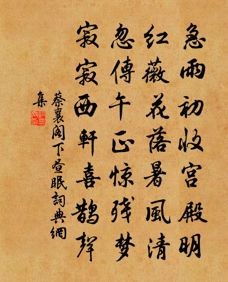 詩詞名句歷史字典書法欣賞書法字典國語詞典說文解字康熙字典古漢語字典標 題 作 者 詩 句 閣下晝眠作者:蔡襄 朝代:宋代閣下晝眠原文急雨初收宮殿明,紅薇花落暑風清。忽傳午正驚殘夢,寂寂西軒喜鵲聲。詩詞問答問:閣下晝眠的作者是誰?答:蔡襄問:閣下晝眠寫於哪個朝代?答:宋代蔡襄閣下晝眠書法欣賞閣下晝眠書法作品詩詞推薦霜日許月卿〔宋代〕霜日步行遲,雲山復歷長。蘆花相遜揖,松樹自宮商,竹動鳴珂里,桃成衣錦鄉。水邊籬落好,一夜玉為堂。大丹詩四首李浩〔唐代〕混沌未分我獨存,包含四象立乾坤。還丹須向此中覓,得此方為至妙門。煮石烹金煉太元,神仙不肯等閒傳。人能次韻子就游鶴鳴王灼〔宋代〕夕雨方開霽,晨雞亦罷鳴。四郊知按堵,千騎得徐行。再閱天章麗,還同佛日明。抽毫出佳句,壓倒謝宣城。送孫鳳秀才赴舉齊己〔唐代〕九重方側席,四海仰文明。好把孤吟去,便隨公道行。梁園浮雪氣,汴水漲春聲。此日登仙眾,君應最後生。秋懷曾鞏〔宋代〕天地四時誰主張,縱使群陰入風日。日光在天已蒼涼,風氣吹人更憀慄。樹木慘慘顏色衰,燕雀啾啾群侶失。我有還都陸游〔宋代〕平生薄名宦,所願得早休。奔走三十年,鏡中霜鬢秋。歸踏長安道,恍然皆舊遊,處處見題名,始驚歲月遒。西湖挽劉宣義孫應時〔宋代〕令子認絞重,三年為此來。儀容親几杖,笑語侍尊罍。今日臨歸路,傷心哭夜台。善人常罕見,寧獨為公哀。詠史二首陳造〔宋代〕暴楚狂秦席捲中,謀臣戰將各言功。端知四百綿炎祚,只屬商山禿鬢翁。題綠陰堂黃公度〔宋代〕萬里炎荒一草亭,微官挽我落南溟。誰栽古木圍空翠,為翦卑枝納遠青。風雨半天秋縮瑟,江湖滿地客伶俜。日長水邊張鎡〔宋代〕翠藤縈樹夕花明,無數圓荷帖亂萍。酒力半銷來照影,晚風輕澹鶴梳翎。菩薩蠻郭□□〔宋代〕賣餳天氣簫聲軟。午院水沉煙未斷。睡起補殘眉。紅綿入鏡遲。霎時開笑靨。花上看雙蝶。新月上簾鉤。相思不斷偈頌十七首釋師範〔宋代〕六爻既窮,陰魔自殄。一陽來復,吾道大亨。將歸趙汝績〔宋代〕拄笏西山一笑中,掛帆猶及棟花風。此身可是屠羊說,餘事寧非失馬翁。不問鬢毛成早白,免將痴面發羞紅。故人慷慨歌先秦無名〔先秦〕貪吏而可為而不可為。廉吏而可為而為可為。貪吏而不可為者。當時有污名。而可為者。子孫以家成。廉吏而可為哀郢陸游〔宋代〕荊州十月早梅春,徂歲真同下阪輪。天地何心窮壯士,江湖從古著羈臣。淋漓痛飲長亭暮,慷慨悲歌白髮新。欲吊和舒上人山居即事唐求〔唐代〕敗葉填溪路,殘陽過野亭。仍彈一滴水,更讀兩張經。暝鳥煙中見,寒鍾竹里聽。不多山下去,人世盡膻腥。過招隱寺李涉〔唐代〕每憶中林訪惠持,今來正遇早春時。自從休去無心事,唯向高僧說便知。過玉蓮湯宋祁〔宋代〕平日宮中賜浴時,玉蓮香目湧華漪。錦鳧繡雁今安在,汩汩餘湯自入池。春日偶成三首陳棣〔宋代〕雨後春逾麗,平堤漲綠波。侵人花氣釀,刺眼麥芒多。舴艋閒蓑笠,鞦韆醉綺羅。光陰難把玩,秀句與消磨。東歸別常修羅隱〔唐代〕六載辛勤九陌中,卻尋歸路五湖東。名慚桂苑一枝綠,鱠憶松江兩箸紅。浮世到頭須適性,男兒何必盡成功。唯慚名句推薦荷葉出地尋丈,因列坐其下,上不見日。姜夔《念奴嬌·鬧紅一舸》 池邊釣女日相隨,妝成照影竟來窺孟浩然《高陽池送朱二》 施惠勿念,受恩莫忘。朱柏廬《朱子家訓·全文》 王侯將相寧有種乎?司馬遷《史記·陳涉世家》 荒煙涼雨助人悲,淚染衣襟不自知。王安石《送和甫至龍安微雨》 臥龍躍馬終黃土,人事音書漫寂寥。杜甫《閣夜》 貧居鬧市無人問,富在深山有遠親。佚名《增廣賢文·上集》 不見去年人,淚濕春衫袖。歐陽修《生查子·元夕》 商女不知亡國恨,隔江猶唱後庭花。杜牧《泊秦淮》 覆巢毀卵,而鳳皇不翔;刳胎焚夭,而麒麟不至。劉向《戰國策·趙四·秦攻魏取寧邑》