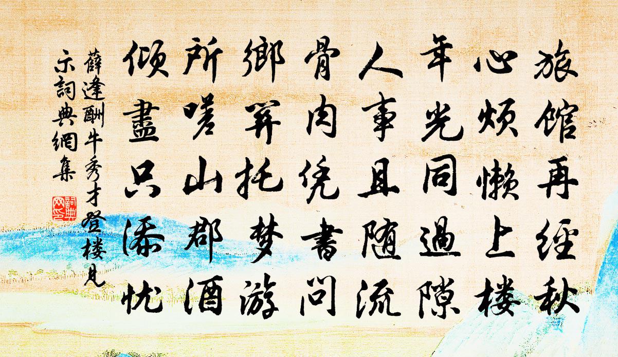 詩詞名句歷史字典書法欣賞書法字典國語詞典說文解字康熙字典古漢語字典標 題 作 者 詩 句 酬牛秀才登樓見示作者:薛逢 朝代:唐代酬牛秀才登樓見示原文旅館再經秋,心煩懶上樓。年光同過隙,人事且隨流。骨肉憑書問,鄉關託夢游。所嗟山郡酒,傾盡只添憂。詩詞問答問:酬牛秀才登樓見示的作者是誰?答:薛逢問:酬牛秀才登樓見示寫於哪個朝代?答:唐代問:酬牛秀才登樓見示是什麼體裁?答:五律薛逢酬牛秀才登樓見示書法欣賞酬牛秀才登樓見示書法作品注釋全唐詩:卷548-9詩詞推薦挽崇清陳侍郎五首王邁〔宋代〕當軸開邊釁,朝紳半詭隨。公方司獻納,言必及安危。願飾湟中備,毋輕馬邑師。當時雖枘鑒,今日若蓍龜。呈萬菴十章採藥白玉蟾〔宋代〕王蘊山頭多白雲,白雲深處藥苗芬。威音王佛隨時種,元始天尊下手耘。石女騎龍攀雨(左瓜右瓜),木人駕虎摘祀明堂楊冠卿〔宋代〕總章備物嚴秋鄉,尊祖契約規汶上。宰臣恭肅相明禋,精意潛交通肸蠁。殊庭朝薦燎煙升,陰雲剝落天日明。百神送王正卿寺丞赴睢陽幙梅堯臣〔宋代〕廢囿孝王國,離宮天子都。古今雖且異,文物未嘗無。族有栽槐美,名得得桂殊。應聞漢丞相,待士倒樽壺。謝竇員外旬休早涼見示詩(奉書報詰朝有宴)劉禹錫〔唐代〕新秋十日浣朱衣,鈴閣無聲公吏歸。風韻漸高梧葉動,露光初重槿花稀。四時苒苒催容鬢,三爵油油忘是非。更報次韻柳子玉見寄蘇軾〔宋代〕薄雷輕雨曉晴初,陌上春泥未濺裾。行樂及時雖有酒,出門無侶漫看書。遙知寒食催歸騎,定把鴟夷載後車。他日秋日懷賈隨進士羅隱〔唐代〕邊寇日騷動,故人音信稀。長纓慚賈誼,孤憤憶韓非。曉匣魚腸冷,春園鴨掌肥。知君安未得,聊且示忘機。和沈次韓春日郊行二首王之道〔宋代〕山色新晴一蘸青,隔溪無數野花明。杞苗荻筍肥應美,採掇何妨趁晚烹。酬岳陽李主簿卷齊己〔唐代〕把卷思高興,瀟湘闊浸門。無雲生翠浪,有月動清魂。倚檻應窮底,凝情合到源。為君吟所寄,難甚至忘筌。楊花曲湯惠休〔南北朝〕葳蕤華結情,婉轉風含思。掩涕守春心,折蘭還自遺。江南相思引,多嘆不成音。黃鶴西北去,銜我千里心。深堤村居徐逸〔宋代〕酸甜半熟山頭果,紅白爭開屋角花。紫戶不關春睡足,太平多在野人家。出門偶成胡寅〔宋代〕飯已柴扉手自開,杖藜三徑久徘徊。忽驚無雨溪流漲,遙認他山雪浪來。葉暗青雲環舍竹,樹團香玉繞池梅。春光張子京扁其先大父居琴之竹軒日琴琅玕汪炎昶〔宋代〕自停伶倫雙鳳鳴,陰分嶰谷涼幽庭。肖哇不能屈其貞,睨霜節堅挺疏莖。骨含五音堪九成,欲泄未得爽不平。嶧陽閨情四首沐發張玉孃〔宋代〕膩滑青螺寶髻黏,金盤香水吸寒蟾。指尖巧弄琅玕影,楚發輕披雲母簾。掠霧暗疑星點點,拂波深見玉織織。起來朝陽穿破衲釋師範〔宋代〕橫片豎片胡亂搭,長針短針信意聯。但見日頭東畔出,不知塵世是何年。和陶停雲四首蘇軾〔宋代〕停雲在空,黯其將雨。嗟我懷人,道修且阻。眷此區區,俯仰再撫。良辰過鳥,逝不我佇。牧童詞李涉〔唐代〕朝牧牛,牧牛下江曲。夜牧牛,牧牛度村谷。荷蓑出林春雨細,蘆管臥吹莎草綠。亂插蓬蒿箭滿腰,不怕猛虎欺黃句張良臣〔宋代〕空掩玉樓先睡去。小桃紅馬致遠〔元代〕畫堂春暖繡幃重,寶篆香微動。此外虛名要何用?醉鄉中,東風喚醒梨花夢。主人愛客,尋常迎送,鸚鵡在金籠。七夕宋白〔宋代〕纖吹浮雲薦,非因散巧樓。靈儔不可覿,仙溪泛悠悠。名句推薦荷芰風輕簾幕香,繡衣鸂鶒泳回塘,小屏閒掩舊瀟湘。顧敻《浣溪沙·荷芰風輕簾幕香》 江頭未是風波惡,別有人間行路難!辛棄疾《鷓鴣天·送人》 生而不有,為而不恃,長而不宰。是謂玄德。老子《老子·道經·第十章》 海燕未來人鬥草,江梅已過柳生綿。李清照《浣溪沙·淡盪春光寒食天》 草鋪橫野六七里,笛弄晚風三四聲。呂岩《牧童》 斗萬花樣巧,深染蜂黃。吳文英《惜黃花慢·菊》 盤心清露如鉛水,又一夜、西風吹折。張炎《疏影·詠荷葉》 莫愁前路無知己,天下誰人不識君。高適《別董大二首》 不經一番寒徹骨,怎得梅花撲鼻香。黃櫱禪師《上堂開示頌》 為有雲屏無限嬌,鳳城寒盡怕春宵。李商隱《為有》