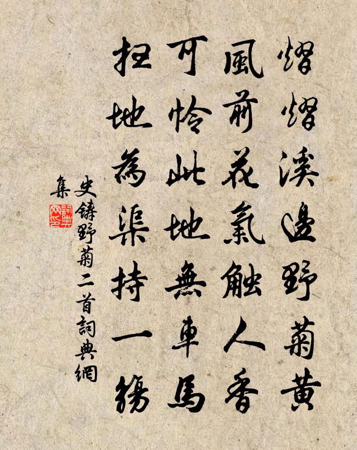 詩詞名句歷史字典書法欣賞書法字典國語詞典說文解字康熙字典古漢語字典標 題 作 者 詩 句 野菊二首作者:史鑄 朝代:宋代野菊二首原文熠熠溪邊野菊黃,風前花氣觸人香。可憐此地無車馬,掃地為渠持一觴。詩詞問答問:野菊二首的作者是誰?答:史鑄問:野菊二首寫於哪個朝代?答:宋代史鑄野菊二首書法欣賞野菊二首書法作品詩詞推薦過淮甸曹勛〔宋代〕長淮煙靜是天津,兵里因循一半分。尚有舊時鷗懷鷺,夕陽歸處記南雲。意難忘何夢桂〔宋代〕避暑林塘。數元戎小隊,一簇紅妝。旌雲影動,簾幕水沉香。金縷徹,玉肌涼。慢拍舞輕揚。更一般,輕弦細管再次韻送張守陳造〔宋代〕唾壺聲里晚涼輕,風自虛徐月自傾。詩好要從知者道,格高今識古人情。三熏誰定分膏馥,十襲吾方守詛盟。預恐和單君范古意六首樵陳著〔宋代〕枯者既就拾,濕者亦既束。空此一谷薪,載之可折軸。下山售市價,得糧不能宿。誰知此時心,氣塞口自嘿。安得呈浙西張提倉袁說友〔宋代〕老掾當年意已傾,執鞭雖晚眼仍青。繡衣公子初雲漢,璧水先生尚典刑。負弩前驅容漫叟,下帷覃思愧玄經。催科溫泉張舜民〔宋代〕岧嶢華清宮,下有溫泉水。繡領絡千門,玉蓮噴九蕊。第一名御湯,第二沐妃子。從上傍諸生,最下列衛士。淙淙謁金門(秋晚□蕙花為賦)黃機〔宋代〕秋向晚。秋晚蕙根猶暖。碧染羅裙湘水淺。羞紅微到臉。窣窣繡簾圍遍。月薄霜明庭院。妝罷寶奩慵不掩。無風香司徒工開府韓國富公輓辭四首司馬光〔宋代〕天佑休明祚,時生俊傑臣。賢科首多士,宰府澤生民。煥爛三台正,沖融四海春。欲知甄冶力,試問白頭人。和劉子駒存存室胡宏〔宋代〕動中涵靜是天機,靜有工夫動不非。會得存存存底事,心明萬變一源歸。賜圓覺寺僧德信二首宋孝宗〔宋代〕坐久方知春晝長,靜中心地自清涼。人人圓覺何曾覺,但見塵勞盡日狂。宿蔣庵胡圭〔宋代〕松色聳寒青,雲庵夜未扃。行吟滿林葉,坐聽一僧經。江獺鳴如鬼,山燈遠似星。自能消冷漠,不用酒盈瓶。送人之官嚴陵周文璞〔宋代〕如君風貌又精神,自合拖紳近紫宸。平地有心開洞穴,十年無俸著閒身。已看青舫垂垂去,須憶緋桃灩灩春。若向讀三學士人論事三書戴復古〔宋代〕黃屋見聞遠,朱門富貴忙。屠沽思報國,樵牧解談王。能轉禍為福,毋令聖作狂。草茅垂白叟,尚擬見時康。牡羊道中二首張耒〔宋代〕徒旅已屢憩,過山知幾峰。空畦鳴野水,壞道拱寒松。醁酒自能暖,褐裘初御冬。朝飢久未食,林寺已鳴鐘。鄭尚書新開涪江二首賈島〔唐代〕岸鑿青山破,江開白浪寒。日沉源出海,春至草生灘。梓匠防波溢,蓬仙畏水乾。從今疏決後,任雨滯峰巒。不侵龍瑞陸游〔宋代〕多年不蹋陽明路,今日重來院院行。好在千秋馮觀主,修廊一見眼偏明。點絳唇佚名〔宋代〕萬木凋殘,早梅獨占孤根暖。前村雪滿。昨夜南枝綻。堪恨倚欄,容易吹羌管。飄瓊片。翠蛾爭選。貼向桃花面。次鄭侍郎臥聞秋風韻曾幾〔宋代〕茶山石燥泉亦枯,草樹疊疊成樵蘇。天公風雷起揮袂,咳唾急雨紛跳珠。我詩曾未管窺豹,況有文采如於菟。勤公頌古一百則釋正覺〔宋代〕一竅虛通,八面玲瓏。無象無私春入律,不留不礙月行空。清淨寶目功德臂,遍身何似通身是。現前手眼顯全機,次韻戴帥初見寄陳著〔宋代〕兒造從來自不情,百千萬變底人驚。人生水上浮漚影,物論風前亂葉聲。自笑醉吟空贅傳,誰知橘隱竟無名。況今名句推薦取酒須勤醉,鄉關不可思。司馬光《送張寺丞覲知富順監》 名實相生,利用相成,是非相明,去就相安也。王通《中說·卷五·問易篇》 以肉去蟻蟻愈多,以魚驅蠅蠅愈至。韓非及後人《韓非子·外儲說左下》 人皆可以為堯舜。孟子《孟子·告子章句下·第二節》 泰山不要欺毫末,顏子無心羨老彭。白居易《放言五首·其五》 日星隱曜,山嶽潛形;范仲淹《岳陽樓記》 江水漾西風,江花脫晚紅。王安石《江上》 君不見走馬川行雪海邊,平沙莽莽黃入天。岑參《走馬川行奉送出師西征 / 走馬川行奉送封大夫出師西征》 海角天涯,寒食清明,淚點絮花沾袖。吳文英《花心動·柳》 午夢扁舟花底,香滿西湖煙水。楊萬里《昭君怨·詠荷上雨》