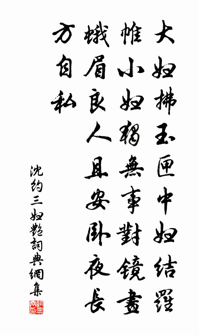 詩詞名句歷史字典書法欣賞書法字典國語詞典說文解字康熙字典古漢語字典標 題 作 者 詩 句 三婦艷作者:沈約 朝代:南北朝三婦艷原文大婦拂玉匣。中婦結羅帷。小婦獨無事。對鏡畫蛾眉。良人且安臥。夜長方自私。詩詞問答問:三婦艷的作者是誰?答:沈約問:三婦艷寫於哪個朝代?答:南北朝問:沈約的名句有哪些?答:沈約名句大全沈約三婦艷書法欣賞三婦艷書法作品詩詞推薦謝胡御史寄茶兼簡深明晃沖之〔宋代〕諫議茶猶寄,郎官跡已疏。斜封三道印,不奉一行書。會遠長安去,終臨顧渚居。大江清見底,為問渴如何。柏堂楊蟠〔宋代〕零落雪霜後,猶含千載春。一株化為石,誰是種時人。人日侍宴大明宮恩賜彩縷人勝應制李嶠〔唐代〕鳳城景色已含韶,人日風光倍覺饒。桂吐半輪迎此夜,蓂開七葉應今朝。魚猜水凍行猶澀,鶯喜春熙弄欲嬌。愧奉桃源憶故人(追和東坡韻呈曾倅子修三首)王之道〔宋代〕逢人借問春歸處。遙指蕪城煙樹。收盡柳梢殘雨。月闖西南戶。遊絲不解留伊住。漫惹閒愁無數。燕子為誰來去。都下食筍自十一月至四月戲題楊萬里〔宋代〕竹祖龍孫渭上居,供儂樽俎半年余。班衣戲彩春無價,玉版談禪佛不如。若怨平生食無肉,何如陋巷飯斯蔬。不須頌古十三首釋德光〔宋代〕師之一字見還難,直下應須透祖關。縱使祖關開正眼,前頭更有萬重山。句陶弼〔宋代〕休哉退公後,日與猿鳥共。和子野郊居見寄仇遠〔宋代〕歸去來兮意趣長,幽居遠隔水雲鄉。花粘石風吟詩筆,風度溪房煮藥香。把酒有時思太白,下車何日見元方。雲萍句章得象〔宋代〕青草瘴深盧橘熟,黃梅雨歇荔枝紅。陳伯紀列岫三首曾豐〔宋代〕文書倥傯汗模糊,問有清涼世界無。走借主人煙雨觀,幻吾身眼入冰壺。獨樹浦雨夜寄李六郎中白居易〔唐代〕忽憶兩家同里巷,何曾一處不追隨。閒遊預算分朝日,靜語多同待漏時。花下放狂沖黑飲,燈前起坐徹明棋。可知過蘇谿樓鑰〔宋代〕處處谿環舍,家家石累牆。有時逢老稚,無事只耕桑。野色撩詩思,村醪引醉鄉。山川已如許,急雨更斜陽。自詠絕句陸游〔宋代〕逆旅門前撥不開,先生醉策蹇驢來。未言乞得囊中藥,一見童顏且壓災。送李奉議亳州判官四首陳師道〔宋代〕吾友孫子實,愛學吾所畏。持身如處子,得句有餘味。交歡艱難際,凜然見名誼。吾病臥里中,車馬日一至。遣醫曉發武陽館即事書情權德輿〔唐代〕清晨策羸車,嘲唽聞村雞。行將騎吏親,日與情愛暌。東風變林樾,南畝事耕犁。青菰冒白水,方塘接廣畦。雜英海棠春(再用韻)吳潛〔宋代〕嫩晴還更宜輕雨。最好處、欲開未吐。一點聘梅心,千古憑誰語。臉霞暈錦嬌人處。肯浪逐、紅圍翠舞。銀燭莫高送僧歸北岩寺黃滔〔唐代〕北岩泉石清,本自高僧住。新松五十年,藤蘿成古樹。題詩昔佳士,清風二林喻。上智失扣關,多被浮名誤。蓮扃送鄭祠部陳師道〔宋代〕持節還家未白頭,有親八十更何求。又須急詔登天去,不為寒鄉盡歲留。四著儒冠甘送老,數經奇運得銷憂。擬登書吳夢予古樂府後樓鑰〔宋代〕古來樂府近來無,筆力如君卻有餘。日恐遺音亡正始,喜聞新作過黃初。不夸藝苑徒工瑟,應免侯門久曳裾。更向鷓鴣天佚名〔宋代〕徹曉華燈照鳳城。猶嗔宮漏促天明。九重天上聞花氣,五色雲中應笑聲。頻報導,奏河清。萬民和樂見人情。年豐名句推薦劍河風急雪片闊,沙口石凍馬蹄脫。岑參《輪台歌奉送封大夫出師西征》 六月禾未秀,官家已修蒼。聶夷中《田家》 看風流慷慨,談笑過殘年辛棄疾《八聲甘州·故將軍飲罷夜歸來》 昨夜吳中雪,子猷佳興發。李白《答王十二寒夜獨酌有懷》 攜壺酌流霞,搴菊泛寒榮。李白《九日》 青冥浩蕩不見底,日月照耀金銀台。李白《夢遊天姥吟留別 / 別東魯諸公》 大鵬一日同風起,扶搖直上九萬里。李白《上李邕》 相知無遠近,萬里尚為鄰。張九齡《送韋城李少府》 白髮書生神州淚,盡淒涼、不向牛山滴劉克莊《賀新郎·九日》 百川東到海,何時復西歸?佚名《長歌行》