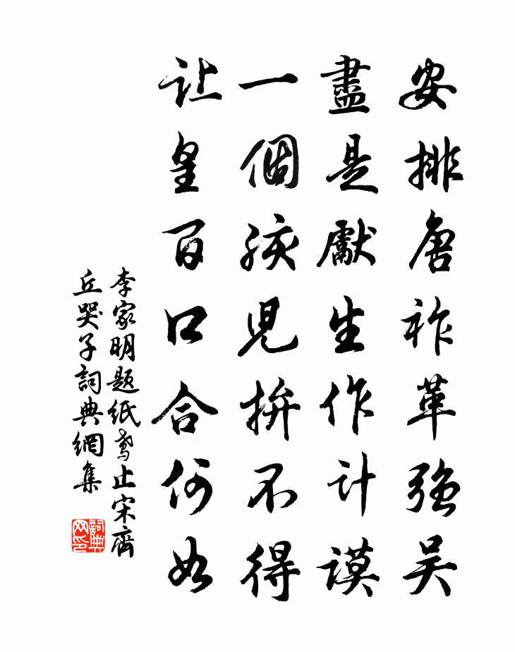 詩詞名句歷史字典書法欣賞書法字典國語詞典說文解字康熙字典古漢語字典標 題 作 者 詩 句 題紙鳶止宋齊丘哭子作者:李家明 朝代:唐代題紙鳶止宋齊丘哭子原文安排唐祚革強吳,儘是先生作計謨。一個孩兒拚不得,讓皇百口合何如?詩詞問答問:題紙鳶止宋齊丘哭子的作者是誰?答:李家明問:題紙鳶止宋齊丘哭子寫於哪個朝代?答:唐代問:題紙鳶止宋齊丘哭子是什麼體裁?答:七絕李家明題紙鳶止宋齊丘哭子書法欣賞題紙鳶止宋齊丘哭子書法作品注釋全唐詩:卷757-32詩詞推薦通叟年兄視以柳侯廟詩三首輒亦有作所謂增來晁說之〔宋代〕何處乘駒去,空庭荔子垂。韓詞方走奠,柳廟久徂飢。既恨謀身誤,仍嗟報國隳。羅池便如此,不復問愚池。放螢寄正仲舒岳祥〔宋代〕殘編百讀過,年去放螢飛。好帶隨身火,休爭秉燭輝。夜涼辭竹庋,風逆返書幃。未是明經日,何人拾汝歸。種花方回〔宋代〕平生無嗜好,有地種花看。萬玉梅成列,千金菊作團。秋宜鴻後冷,春惜燕前寒。更喜薰風好,青青筍上竿。南鄉子 集句蘇軾〔宋代〕悵望送春杯。漸老逢春能幾回。花滿楚城愁遠別,傷懷。何況清絲急管催。吟斷望鄉台。萬里歸心獨上來。景物登郡廳有樹,晚榮早凋,人不識名,因題其上白居易〔唐代〕潯陽郡廳後,有樹不知名。秋先梧桐落,春後桃李榮。五月始萌動,八月已凋零。左右皆松桂,四時郁青青。豈量贈童尼劉言史〔唐代〕舊時艷質如明玉,今日空心是冷灰。料得襄王惆悵極,更無雲雨到陽台。訪景山許伯詡〔宋代〕奉陪南極老,來慕北山名。鑒石濃書墨,流觴款敘情。問誰挹仙袂,我笑縛塵纓。知是龍門客,終難臥孔明。晴偏好佚名〔宋代〕平湖百傾生芳草。芙蓉不照紅顛倒。東坡道。波光瀲灩晴偏好。自和徐潭二首劉克莊〔宋代〕遠遊昔結四方緣,高臥今貪一壑專。有客埋腰沖許雪,無人洗耳涴吾泉。金棺未免荼毗厄,玉匣安知裸葬賢。多積會故人二首徐恢〔宋代〕毛郎才涌似潮頭,莫比寒蟲泣夜秋。要上蘭台揖班馬,不聯石鼎玩侯劉。定知有道能醫國,稍喜談禪勘趙州。顧我寄遠其七李白〔唐代〕妾在舂陵東。君居漢江島。一日望花光。往來成白道。( 上二句一作日日采蘼蕪。上山成白道。)一為雲雨別。南齋竹三絕蘇轍〔宋代〕里中佳客舊孫陳,我自疏慵不見人。目倦細書長掩卷,心游法界四無鄰。古塞下曲七首貫休〔唐代〕下營依遁甲,分帥把河隍。地使人心惡,風吹旗焰荒。搜山得探卒,放火獵黃羊。唯有南飛雁,聲聲斷客腸。歸去修路陸游〔宋代〕雨霪道壞困泥塗,木石紛然賴里閭。但使僅堪行便足,我無長戟與高車。倒押前韻韓偓〔唐代〕白下同歸路,烏衣枉作鄰。珮聲猶隔箔,香氣已迎人。酒勸杯須滿,書羞字不勻。歌憐黃竹怨,味實碧桃珍。翦燭已亥雜詩 173龔自珍〔清代〕碧澗重來薦一毛,杉柟喜比往時高。故人地下仍相護,驅逐狐狸賴爾曹。水調歌頭(十之十)夏元鼎〔宋代〕我有一竿竹,偏會取根源。從來汲水桔槔,直挈上西天。不許常人著手,管定竿頭先折,提桶落寒泉。撥得機關轉題山橋十首王柏〔宋代〕修竹清湍記永和,山陰陳跡已消磨。四時佳興隨人寓,曲水流觴未足多。思越人鹿虔扆〔唐代〕翠屏欹,銀燭背,漏殘清夜迢迢。雙帶繡窠盤錦薦,淚侵花暗香銷。珊瑚枕膩鴉鬟亂,玉纖慵整雲散。苦是適來新題炭谷湫祠堂韓愈〔唐代〕萬生都陽明,幽暗鬼所寰。嗟龍獨何智,出入人鬼間。不知誰為助,若執造化關。厭處平地水,巢居插天山。列峰名句推薦視其所以,觀其所由,察其所安,人焉廋哉?人焉廋哉?孔子弟子《論語·為政篇》 勞歌一曲解行舟,紅葉青山水急流。許渾《謝亭送別》 窮則變,變則通,通則久。佚名《易傳·繫辭傳下·第二章》 知之者不如行之者,行之者不如安之者。王通《中說·卷六·禮樂篇》 辛勤三十日,母瘦雛漸肥。白居易《燕詩示劉叟》 知是人家花落盡,菜畦今日蝶來多。高啟《春暮西園》 有約不來過夜半,閒敲棋子落燈花。趙師秀《約客》 闌乾倚遍重來憑。淚粉偷將紅袖印。歐陽修《玉樓春·去時梅萼初凝粉》 夜吟敲落霜紅,船傍楓橋系。吳文英《荔枝香近·送人游南徐》 人不閒,勿事攪。人不安,勿話擾。李毓秀《弟子規·泛愛眾》