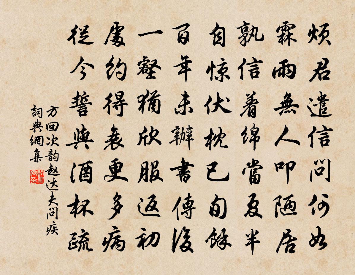 詩詞名句歷史字典書法欣賞書法字典國語詞典說文解字康熙字典古漢語字典標 題 作 者 詩 句 次韻趙達夫問疾作者:方回 朝代:宋代次韻趙達夫問疾原文煩君遣信問何如,霖雨無人叩陋居。孰信著綿當夏半,自驚伏枕已旬余。百年未辦書傳後,一壑猶欣服返初。處約得衰更多病,從今誓與酒杯疏。詩詞問答問:次韻趙達夫問疾的作者是誰?答:方回問:次韻趙達夫問疾寫於哪個朝代?答:宋代方回次韻趙達夫問疾書法欣賞次韻趙達夫問疾書法作品詩詞推薦奉酬君俞席上偶成韓維〔宋代〕候月紗籠合,看梅翠幄開。滿城均俗樂,同閈得君來。笑極時傾弁,歡狂欲倒罍。賦詩慚善祝,凡器豈公台。詠草蘇泂〔宋代〕天涯隨意綠匆匆,只與牛羊踐踏空。挽著便堪供藥味,誰令汝不遇神農。自京師將赴黔南竇鞏〔唐代〕風雨荊州二月天,問人須雇峽中船。西南一望雲和水,猶道黔南有四千。三月十一日不出張九成〔宋代〕老罷慵人事,柴門盡日扃。春江入幽想,夜雨漲前汀。何日當晴霽,西山雲眇冥。江頭無限好,見說柳深青。餘杭道上鄭起〔宋代〕五年茲路上,頻往又頻還。歲月孤松老,風霜苦竹班。溪流天目水,雲出洞霄山。馬上因閒眺,蜉蝣宇宙間。送衛王南征詩庾信〔南北朝〕望水初橫陣。移營寇未降。風塵馬足起。先暗廣陵江。景德祀皇寺祗三首佚名〔宋代〕妙用無方,條來忽逝。蠲潔寅恭,式終社痤。題西梵一翁雙清軒仇遠〔宋代〕上人碧雲房,苔地不盈丈。古石六七株,修竹覆其上。石兄既奇秀,竹君亦高尚。歲晚永相依,屹不染塵坱。方參張大著以韓持國綠樽紅妓事再和見戲複次韻魏了翁〔宋代〕壯心十五亦狂顛,十五年來洗濯鮮。負郭元無三畝宅,浮家安有五湖船。焚香讀易謝來況,飲綠圍紅回長年。不是妾薄命二首陳師道〔宋代〕主家十二樓,一身當三千。古來妾薄命,事主不盡年。起舞為主壽,相送南陽阡。忍著主衣裳,為人作春妍。有聲送范少約二首項安世〔宋代〕侃侃太史孫,風誼美於玉。生才天豈虛,此士世所屬。秦槌不敢贈,孔道以相告。一世須大輿,長途要堅轂。神天鵲橋仙(七夕)向子諲〔宋代〕澄江如練,遠山橫翠,一段風煙如畫。層樓傑閣倚晴空,疑便是、支磯石下。寶奩瓊鑒,淡勻輕掃,縴手弄妝初罷予以謬作數種並總所奏藁遺參贊高紫微聞以閱岳珂〔宋代〕涉筆牛腰倦不支,余工那復到新詩。殷雷秧綠又期月,指日棗紅能幾時。自古兵財無一策,於今社稷寄西陲。入郛初秋留別越中幕客殷文圭〔唐代〕魂夢飄零落葉洲,北轅南柁幾時休。月中青桂漸看老,星畔白榆還報秋。鶴禁有知須強進,稽峰無事莫相留。吳花覽古十四首吳筠〔唐代〕聖人重周濟,明道欲救時。孔席不暇暖,墨突何嘗緇。興言振頹綱,將以有所維。君臣恣淫惑,風俗日凋衰。三代送蘇大著知吉州分韻得章字魏了翁〔宋代〕平生蘇太史,清姿秀球琅。異時玉堂對,歷歷漢興亡。直作根本慮,不懷棄捐傷。修名望蓬島,軼軌抹扶桑。中道偈頌一百四十一首釋師範〔宋代〕摩騰入漢,平地風波。達磨西工業區,重增殃禍。蘇幕遮佚名〔宋代〕嘆人身,如傀儡,五彩妝成,儘是虛瞞昧。叉手棚頭談今古。相呼相喚,空向人前舞。出來時,如風雨。氣斷之時過山庵胡仲弓〔宋代〕天地一間屋,心安到處家。淡中嘗世味,吟里足生涯。煨芋頻添炭,烹泉旋品茶。空山無紙帳,夢不到梅花。夜送趙縱楊炯〔唐代〕趙氏連城璧,由來天下傳。送君還舊府,明月滿前川。名句推薦自見者不明;自是者不彰老子《老子·道經·第二十四章》 芳菲歇去何須恨,夏木陰陰正可人。秦觀《三月晦日偶題》 新園鎖卻愁陰,露黃漫委,寒香半畝。吳文英《瑞龍吟·送梅津》 相逢不飲空歸去,洞口桃花也笑人。佚名《增廣賢文·上集》 薊城通漠北,萬里別吾鄉。李頎《古塞下曲》 秋風清,秋月明,落葉聚還散,寒鴉棲復驚。李白《三五七言 / 秋風詞》 庭中有奇樹,綠葉發華滋。佚名《庭中有奇樹》 母別子,子別母,白日無光哭聲苦。白居易《母別子》 流年莫虛擲,華發不相容。方乾《送從兄郜 / 韋郜 / 途中別孫璐》 忘卻成都來十載,因君未免思量。蘇軾《臨江仙·送王緘》