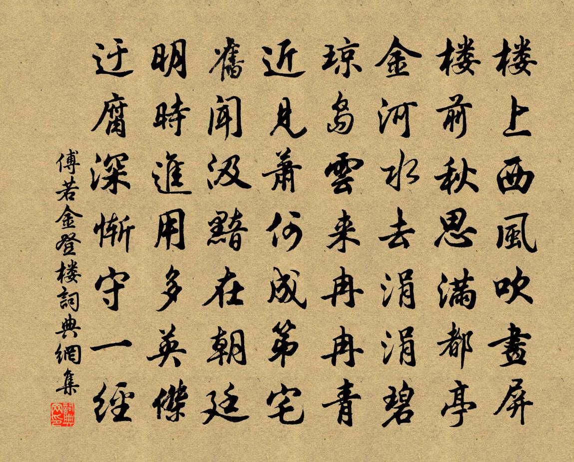 詩詞名句歷史字典書法欣賞書法字典國語詞典說文解字康熙字典古漢語字典標 題 作 者 詩 句 登樓作者:傅若金 朝代:元代登樓原文樓上西風吹畫屏,樓前秋思滿都亭。金河水去涓涓碧,瓊島雲來冉冉青。近見蕭何成第宅,舊聞汲黯在朝廷。明時進用多英傑,迂腐深慚守一經。詩詞問答問:登樓的作者是誰?答:傅若金問:登樓寫於哪個朝代?答:元代問:登樓是什麼體裁?答:七律傅若金登樓書法欣賞登樓書法作品注釋元詩別裁集詩詞推薦謝張德恭送糟蚶三首陳造〔宋代〕誰與江瑤角長雄,一時風味兩無同。吾兒不友王文度,底肯分甘及乃公。南台陳岩〔宋代〕舊日新羅國里僧,山間散滿百千燈。只將一嘿消諸妄,坐透禪機最上乘。郴江百詠並序久留岡阮閱〔宋代〕潁人間欲問郴人,衛颯如何似寇恂。只恐當時遮道者,不應皆是惜留人。寄楊南仲陳藻〔宋代〕君思家世質,雲此閨閭華。我知財貨里,自出人驕奢。先翁非勤儉,安能美生涯。兒郎不鼓舞,造化無萌芽。從今三姑石李左史〔宋代〕風舞芳林鬢腳垂,朝雲行雨濕仙衣。不知當日緣何事,化石山頭更不歸。贈鮑居士翁卷〔宋代〕日日湖波畔,群鷗相共閒。全家皆好佛,獨坐或看山。曬藥嫌雲在,留僧帶月還。有時乘小艇,忽入到城間。無題徐再思〔元代〕一望二三里,煙村四五家。樓台六七座, * 十枝花。水調歌頭 和盧仲敬太守曹伯啟〔元代〕嘗為武林客,歡洽快平生。誰知分袂江滸,西往復東行。今日簿書旁午,明日山川迢遞,愁恨幾時清。回首舊遊地和富公十二人中第二人絕句蘇頌〔宋代〕再遷蟬冕官三事,早上龍旂節一雙。富貴兩忘心不動,天魔如見亦歸降。夢江南趙汝茪〔宋代〕簾不捲,細雨熟櫻桃。數點霽霞山又晚,一痕涼月酒初消。風緊絮花高。閒處少,磨盡少年豪。昨夢醉來騎白鹿,郊居李復〔宋代〕閒原渺渺散疏襟,風舞淵潛自樂生。春到雲山惟杖履,日長天地獨柴荊。百年雖健猶親藥,一飯無多懶問耕。常羨寄名山李著作范祖禹〔宋代〕劍外雖雲遠,外山信日聞。漏天常泄雨,蒙頂半藏雲。萬里飛鳧舄,三年隱豹文。茗芽春後好,應許故人分。以蜜酒送柳真公蘇轍〔宋代〕床頭釀酒一年余,氣味全非卓氏壚。送與幽人試嘗看,不應知是百花須。禪人寫真求贊釋正覺〔宋代〕喬喬楚楚,叢林規矩。萎萎羸羸,枯木風姿。宗乘壁掛口,師友雪生眉。住山事拙束三篾,對月機鳴度一絲。顛毛游籍田三首孔武仲〔宋代〕酷暑不可逭,天郊聊共尋。雲繁當飛蓋,風好得披襟。白水田疇遠,紅蕖浦漵深。斜川陶靖節,千載想知心。寧太白幸首座釋普岩〔宋代〕糞火堆頭潦倒身,且無花鳥鬧芳春。口邊白醭心如鐵,甘作叢林不義人。和孫同年卞山龍洞禱晴蘇軾〔宋代〕吳興連月雨,釜甑生魚蛙。往問卞山龍,曷不安厥家。梯空上巉絕,俯視驚谽谺。神井涌雲蓋,陰崖垂蘚花。交流臨海太守惠予赤城石,報以是詩李德裕〔唐代〕聞君采奇石,剪斷赤城霞。潭上倒虹影,波中搖日華。仙岩接絳氣,谿路雜桃花。若值客星去,便應隨海槎。遣興陸游〔宋代〕耆舊日凋謝,將如此老何。懣拈如意舞,狂扣唾壺歌。郡縣輕民力,封疆恃虜和。功民莫看鏡,吾意已蹉跎。晚思喻鳧〔唐代〕鶴下紫閣雲,沈沈翠微雨。獨坐正無言,孤莊一聲杵。名句推薦遙知未眠月,鄉思在漁歌。杜荀鶴《送人游吳》 晨昏滾滾水東流,今古悠悠日西墜。錢福《明日歌》 天時人事日相催,冬至陽生春又來。杜甫《小至》 黃埃散漫風蕭索,雲棧縈紆登劍閣。白居易《長恨歌》 桃李出深井,花艷驚上春。李白《中山孺子妾歌》 落花狼藉酒闌珊,笙歌醉夢間。李煜《阮郎歸·呈鄭王十二弟》 誰問旗亭,美酒斗十千。賀鑄《行路難·縛虎手》 香醪欲醉茱萸節,壯志還為出塞歌。石茂華《九月九日登長城關》 天仙碧玉瓊瑤,點點揚花,片片鵝毛。薛昂夫《蟾宮曲·雪》 治強生於法,弱亂生於阿。韓非及後人《韓非子·外儲說右下》