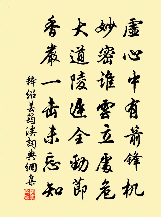 詩詞名句歷史字典書法欣賞書法字典國語詞典說文解字康熙字典古漢語字典標 題 作 者 詩 句 筠溪作者:釋紹曇 朝代:宋代筠溪原文虛心中有箭鋒機,妙密誰雲立處危。大道陵遲全勁節,香嚴一擊未忘知。詩詞問答問:筠溪的作者是誰?答:釋紹曇問:筠溪寫於哪個朝代?答:宋代釋紹曇筠溪書法欣賞筠溪書法作品詩詞推薦三山先賢祠落成八首熊禾〔宋代〕填宿久旅奎,一朝開文治。行歌閩水春,芹藻見新意。林亭郁環合,祠宮敞宏麗。欲賡泮宮頌,且作鄉校議。送劉寺丞赴餘姚蘇軾〔宋代〕中和堂後石楠樹,與君對床聽夜雨。玉笙哀怨不逢人,但見香菸橫碧縷。謳吟思歸出無計,坐想蟋蟀空房語。明朝偈頌七十一首釋了惠〔宋代〕東澗一滴水,東湖千丈波。幾多湖上客,無可奈船何。端午帖子太上皇后閣周必大〔宋代〕水晶宮闕淨無塵,姑射神仙綽有真。寶錄自應表萬善,冰台安用結雙人。柳絮郭印〔宋代〕柳條初弄綠,已覺春風駐。而今二月尾,滿路團飛絮。人生安足恃,忽忽朱顏去。飄零未肯休,萍泛知何處。見之贈鳥窠和尚詩白居易〔唐代〕空門有路不知處,頭白齒黃猶念經。何年飲著聲聞酒,迄至如今醉未醒。 題明發高軒過圖陳師道〔宋代〕滕王蛺蝶江都馬,一紙千金不當價。異才天縱非力能,畫工不是甘為下。今代風流數大年,含毫落筆開山川。忽忘贈彭州權別駕蘇頲〔唐代〕雙流脈脈錦城開,追餞年年往復回。只道歌謠迎半刺,徒聞禮數揖中台。黃鶯急囀春風盡,斑馬長嘶落景催。莫愴殘花李商隱〔唐代〕殘花啼露莫留春,尖發誰非怨別人。若但掩關勞獨夢,寶釵何日不生塵。次叔厚韻洪咨夔〔宋代〕夢斷紅塵踏九衢,雲山佳處借樓居。采將瓠葉隨宜煮,拾得榴皮信意書。未問我今忘我世,須知吾本愛吾廬。黃公惜雙雙 溪橋寄意張先〔宋代〕城上層樓天邊路。殘照里,平無綠樹。傷遠更惜春暮。有人還在高高處。斷夢歸雲經日去。無計使,哀弦寄語。相郊廟歌辭。梁郊祀樂章。慶休張袞〔唐代〕大業來四夷,仁風和萬國。白日體無私,皇天輔有德。七旬罪已服,六月師方克。偉哉帝道隆,終始常作則。送孫元京還講舍方回〔宋代〕神有銛鋒日夜磨,刻雕宇宙奈君何。俗談世念神山隔,人品詩評白眼多。大似石宮元子詠,更能銅斗孟生歌。暮年送鮑都官錢塘通判梅堯臣〔宋代〕文鰩游西海,夕飛向吳洲。朱鱉生明月,淵潛未可求。由來有變化,何能計沉浮。君子蹈出處,誰能等隅陬。臨水甘園呂炎〔宋代〕曾入當年富貴家,東風幾度換年華。滿園桃李不知主,獨自開花自落花。古風其五十一李白〔唐代〕殷後亂天紀。楚懷亦已昏。夷羊滿中野。菉葹盈高門。比干諫而死。屈平竄湘源。虎口何婉孌。女嬃空嬋媛。彭鹹杜司勛李商隱〔唐代〕高樓風雨感斯文,短翼差池不及群。刻意傷春復傷別,人間惟有杜司勛。頌古十首釋師體〔宋代〕三清道士無仙骨,八教闍梨毀梵書。黑添崑崙舞華鼓,天親無著暗嗟吁。雪中望岱嶽施閏章〔清代〕碧海煙歸盡,晴峰雪半殘。冰泉懸眾壑,雲路郁千盤。影落齊燕白,光連天地寒。秦碑凌絕壁,杖策好誰看?空公長老一出即住雪峰書來以建茗為寄長句奉曾幾〔宋代〕此公出世使人驚,道眼看來卻未曾。政爾雪峰千百眾,澹然雲水一孤僧。不妨詩筆作佛事,已用茗甌傳祖燈。我老名句推薦朝陽不再盛,白日忽西幽。阮籍《詠懷八十二首·其三十二》 孔子亦矙其亡也,而往拜之。孟子《孟子·滕文公章句下·第七節》 為人全無好處,欲邀福慶,從何得來?王永彬《圍爐夜話·第一一四則》 遠水不救近火。韓非及後人《韓非子·說林上》 牛羊自歸村巷,童稚不識衣冠。王維《田園樂七首·其四》 弱齡寄事外,委懷在琴書。陶淵明《始作鎮軍參軍經曲阿作》 更滿眼、殘紅吹盡,葉底黃鸝自語。韓元吉《薄倖·送安伯弟》 縱被春風吹作雪,絕勝南陌碾成塵。王安石《北陂杏花》 人法地,地法天,天法道,道法自然。老子《老子·道經·第二十五章》 物壯則老,是謂不道,不道早已。老子《老子·道經·第三十章》