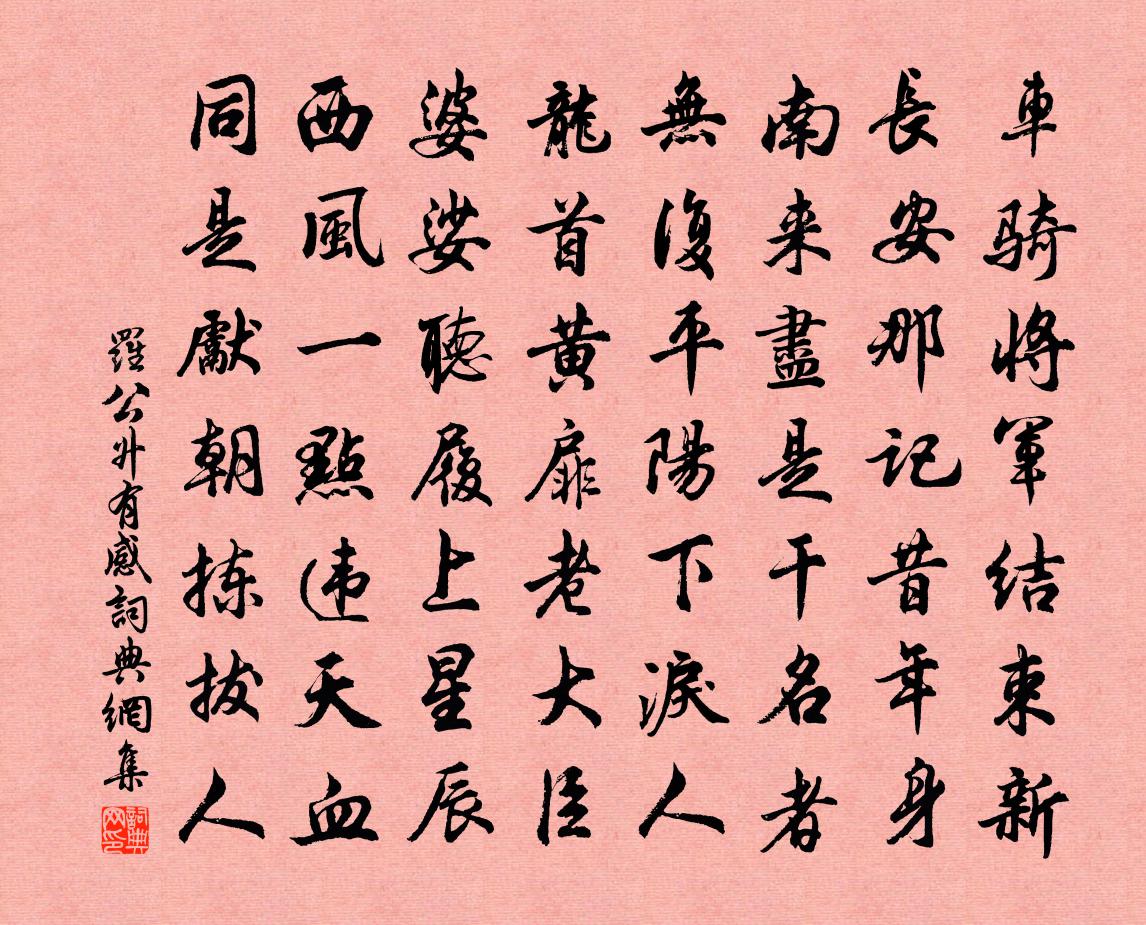 詩詞名句歷史字典書法欣賞書法字典國語詞典說文解字康熙字典古漢語字典標 題 作 者 詩 句 有感作者:羅公升 朝代:宋代有感原文車騎將軍結束新,長安那記昔年身。南來儘是乾名者,無復平陽下淚人。龍首黃扉老大臣,婆娑聽履上星辰。西風一點違天血,同是先朝揀拔人。詩詞問答問:有感的作者是誰?答:羅公升問:有感寫於哪個朝代?答:宋代羅公升有感書法欣賞有感書法作品詩詞推薦有懷成父趙蕃〔宋代〕雪裡同登我有詩,可憐同去阻同歸。扶疏夏木渾如許,還想吾廬晝掩扉。與正輔游香積寺蘇軾〔宋代〕越山少松竹,常苦野火厄。此峰獨蒼然,感荷佛祖力。茯苓無人采,千歲化琥珀。幽光發中夜,見者惟木客。我豈游紫邏洞陳與義〔宋代〕我不願封萬戶侯,願向紫邏從公游。鄆州溪堂虢州洞,未有退之詩可留。水近山流清澈底,竹飽千霜節如此。廓廟次韻張問給事喜雨蘇轍〔宋代〕已收蠶麥無多日,旋喜山川同一雲。禾黍趁時青覆壠,池塘流潤淥生文。兩宮尚廢清晨集,中禁初消永夜薰。倉粟悶成華岳〔宋代〕勿憂李廣不封侯,廣不封侯未足憂。漢鼎不烹曹操肉,吳鉤空斷伍員頭。鴻門自昔推屠狗,虎帳於今愧沐猴。千萬花黃滔〔唐代〕莫道顏色如渥丹,莫道馨香過蕖蘭。東風吹綻還吹落,明日誰為今日看全。玉樓春高觀國〔宋代〕多時不踏章台路。依舊東風芳草渡。鶯聲喚起水邊情,日影炙開花上霧。謝娘不信佳期誤。認得馬嘶迎繡戶。今宵送彭子山提刑郎中赴召二首楊萬里〔宋代〕帝想丹青憶老成,公兼竹潤更蘭馨。獨追洙泗人無訟,再使成康世措刑。召節自天回使節,即星朝斗作台星。花邊次韻金陵掾屬登賞心亭十六韻項安世〔宋代〕賞心淮水頭,樓觀岌以舉。下分漚鳥界,上入歸鴻許。登梯雲濕履,肆席星落俎。龍爭失孫馬,鯨戮空峻處。湖通次仲甄韻二首李流謙〔宋代〕惻剝風枝恨,若為開我顏。索居詩社廢,多病酒杯慳。本自便三逕,何曾夢九關。臨溪問魚樂,知我是青山。田家謠陳造〔宋代〕麥上場,蠶出筐,此時只有田家忙。半月天晴一夜雨,前日麥地皆青秧。陰晴隨意古難得,婦後夫先各努力。倏涼獵罷夜飲示獨孤生陸游〔宋代〕白袍如雪寶刀橫,醉上銀鞍身更輕。帖草角鷹掀兔窟,憑風羽箭作鴟鳴。關河可使成南北?豪傑誰堪共死生。欲疏徽宗皇帝臨右軍蘭亭序御書贊岳珂〔宋代〕太霄帝君升壽丘,夢中靈篆垂鸞虯。翩然下作八極游,赤符羽蓋臨中州。神機天縱凌□□,日□月□孕□□。□□袁都官同前韻賦二詩一間問易邊賦唐律二章索魏了翁〔宋代〕一天西雨又東晴,喚作陰晴雨不成。朝睡著人渾未覺,鳴嚶枝上一聲聲。送晉原喬主簿梅堯臣〔宋代〕太守登車時,我病不能出。遙期玩海棠,度險馬屢叱。唯畏行邁遲,惡欲及春日。何為愛此花,曾非桃杏匹。生紅海棠陸游〔宋代〕蜀地名花擅古今,一枝氣可壓千林。譏彈更到無香處,常恨人言太刻深。懷安養釋文珦〔宋代〕惟吾與西佛,天性本相關。怊悵迷方久,浮沉苦海間。三心終不退,上輩必容攀。慈念應尤切,提攜早共還。放言邵雍〔宋代〕既得希夷樂,曾無寵辱驚。泥空終日著,齊物到頭爭。忽忽閒拈筆,時時自寫名。誰能苦真性,情外更生情。清平樂晁端禮〔宋代〕深沈玉宇。枕簟清無暑。睡起花陰初轉午。一霎飛雲過雨。雨餘隱隱殘雷。夕陽卻照庭槐。莫把繡簾垂下,妨它雙墨歌趙汝績〔宋代〕空山老桐勁如鐵,英枝翦翦夜撐月。霜風著子涵玉膏,烈手崇朝剖融結。別令刳木環清泉,翠缸紙羃籠輕煙。霏霏名句推薦有美一人,清揚婉兮。佚名《野有蔓草》 冰泮寒塘水綠,雨余百草皆生。韋應物《三台》 行雲歸楚峽,飛夢到揚州。晁補之《臨江仙·綠暗汀洲三月暮》 向露冷風清,無人處,耿耿寒漏咽。周邦彥《浪淘沙慢·曉陰重》 楚人悲屈原,千載意未歇。蘇軾《屈原塔》 高館張燈酒復清,夜鍾殘月雁歸聲。高適《夜別韋司士》 有耳莫洗潁川水,有口莫食首陽蕨李白《行路難三首》 留連光景惜朱顏,黃昏獨倚闌。李煜《阮郎歸·呈鄭王十二弟》 惻隱之心,人皆有之孟子《孟子·告子章句上·第六節》 萬里不惜死,一朝得成功。高適《塞下曲》