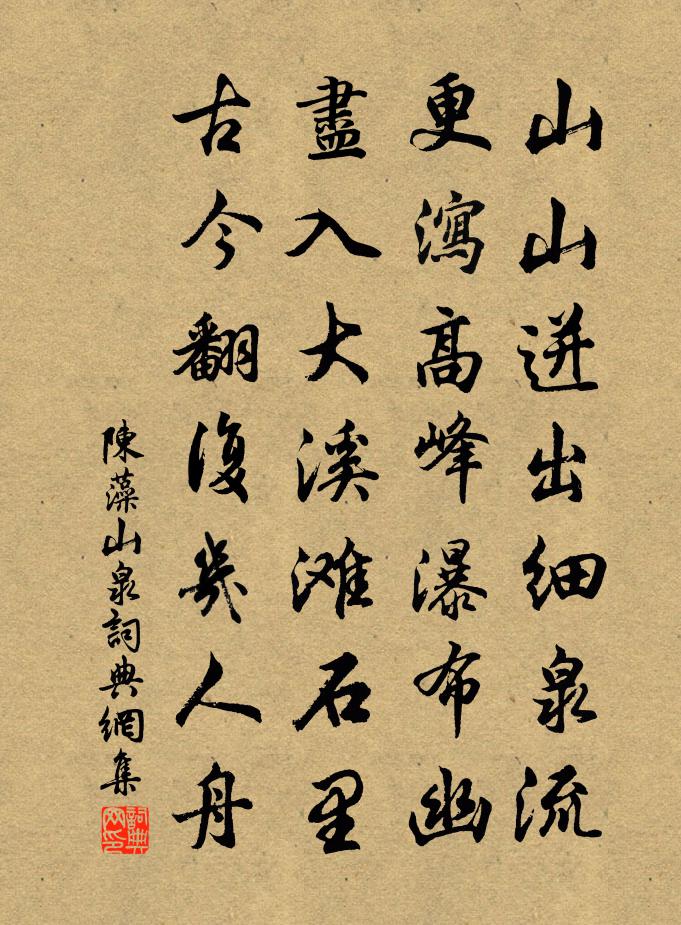 詩詞名句歷史字典書法欣賞書法字典國語詞典說文解字康熙字典古漢語字典標 題 作 者 詩 句 山泉作者:陳藻 朝代:宋代山泉原文山山迸出細泉流,更瀉高峰瀑布幽。盡入大溪灘石里,古今翻復幾人舟。詩詞問答問:山泉的作者是誰?答:陳藻問:山泉寫於哪個朝代?答:宋代陳藻山泉書法欣賞山泉書法作品詩詞推薦秋江雨夜逢詩友杜荀鶴〔唐代〕故友別來三四載,新詩吟得百餘篇。夜來江上秋無月,恨不相逢在雪天。柳含煙·御溝柳毛文錫〔唐代〕御溝柳,占春多,半出宮牆婀娜。有時倒影蘸輕羅,麴塵波。 昨日金鑾巡上苑,風亞舞腰纖軟。栽培得地近皇宮和蕭刓察推賀族叔司理登科還鄉四首蘇轍〔宋代〕巷南諸子足才賢,邂逅相逢秀句傳。強作短章同寄與,異時見我一依然。捉筆次前韻杜范〔宋代〕厭見塵泥汩,喜看沙水清。魚攢偎日暖,鷗去帖波輕。寒渡人來少,閒舟岸與橫。不須催去槳,溪曲不論程。寒雨感懷呈斯遠三首趙蕃〔宋代〕窮冬固多悲,凍雨仍並作。真成晝連夜,直欲寐無覺。其陰似春仲,其令豈天錯。林棲未歸休,蕭寺猶旅泊。孰寬送閻紫微歸蜀喻良能〔宋代〕曲江分袂十年中,一笑相逢楚水東。西掖判花知思涌,南牆喔竹坐詩窮。秋風但覺艅艎駛,晝繡何妨畫戟雄。道過詠史詩鳳凰台胡曾〔唐代〕秦娥一別鳳凰台,東入青冥更不回。空有玉簫千載後,遺聲時到世間來。隔溪梅令 和南金鴛湖舟中韻邵亨貞〔元代〕幾年不到晝橋西。路依稀。回首淡煙殘柳,昔游非。笛聲何處悲。故人不見夢魂迷。草萋萋。幾度倚闌,欲寄舊相和范少才詠雪三首魏了翁〔宋代〕底處呼滕六,催將歲事闌。窗明朝采爛,枝瘦夜光蟠。炫晃山林老,模糊天地寬。曉琴弦欲折,驗忍溧陽酸。內道場永讙上人就郡見訪善說維摩經臨別請詩因以此贈白居易〔唐代〕五夏登壇內殿師,水為心地玉為儀。正傳金粟如來偈,何用錢唐太守詩。苦海出來應有路,靈山別後可無期。他生真如勸農二首吳潛〔宋代〕百尺高橋鎮古丘,乘閒莫惜小夷猶。新楊受日春無際,宿麥翻雲歲有瘳。鷹隼圖南天外意,江山繞北望中愁。世事題大安鋪趙善扛〔宋代〕行役何時歇,崇安復大安。已驚橋壹線,更畏嶺千盤。過雨吹煙碧,近風落葉丹。僧閒吾每羨,今日共蹣跚。蘭皋亭宋祁〔宋代〕信美蘭皋地,疏椽構迥軒。山林閒處樂,溪瀨靜中喧。春桂開前塢,秋菘接後園。舟來無盡曲,客到不空罇。夕月龔漕見示游山唱和詩卷用其首章和二篇吳芾〔宋代〕說著登臨喜欲顛,正慚拘俗未能前。羨君領客同游去,使我聞風亦豁然。已嘆高懷能放曠,還欣佳句更清圓。如今二月初七日壽溪十絕劉克莊〔宋代〕仙不離人世,何須遠覓仙。桃花最深處,更著小漁船。生日魏倅惠三詩王炎〔宋代〕四海眼獨高,江湖走蹣跚。帝念風霜飽,命之官仙班。刺天紛群飛,政爾袞袞難。鹿挾朱輪去,勇哉支狂瀾。蠟梅四首楊萬里〔宋代〕眉間蜜酒發輕黃,對著詩人不惜香。金作仙衣元自冷,月中仍帶一身霜。試墨三首陳著〔宋代〕墨卿與我是相投,了得時需便罷休。不見江南井中藏,只為相國寺門留。喜陸侍御破石埭草寇東峰亭賦詩郭澹〔唐代〕介冑鷹揚出,山林蟻聚空。忽聞飛簡報,曾是坐籌功。迥夜昏氛滅,危亭眺望雄。茂勛推世上,餘興寄杯中。喜色訴衷情高觀國〔宋代〕西樓楊柳未勝煙。寒峭落梅天。東風渡頭波晚,一棹木蘭船。花態度,酒因緣。只春憐。屏開山翠,雨怯雲嬌,盡名句推薦白雲依靜渚,春草閉閒門。劉長卿《尋南溪常山道人隱居 / 尋南溪常道士》 八年十二月,五日雪紛紛。白居易《村居苦寒》 三月休聽夜雨,如今不是催花。張炎《清平樂·采芳人杳》 枝上柳綿吹又少。天涯何處無芳草。蘇軾《蝶戀花·春景》 杪秋霜露重,晨起行幽谷。柳宗元《秋曉行南谷經荒村》 凡出軍行師,或遇沮澤、圮毀之地,宜倍道兼行速過,不可稽留也。佚名《百戰奇略·第四卷·澤戰》 惟有綠荷紅菡萏,卷舒開合任天真。李商隱《贈荷花》 稽於眾,捨己從人,不虐無告,不廢困窮佚名《尚書·虞書·大禹謨》 東風楊柳欲青青。煙淡雨初晴。晏殊《訴衷情·東風楊柳欲青青》 遠信入門先有淚,妻驚女哭問何如。元稹《得樂天書》