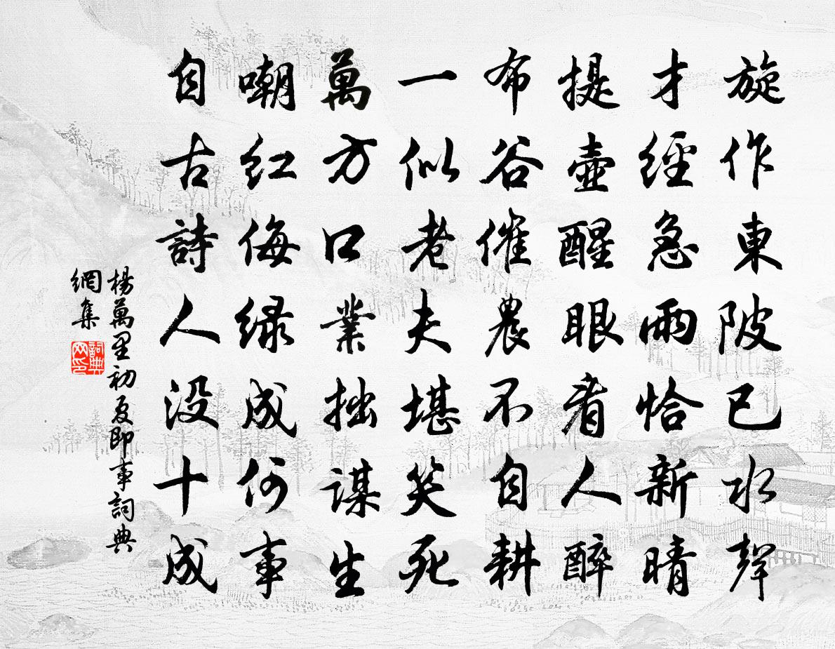 詩詞名句歷史字典書法欣賞書法字典國語詞典說文解字康熙字典古漢語字典標 題 作 者 詩 句 初夏即事作者:楊萬里 朝代:宋代初夏即事原文旋作東陂已水聲,才經急雨恰新晴。提壺醒眼看人醉,布穀催農不自耕。一似老夫堪笑死,萬方口業拙謀生。嘲紅侮綠成何事,自古詩人沒十成。詩詞問答問:初夏即事的作者是誰?答:楊萬里問:初夏即事寫於哪個朝代?答:宋代問:楊萬里的名句有哪些?答:楊萬里名句大全楊萬里初夏即事書法欣賞初夏即事書法作品詩詞推薦荷花胡寅〔宋代〕夢到南塘翠蓋稠,奼然得意斂然羞。驚鴻遠映朝霞色,白鷺先窺霽雨秋。裊裊芳馨煩折贈,霏霏涼吹想追游。天花舟出西門董嗣杲〔宋代〕扁舟冒冷雨,初出安定門。天開水墨圖,濃淡迷湖村。漁板閧白晝,廟鍾撞黃昏。客船行虛明,天淨水不渾。向行換骨骰 嘆脫禍不改過王哲〔元代〕昨遇飢年,為甚累增勸教。怎奈向、人人忒*。越貪心,生狠妒,百端奸巧。計較。騁風流賣俏,也兀底。忽爾臨十二時洪邁〔宋代〕璧門雙闕轉蒼龍。德壽儼祇宮。軒屏正坐,天子親拜天公。儀紳笏,羅鵷鷺,粲庭中。仙家歡不盡,人世壽無窮。送別薛丞方岳〔宋代〕肯為祁山住,晴浮草木春。溪晴隨硯轉,心遠與鷗親。幾佐弦歌舊,寧矜硎刃新。蕭規元好在,傳語憩棠人。再和前韻答隱父二首郭印〔宋代〕吾宗枝幹衰,弱植念孤獨。結交得此君,蒹葭倚瓊玉。即之不忍去,爽氣如可掬。初觀愛柯莖,久坐窮節目。細葉句陳復休〔唐代〕夜坐空庭月色微,一樹寒梅發兩枝。七言二首答黎教授歐陽修〔宋代〕撥瓮浮醅新釀熟,得霜寒菊始開齊。養丹道士顏如玉,愛酒山公醉似泥。不惜蕊從蜂採去,尚余香有蝶來棲。莫嫌戰掉醜奴兒馬鈺〔元代〕齋前收拾行香火,供養飢貧。當辦辛勤。決定於中隱好人。莫相輕。我今已得真訊息,說與人聽。須要虔誠。恭謹再用示方山人韻二首吳芾〔宋代〕不羨千金狐腋裘,只知飽暖度春秋。如今萬事皆逾分,此外何求更不休。寄彥文王洋〔宋代〕張子蕭條後,空山十五年。瓶無粟遮眼,門有客求錢。拆補經綸手,拘留褊短緣。尋詩有情否。旋送兩三篇。百一詩 六應璩〔魏晉〕少壯麵目澤。長大色醜麄。醜麄人所惡。拔白自洗蘇。平生髮完全。變化似浮屠。醉酒巾幘落。禿頂赤如壺。發臨川劉克莊〔宋代〕始予卯角來,家君綰銅墨。縣齋多休暇,縣圃足戲劇。雖雲嗜梨栗,亦頗窺簡冊。弟妹俱孩幼,親發方如漆。後予風雪晁說之〔宋代〕風雪三冬北,江潮二月時。怪今阿那事,不得作春詩。懷東嘉先生因誦老坡今誰主文字公合把旌旄作喻良能〔宋代〕蘇公亦有言,公合把旌旄。庶使湛輩名,亦與峴山高。古意十四首章雲心〔宋代〕折柳擊離船,船行柳條短。賴有枝上花,飄泊隨君遠。送欒駕部余靖〔宋代〕賦政古循良,恩威著一方。疲民戀冬日,黠吏畏秋霜。直道經摧折,公心愈激昂。米鹽躬細務,繩墨謹周防。度嶺浣溪沙陳允平〔宋代〕六幅蒲帆曉渡平。一江星斗漸西傾。離家才是兩三程。浦外野花如喚客,樹頭春鳥自呼名。五雲深處錦官城。秋晚雜書三十首方回〔宋代〕吾年志學初,故已嗜為詩。三霜當六十,無復一黑髭。生事置墮甑,世故愕敗棋。獨喜五柳作,時時一喔之。□□昭潭寄內人黃大受〔宋代〕不接安書動隔年,二千里外極懸懸。老親強健知勤饌,諸子痴頑恐費鞭。幸有田園堪卒歲,使知詩禮可無錢。客中名句推薦驛外斷橋邊,寂寞開無主。陸游《卜運算元·詠梅》 滿衣血淚與塵埃,亂後還鄉亦可哀。高啟《送陳秀才還沙上省墓》 人不閒,勿事攪。人不安,勿話擾。李毓秀《弟子規·泛愛眾》 行有素履,事有成跡,一人之毀未必可信,積年之行不應頓虧。宋祁、歐陽修、范鎮、呂夏卿等《新唐書·列傳·卷二十二》 一郡官閒唯副使,一年冷節是清明。王禹偁《清明日獨酌》 青山綠水,白草紅葉黃花。白樸《天淨沙·秋》 桂花香霧冷,梧葉西風影。高觀國《菩薩蠻·何須急管吹雲暝》 詩成自寫紅葉,和恨寄東流。晏幾道《訴衷情·憑觴靜憶去年秋》 寄相思,寒雨燈窗,芙蓉舊院。吳文英《宴清都·秋感》 霜威出塞早,雲色渡河秋。李白《太原早秋》