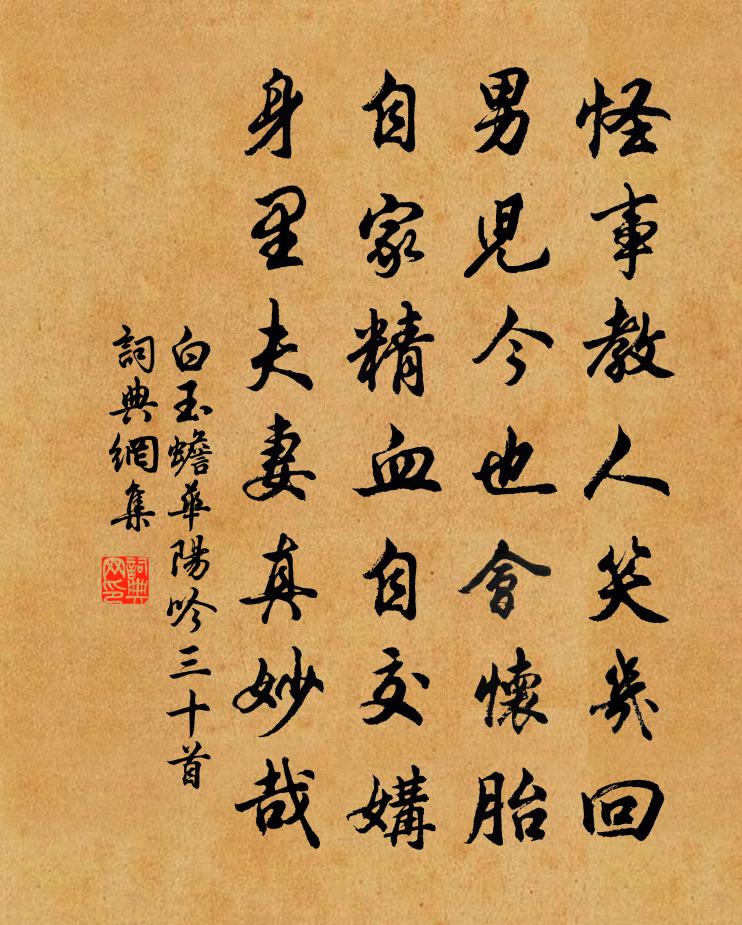詩詞名句歷史字典書法欣賞書法字典國語詞典說文解字康熙字典古漢語字典標 題 作 者 詩 句 華陽吟三十首作者:白玉蟾 朝代:宋代華陽吟三十首原文怪事教人笑幾回,男兒今也會懷胎。自家精血自交1/1媾,身里夫妻真妙哉。詩詞問答問:華陽吟三十首的作者是誰?答:白玉蟾問:華陽吟三十首寫於哪個朝代?答:宋代問:華陽吟三十首是什麼體裁?答:七絕白玉蟾華陽吟三十首書法欣賞華陽吟三十首書法作品詩詞推薦贈梁道人蘇軾〔宋代〕採藥壺公處處過,笑看金狄手摩挲。老人大父識君久,造物小兒如子何。寒盡山中無曆日,雨斜江上一漁蓑。神仙又六言二首劉克莊〔宋代〕有載書盟三友,無文章送五窮。怯懦寧出胯下,清狂羞入褌中。衰晚文同〔宋代〕衰晚得洋川,勞生只自憐。文移供盡日,心力付流年。咄咄空書字,便便聲晝眠。其如昏嫁在,了即賦歸田。積草嶺(同谷縣界)杜甫〔唐代〕連峰積長陰,白日遞隱見。颼颼林響交,慘慘石狀變。山分積草嶺,路異明水縣。旅泊吾道窮,衰年歲時倦。卜居和劉原甫十二月十日試墨梅堯臣〔宋代〕海神不朝雪不作,大梁塵土蔽天高。道傍牛喘復誰問,佛寺吹螺空唱嚎。相公跪香恬且佚,陛下減膳心焦勞。因君辨漆趙蕃〔宋代〕面上清如水,牽絲作鉤鉤。撥開鷹糞腳,打起有浮漚。夜遊顧夢日〔宋代〕路轉歌聲杳,夜深雲露濃。美人行月下,秋水泛芙蓉。頌證道歌證道歌釋印肅〔宋代〕絕學無為閒道人,不曾禮拜不看經。不動遍周塵剎海,卓爾孤身混白雲。次韻子瞻和淵明飲酒二十首蘇轍〔宋代〕修己以安人,嗟古有此道。平生妄謂得,忽忽恨衰老。年來亦見用,何益世枯槁。逡巡事朝謁,出入自媚好。報君十一月後庭梅花盛開蔡襄〔宋代〕迎臘梅花無數開,旋看飛片點青苔。幽香粉艷誰人見,時有山禽入樹來。上聲歌蕭衍〔南北朝〕花色過桃杏。名稱重金瓊。名歌非下里。含笑作上聲。馬大夫見示浙西王侍御贈答詩因命同作劉禹錫〔唐代〕憶逐羊車凡幾時,今來舊府統戎師。象筵照室會詞客,銅鼓臨軒舞海夷,百越酋豪稱故吏,十洲風景助新詩。秣陵捉月仙華岳〔宋代〕纜解西風拍岸顛,雁拖秋色上航船。掛帆未作乘風客,舉棹先驚捉月仙。楚些有淵心石殞,賀狂無井眼花眠。殷勤答劉琨詩二首 一盧諶〔魏晉〕隨寶產漢濱。摛此夜光真。不待卞和顯。自為命世珍。冬至之二日兄弟兒侄偕過西山道院歸而微雪虞儔〔宋代〕忽然薄暮暗江天,沖面涼風馬不前。五色書雲占昨日,六花瑞雪應明年。向來水旱民何罪,此去流移天盍憐。逗曉臨安邸中即事且謝誠齋惠詩十二首袁說友〔宋代〕男兒弧矢四方居,何以家為莫念渠。打撲精神希一遇,書來不必問何如。曾宏甫見過因問訊鞓紅花則雲已落矣驚呼之餘曾幾〔宋代〕南渡年來兩鬢霜,牡丹芍藥但他鄉。即從江水浮淮水,便上維揚向洛陽。牡丹羅隱〔唐代〕艷多煙重欲開難,紅蕊當心一抹檀。公子醉歸燈下見,美人朝插鏡中看。當庭始覺春風貴,帶雨方知國色寒。日晚蘇幕遮 乾坤卦象明道 以下有牆頭花十首乃曲王吉昌〔元代〕序乾坤,分賓主。匹配周天,甲己局分五。六十時歸五日聚。五六三十,六六依策補。離中己,坎藏戊。離坎 * 代秘書贈弘文館諸校書李商隱〔唐代〕清切曹司近玉除,比來秋興復何如。崇文館裡丹霜後,無限紅梨憶校書。名句推薦行人刁鬥風沙暗,公主琵琶幽怨多。李頎《古從軍行》 古人學問無遺力,少壯工夫老始成。陸游《冬夜讀書示子聿》 昨夜秋風入漢關,朔雲邊月滿西山。嚴武《軍城早秋》 涓涓不壅,終為江河佚名《孔子家語·觀周》 反古者未必可非,循禮者未足多是也。商鞅《商君書·更法》 卻道“天涼好個秋”!辛棄疾《醜奴兒·書博山道中壁》 秦時明月漢時關,萬里長征人未還。王昌齡《出塞二首·其一》 非懷北歸興,何用勝羈愁韓愈《洞庭湖阻風贈張十一署·時自陽山徙掾江陵》 天地玄黃,宇宙洪荒。周興嗣《千字文·全文》 殘雪樓台,遲日園林。韓疁《高陽台·除夜》