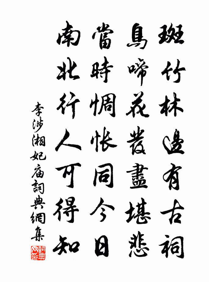 詩詞名句歷史字典書法欣賞書法字典國語詞典說文解字康熙字典古漢語字典標 題 作 者 詩 句 湘妃廟作者:李涉 朝代:唐代湘妃廟原文斑竹林邊有古祠,鳥啼花發盡堪悲。當時惆悵同今日,南北行人可得知。詩詞問答問:湘妃廟的作者是誰?答:李涉問:湘妃廟寫於哪個朝代?答:唐代問:湘妃廟是什麼體裁?答:七絕李涉湘妃廟書法欣賞湘妃廟書法作品注釋全唐詩:卷477-87詩詞推薦代邊將有懷劉長卿〔唐代〕少年辭魏闕,白首向沙場。瘦馬戀秋草,征人思故鄉。暮笳吹塞月,曉甲帶胡霜。自到雲中郡,於今百戰強。聞延平水沴陳宓〔宋代〕鸛鳴早合遷崖際,漁唱先教集岸隈。見說高樓如小舫,呼號聲雜怒濤豗。贈雁張鎡〔宋代〕我自江鄉有姓名,相逢契合義相親。連行幾宿來棲草,戢翼常時想避人。石岸風高難到縣,今宵船住定為鄰。南湖晉門愍帝周曇〔唐代〕耕牛吃盡大田荒,二兩黃金糴斗糧。御粥又聞無麴屑,不降胡虜奈飢腸。題孫谷橋墦間圖樓鑰〔宋代〕因知義利本殊途,莫笑墦間乞祭徒。正使往來多顯者,此中萬要著工夫。任氏園二詠舫齋王灼〔宋代〕平生江海志,煙雨一莎衣。掛帆恨不早,白首心事違。作齋跨幽塘,想像未覺非。時傾半樽綠,自釣尺鯉肥。蘆花祝英台/祝英台近黃人傑〔宋代〕異鄉中,行色里,隨分慶初度。老子今年,五十又還五。任他坎止流行,吳頭楚尾,本來是、乾坤逆旅。貴和富。仙萼池亭侍宴應制沈佺期〔唐代〕步輦尋丹嶂,行宮在翠微。川長看鳥滅,谷轉聽猿稀。天磴扶階迥,雲泉透戶飛。閒花開石竹,幽葉吐薔薇。徑狹病起和柳州劉司法贈詩韻項安世〔宋代〕平生偽學愧心休,此病何年可得瘳。杜渴惟應臥江漢,齊痁何罪姑尤。久之法掾師韓子,更向龍城問柳侯。能辨茯浣溪沙(再用韻)吳潛〔宋代〕海棠已綻牡丹芽,猶有東君向上花。不須惆悵怨春華。裝綴園林新景物,推敲風月舊情懷。也饒浪蕊與浮葩。送林朝奉陳師道〔宋代〕兩父論詩伯仲間,去思今識謝家安。曠懷亦苦中年別,歸翼仍愁行路難。四壁未堪風雨夕,百圍已試雪霜寒。欲逃龍湫瀑戴栩〔宋代〕石壁百尋高,噀空飛雪濤。鳥窺翻進退,龍住本雄豪。長嘯勢隨壯,細聽聲忽逃。沫霏侵佛像,境淨絕溪毛。峻頂渭川獵張鎡〔宋代〕鳴冬朔風聲披靡,原樹莽蒼枯死。出門四望來無人,何許翁閒守寒水,服中百萬總活法,閉口不言心自喜。姓名絕游峨眉馮時行〔宋代〕向來一紀登臨意,白髮頹齡才一至。阮哭窮途真可笑,孔小天下或如是。平生歷覽廓無礙,方稱老懷疏不緻。安能沂風亭劉仲堪〔宋代〕四楹倚岩壁,一徑臨煙塢。詵詵講習罷,濟濟生徒口。振衣嘉樹陰,浴德青江滸。舞詠自忘歸,何須在鄒魯。眼兒媚(寓城思歸竹庵留行賦呈)黎廷瑞〔宋代〕暖雲挾雨洗香埃。劃地峭寒催。燕兒知否,鶯兒知否,廝句春回。小樓日日重簾卷,應是把人猜。杏花如許,桃花舍北行飯陸游〔宋代〕飯飽逍遙信所之,芡塘蔬圃遍游嬉。梧楸凋落風高后,瓜瓠輪囷雨足時。犬喜人歸迎野路,鵲營巢穩占低枝。晚來水龍吟潘牥〔宋代〕上缺玉帶懸魚,黃金鑄印,侯封萬戶。待從頭,繳納君王,覓取愛卿歸去。善友陸銓寫真請贊釋正覺〔宋代〕野雲情態閒,秋山風骨瘦。真照也默默而靈,湛存也綿綿而壽。圓蒲曲木兮清白傳家,老鶴蒼松兮歲寒去就。山行衛宗武〔宋代〕亂擘晴綿清晝遲,陰陰古木綠雲齊。僧窗盡日無塵事,夢破一聲春鳥啼。名句推薦滯雨通宵又徹明,百憂如草雨中生。薛逢《長安夜雨》 四邊伐鼓雪海涌,三軍大呼陰山動。岑參《輪台歌奉送封大夫出師西征》 不覺碧山暮,秋雲暗幾重。李白《聽蜀僧濬彈琴 / 聽蜀僧浚彈琴》 山從人面起,雲傍馬頭生。李白《送友人入蜀》 屋漏在上,知之在下。姚察、姚思廉《梁書·本紀·卷三》 閏余成歲,律呂調陽。周興嗣《千字文·全文》 追亡事、今不見,但山川滿目淚沾衣辛棄疾《木蘭花慢·席上送張仲固帥興元》 誰念文園病客?夜色沉沉,獨抱一天岑寂。張埜《奪錦標·七夕》 無我原非你,從他不解伊。曹雪芹《紅樓夢·第二十二回》 何處飛來林間鵲,蹙踏松梢微雪。辛棄疾《賀新郎·把酒長亭說》
