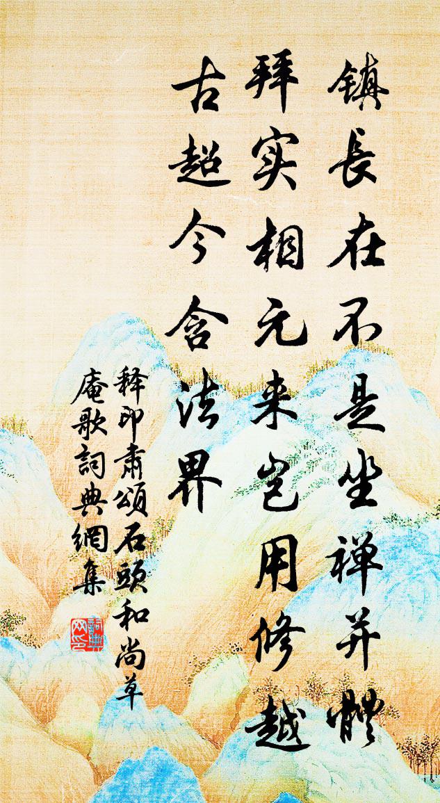 詩詞名句歷史字典書法欣賞書法字典國語詞典說文解字康熙字典古漢語字典標 題 作 者 詩 句 頌石頭和尚草庵歌作者:釋印肅 朝代:宋代頌石頭和尚草庵歌原文鎮長在,不是坐禪並體拜。實相元來豈用修,越古超今含法界。詩詞問答問:頌石頭和尚草庵歌的作者是誰?答:釋印肅問:頌石頭和尚草庵歌寫於哪個朝代?答:宋代釋印肅頌石頭和尚草庵歌書法欣賞頌石頭和尚草庵歌書法作品詩詞推薦如歸亭章侁〔宋代〕倚岸凌虛若冠鰲,湖光山色兩相高。驚波雜沓聞千騎,遠樹微茫見一毫。娃館已空人世隔,帝鄉何許客心勞。吳門初夏三首王鎡〔宋代〕牧笛無腔雨似煙,菜花成子日如年。人家火養春蠶快,要趁工夫下早田。有感二首劉克莊〔宋代〕桓司馬欲兵夫子,哥利王曾醜釋迦。血面何須九墜臂,忮心終不怨鏌鎁。臨江仙(楊子有德輔母夫人生日)魏了翁〔宋代〕尚憶去年稱壽日,彩衣猶帶天香。今年還見雁成行。兩頭娘子拜,笑領伯仁觴。知是幾年培植底,如今滿院芬芳。次韻趙寄庵陳著〔宋代〕家住黃沙綠水灣,功名土苴任天慳。顧瞻宇宙驚多礙,收卷江湖憩一閒。處子聲容心自鐵,太公年幾鬢才斑。老來奉同子瞻韻寄定國黃庭堅〔宋代〕風雲開古鏡,淮海熨冰紈。王孫醉短舞,羅襪步微瀾。老驥心雖在,白鷗盟已寒。斯人氣金玉,視世一鼠肝。南歸興慶池侍宴應制馬懷素〔唐代〕積水逶迤繞直城,含虛皎鏡有餘清。圖雲曲榭連緹幕,映日中塘間彩旌。賞洽猶聞簫管沸,歡留更睹木蘭輕。無勞避寇劉黻〔宋代〕戊午九月十,洶洶群寇生。疋枹與赤水,參會童石氓。烹牛飫凶豎,剚人諂妖靈。長驅無齟齬,四境騰沸羹。野廬句呂由庚〔宋代〕地下若逢中執法,為言今日再昇平。連雪不已復作絕句詠之及六而止殆未免不愁凍趙蕃〔宋代〕粲粲初投米,飄飄旋落花。巷深迷吠犬,林合誤歸鴉。鼷鼠操王令〔宋代〕鼷鼠鼷鼠,實食其牛,牛則不知。彼牛彼牛,既卜以郊,傷則免之。題臥屏十八花苣霜葛立方〔宋代〕密葉高叢傲歲寒,殷紅膩綠映江乾。沉香亭畔無訊息,賴有霜前秋牡丹。簫張祜〔唐代〕清籟遠愔愔,秦樓夜思深。碧空人已去,滄海鳳難尋。杳妙和雲絕,依微向水沉。還將九成意,高閣佇芳音。寄陳起予宗夏二首王邁〔宋代〕道有窮通時屈伸,夫君氣概豈長貧。帳前弟子知無幾,膝上郎君證可人。苜蓿盡多聊一笑,栗梨見覓莫渠嗔。平生景祐釋奠武成王六首佚名〔宋代〕維師尚父,四覆分封。靈神峻密,祀事寅恭。蕭薌祗薦,飈馭排空。如嵊如式,福祿來崇。女冠子·星冠霞帔牛嶠〔五代〕星冠霞帔,住在蕊珠宮裡,佩玎璫。明翠搖蟬翼,纖珪理宿妝。醮壇春草綠,藥院杏花香。青鳥傳心事,寄劉郎。讀晁錯傳許氏〔宋代〕匣劍未磨晁錯血,已聞刺客殺袁絲。到頭昧卻人心處,便是欺他天道時。痛矣一言偷害正,戮之萬段始為宜。鄧公送遷客周弼〔宋代〕自謂別離難會面,如何此地又相尋。往來雲物他鄉意,輕薄風塵久客心。夜雨泥塗三里郭,夕陽煙火數家林。送君次韻子瞻和淵明飲酒二十首蘇轍〔宋代〕尺書千里至,輟食手自開。將卜東南居,故鄉非所懷。勿言湖山美,永與平生乖。鴻雁秋南來,及春思故棲。蛟龍和陳及之孫應時〔宋代〕吾非斯人誰與群,覆手翻手知交情。天南海北有離合,此生此意無寒盟。名句推薦未成林,難望鳳來棲,聊醫俗。陸容《滿江紅·詠竹》 望廬思其人,入室想所歷。潘安《悼亡詩三首》 見人惡,即內省。有則改,無加警。李毓秀《弟子規·信》 從善如順流,去惡如探湯。房玄齡《晉書·列傳·第五十七章》 有鳥鷙立,羽翼張。柳宗元《唐鐃歌鼓吹曲十二首·其四》 遠信入門先有淚,妻驚女哭問何如。元稹《得樂天書》 雁足無書古塞幽。一程菸草一程愁。史達祖《鷓鴣天·衛縣道中有懷其人》 春未來時,酒攜不到千岩路。吳文英《點絳唇·越山見梅》 衣懶換,酒難賒。可憐此夕看梅花。吳文英《思佳客·癸卯除夜》 桂花香霧冷,梧葉西風影。高觀國《菩薩蠻·何須急管吹雲暝》