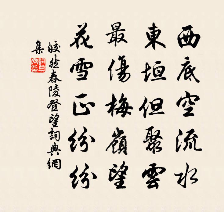 詩詞名句歷史字典書法欣賞書法字典國語詞典說文解字康熙字典古漢語字典標 題 作 者 詩 句 舂陵登望作者:皎然 朝代:唐代舂陵登望原文西底空流水,東垣但聚雲。最傷梅嶺望,花雪正紛紛。詩詞問答問:舂陵登望的作者是誰?答:皎然問:舂陵登望寫於哪個朝代?答:唐代問:舂陵登望是什麼體裁?答:五絕皎然舂陵登望書法欣賞舂陵登望書法作品注釋全唐詩:卷818-76詩詞推薦治圃雜書二十首方回〔宋代〕真山焉用假,山假意還真。巨石起奇士,幽蘭延故人。雲生如望岳,地僻不爭春。圖畫傳京洛,應多欲問津。代贈張耒〔宋代〕洞房飛香作春霧,仙人勸酒香中語。明眸第二紫雲娘,鶯學歌聲柳如舞。蹙眉長歌澧有蘭,銀鉤請君春草篇。繁弦如歸亭陶伯宗〔宋代〕吾家本住洞庭西,煙雨生涯接釣磯。今日吳江亭上望,水光山色卻如歸。游澱湖衛涇〔宋代〕疎星殘月尚朦朧,閒趁煙波一棹風。始覺舟移楊柳岸,直疑身到水晶宮。鳥鴉天際墨千點,白鷺灘頭玉一叢。欸乃緣識宋太宗〔宋代〕心緣身外境,法相本常存,若求無生理,先明取善根。賦女冠還俗孫惟信〔宋代〕疊卻霞綃上醮衣,女童髽髻綠楊垂。重調蛾黛為眉淺,再試弓鞋與步遲。紫府煙花鶯喚醒,仙房雲雨鶴通知。簾低長安夜懷李頻〔唐代〕匹馬西遊日,從吳又轉荊。風雷幾夜坐,山水半年行。夢永秋燈滅,吟余曉露明。良時不我與,白髮向秦生。謝高茶使遣餉頭貢余趙汝騰〔宋代〕東風吹折鳳山芽,驛獻花箱仗使家。遙想仙芳供御盌,應憐味諫落天涯。厥包錫貢何年始,其苦如飴信地嘉。齋祭人日林滋〔唐代〕春輝新入碧煙開,芳院初將穆景來。共向花前圖瑞勝,試看池上動輕苔。林香半落沾羅幌。蕙色微含近酒杯。聞道次韻程弟方岳〔宋代〕此腹寧須文字香,漫淹虀瓮半青黃。午窗一枕齁齁睡,世上何人最得忙。洛下女郎歌(白衣人)佚名〔唐代〕絳衣披拂露盈盈,淡染胭脂一朵輕。自恨紅顏留不住,莫怨春風道薄情。好事近(代人書扇)楊冠卿〔宋代〕晚起倦梳妝,斜壓翠鬟雲鬢。手捻花枝輒笑,問青鸞音信。繡簾慵卷玉鉤垂,風篁奏餘韻。燈火黃昏院落,報雕鞍次韻楊光父見贈晁公溯〔宋代〕為善惟不足,務德莫如滋。古人行此道,名與星斗垂。是邦禿鬢翁,實乃古醜夷。區區豈雲難,長者能折枝。上尋奉和九月九日登慈恩寺浮圖應制張錫〔唐代〕九秋霜景淨,千門曉望通。仙遊光御路,瑞塔迥凌空。菊彩揚堯日,萸香繞舜風。天文麗辰象,竊抃仰層穹。再和答為之黃庭堅〔宋代〕林君維閩英,數面成瓜葛。鄰居接杖藜,過飯厭疏糲。讀書飽工夫,論事極精核。奮身君子場,勇若怒未泄。窮年無策戴復古〔宋代〕老覺登樓懶,心知涉世疏。夢蕉還得鹿,緣木可求魚。晚歲未聞道,平生欠讀書。行藏兩無策,究竟果何如。次韻劉原甫社後對雪梅堯臣〔宋代〕社日遇群飲,北風歸馬驕。陽烏雲斗晦,來燕翅難調。朝霰侵花冷,春陰到地消。宿酲無酒解,薄被覺寒饒。爐炭句葉延壽〔宋代〕自昔吾泉出異僧,清溪今又兩岩興。夜遊宮周邦彥〔宋代〕一陣斜風橫雨。薄衣潤、新添金縷。不謝鉛華更清素。倚筠窗,弄么弦,嬌欲語。小閣橫香霧。正年少、小娥愁緒舟次赤壁羅與之〔宋代〕呈王峴畔泛川流,赤壁磯頭半日游。勝地空餘豪傑跡,扁舟不載古今愁。極知風景終無異,莫念天時逝不留。傷事名句推薦嬌艷輕盈香雪膩,細雨黃鶯雙起。張泌《滿宮花·花正芳》 微雨靄芳原,春鳩鳴何處。韋應物《東郊》 春思遠,誰嘆賞、國香風味。周密《繡鸞鳳花犯·賦水仙》 年年郡縣送征人,將與遼東作丘坂。王建《遼東行》 梨花院落溶溶月,柳絮池塘淡淡風。晏殊《無題·油壁香車不再逢》 朔風吹雪透刀瘢,飲馬長城窟更寒。盧汝弼《和李秀才邊庭四時怨·其四》 洞庭一夜無窮雁,不待天明盡北飛。李益《春夜聞笛》 賢者以其昭昭,使人昭昭;今以其昏昏,使人昭昭。孟子《孟子·盡心章句下·第二十節》 明日復明日,明日何其多。錢福《明日歌》 斷腸何必更殘陽,極目傷平楚。廖世美《燭影搖紅·題安陸浮雲樓》