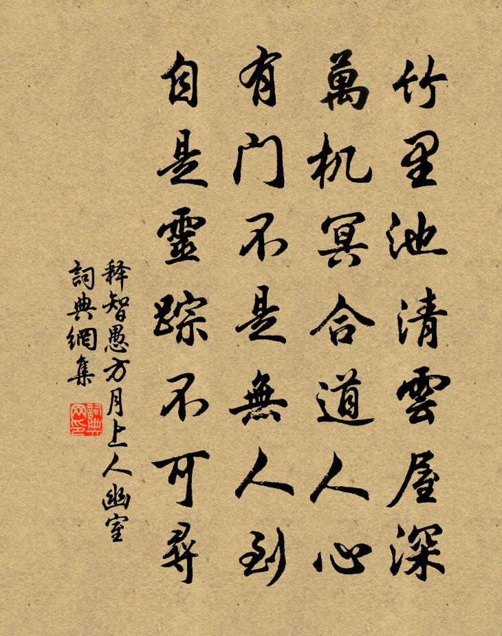 詩詞名句歷史字典書法欣賞書法字典國語詞典說文解字康熙字典古漢語字典標 題 作 者 詩 句 方月上人幽室作者:釋智愚 朝代:宋代方月上人幽室原文竹里池清雲屋深,萬機冥合道人心。有門不是無人到,自是靈蹤不可尋。詩詞問答問:方月上人幽室的作者是誰?答:釋智愚問:方月上人幽室寫於哪個朝代?答:宋代釋智愚方月上人幽室書法欣賞方月上人幽室書法作品詩詞推薦句司馬光〔宋代〕不肯那錢買珠翠,任教堆插階前菊戲留友人把酒鄧深〔宋代〕柳還飛絮春餘幾,幸有清樽可共持。今我未眠卿莫去,古人皆飲子休辭。鷺楊公遠〔宋代〕飄然片雪下晴空,終日盤旋淺瀨中。行近鷗鳧風致別,立依蒲蓼畫圖同。數莖絲髮心何慮,一世魚餐體不豐。歷遍守閘書事時已退居五首曹勛〔宋代〕野情漫對三眠柳,幽思空懷九畹蘭。他日倘從春步約,湖邊一笑似非難。何逢原寄和章再和前韻何夢桂〔宋代〕日暮歸來彈鋏歌,詩筒何處又相過。人生百歲樂時少,春色三分塵土多。愧乏丹砂修渾沌,且拚樽酒醉夢無。莫向蘿衣洞何澹〔宋代〕蘿衣晴帶護煙蓑,楚國狂夫尚作歌。石影到溪千丈勁,藤痕入目八分少。泉分小白山中雨,衣取雲門寺頂荷。洞口懷天台進禪師錢惟演〔宋代〕默坐理情條,虛齋息眾囂。寰區指稊米,身世諭芭蕉。雨任階生蘚,風嫌樹有瓢。惟思白蓮社,他日許相招。胡邦衡生日以詩送北苑八銙日注二瓶周必大〔宋代〕賀客稱觴滿冠霞,懸知酒渴正思茶。尚書八餅分閩焙,主簿雙瓶揀越芽。妙手合調金鼎鉉,清風穩到玉皇家。明年中秋對月懷寄鳳凰山鄧道人文同〔宋代〕有客千岩萬壑中,綠毛丹臉紫方瞳。不知今夜西樓月,幾處飛仙下碧空。菩薩蠻(侄壽伯)王紹〔宋代〕天正朔旦開新曆。吾家伯父長生日。蘭玉傍庭階。稱觴特地來。後年逢七十。今歲瞻南極。南極壽星宮。分明矍鑠論語絕句一百首張九成〔宋代〕游遍諸侯志不伸,困窮幾與死為鄰。大哉博學稱夫子,獨有當時 * 人。東京賦張衡〔兩漢〕安處先生於是似不能言,憮然有間,乃莞爾而笑曰:“若客所謂,末學膚受,貴耳而賤目者也!苟有胸而無心,不桐花白居易〔唐代〕春令有常候,清明桐始發。何此巴峽中,桐花開十月?豈伊物理變?信是土宜別。地氣反寒暄,天時倒生殺。草木遊學射山遇景道人陸游〔宋代〕肩輿適青郊,飛屐登翠麓。余霜未泫瓦,晨日初掛木。推門覓黃冠,避客似奔鹿。雖無與晤語,清坐意亦足。豈知句徐似道〔宋代〕那堪富有千頭橘,便可稱為四老人。五十文同〔宋代〕生平曾不事悠悠,倏忽年華五十秋。宦意文情俱淡泊,可憐渾似李蒙州。頌十玄談心印釋印肅〔宋代〕將喻紅爐火裹蓮,精金百煅轉光鮮。居塵不染隨宜用,始覺松風解說禪。過襄陽李復〔宋代〕表里山川舊楚畿,築關乘險事皆非。槎頭魚盡無新語,峴首人亡失隱扉。雲外煮茶僧室靜,江邊酤酒客帆歸。我來偈頌六十七首釋原妙〔宋代〕大海無魚,大地無草。大富無糧,大悟無道。宮詞楊皇后〔宋代〕缺月流光入綺疏,金壺傅箭夢回初。秦台彩鳳無訊息,桂影空閒十二除。名句推薦見碧水丹山,黃蘆苦竹。宋江《滿江紅·喜遇重陽》 有情芍藥含春淚,無力薔薇臥曉枝。秦觀《春日》 鏡水夜來秋月,如雪。溫庭筠《荷葉杯·鏡水夜來秋月》 更無柳絮因風起,惟有葵花向日傾。司馬光《客中初夏》 至今窺牧馬,不敢過臨洮。西鄙人《哥舒歌》 鳳簫聲斷月明中,舉手謝、時人慾去。蘇軾《鵲橋仙·七夕送陳令舉》 桃花落,閒池閣。山盟雖在,錦書難托。陸游《釵頭鳳·紅酥手》 一騎紅塵妃子笑,無人知是荔枝來。杜牧《過華清宮絕句三首》 以小人之慮,度君子之心。劉義慶《世說新語·雅量》 萬頃風濤不記蘇。雪晴江上麥千車。蘇軾《浣溪沙·萬頃風濤不記蘇》